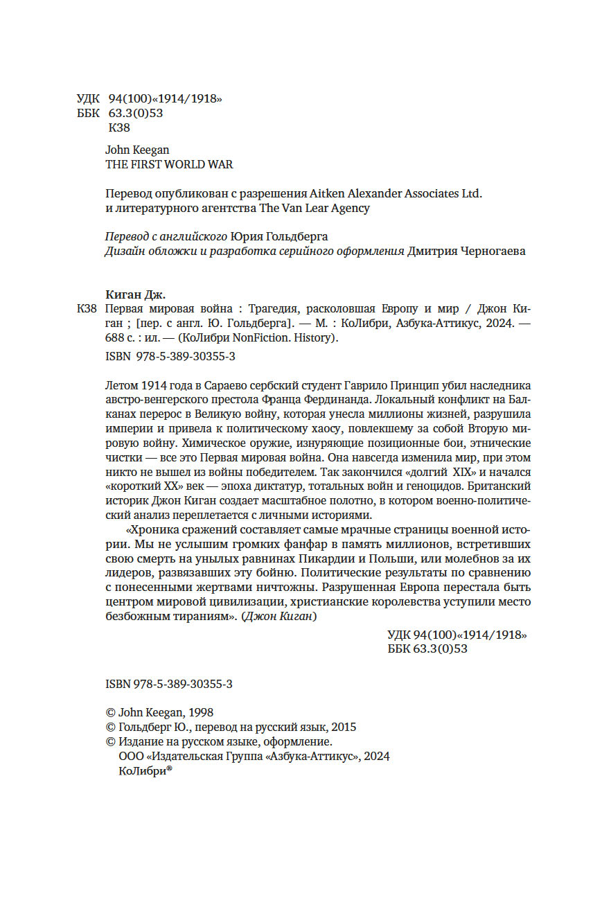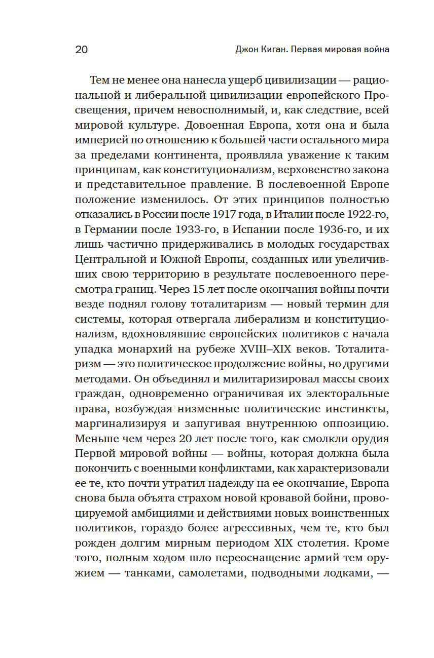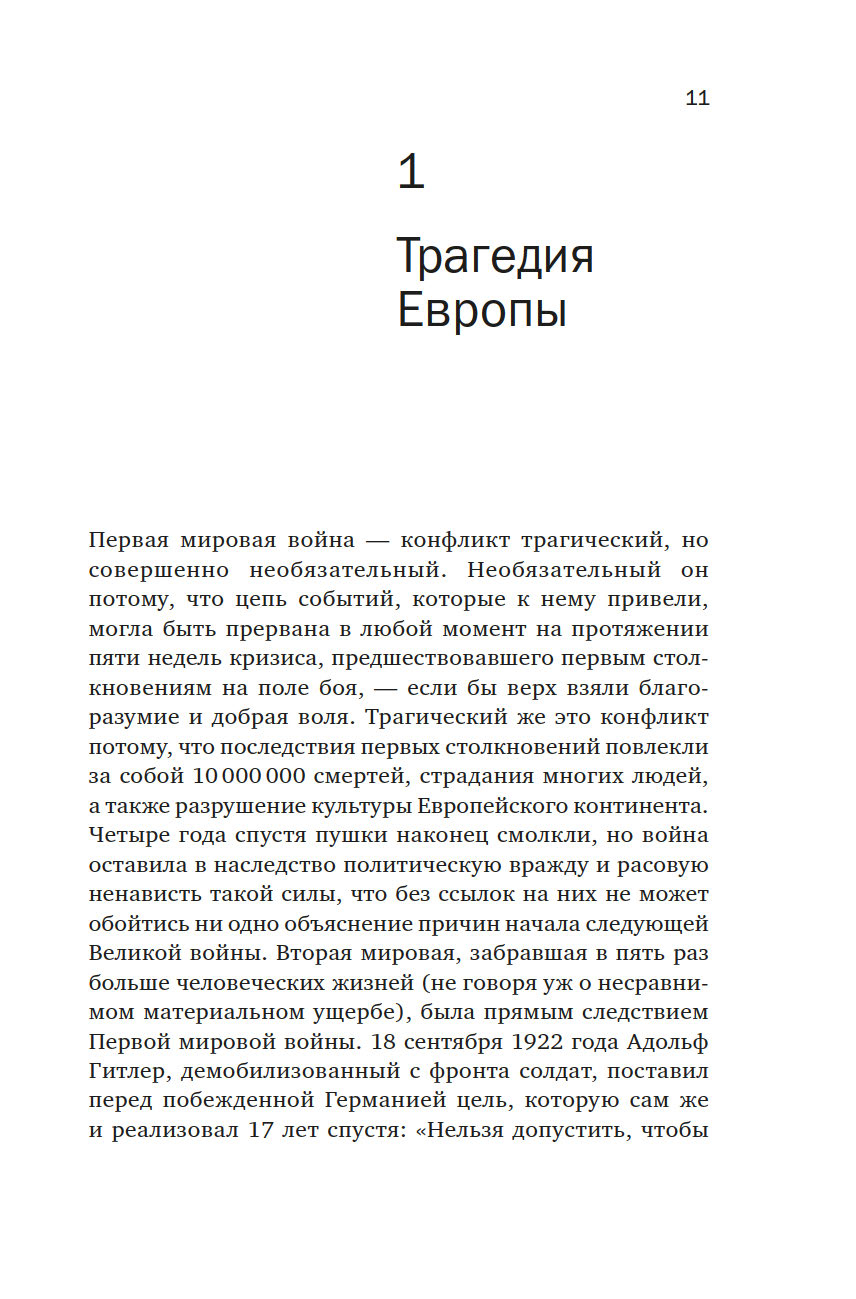 Летом 1914 года в Сараево сербский студент Гаврило Принцип убил наследника австро-венгерского престола Франца Фердинанда. Локальный конфликт на Балканах перерос в Великую войну, которая унесла миллионы жизней, разрушила империи и привела к политическому хаосу, повлекшему за собой Вторую мировую войну. Химическое оружие, изнуряющие позиционные бои, этнические чистки – все это Первая мировая война. Она навсегда изменила мир, при этом никто не вышел из войны победителем. Так закончился "долгий XIX" и начался "короткий ХХ" век – эпоха диктатур, тотальных войн и геноцидов. Британский историк Джон Киган создает масштабное полотно, в котором военно-политический анализ переплетается с личными историями.