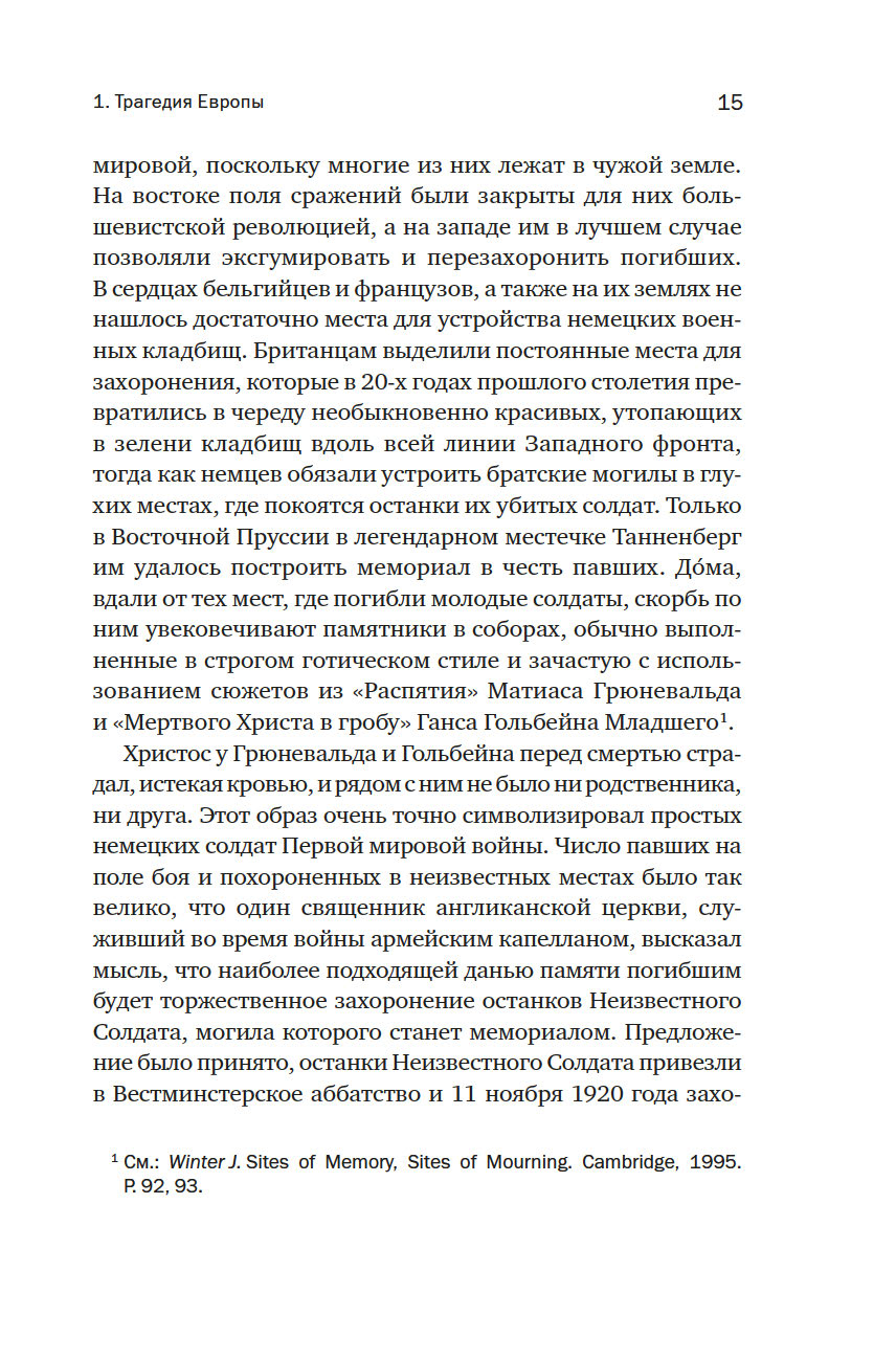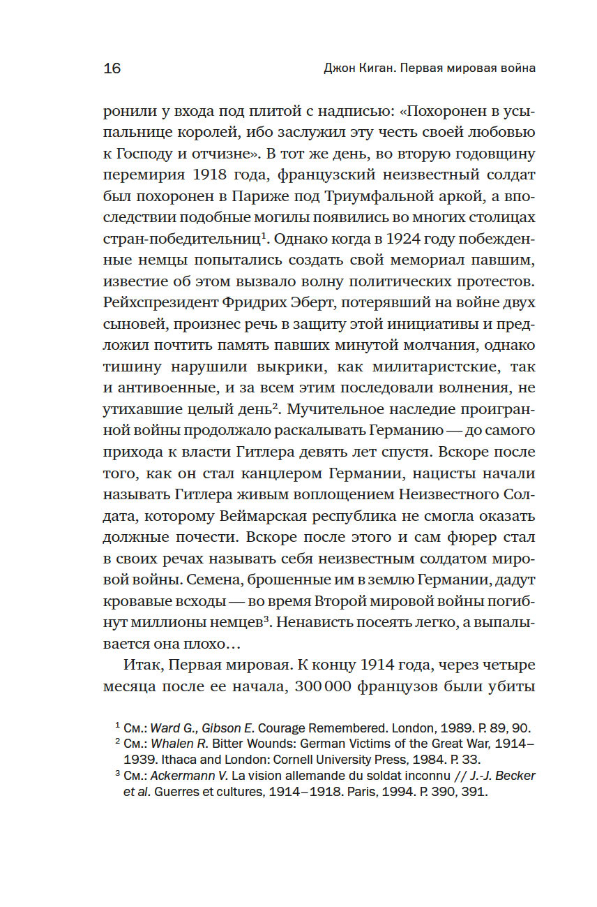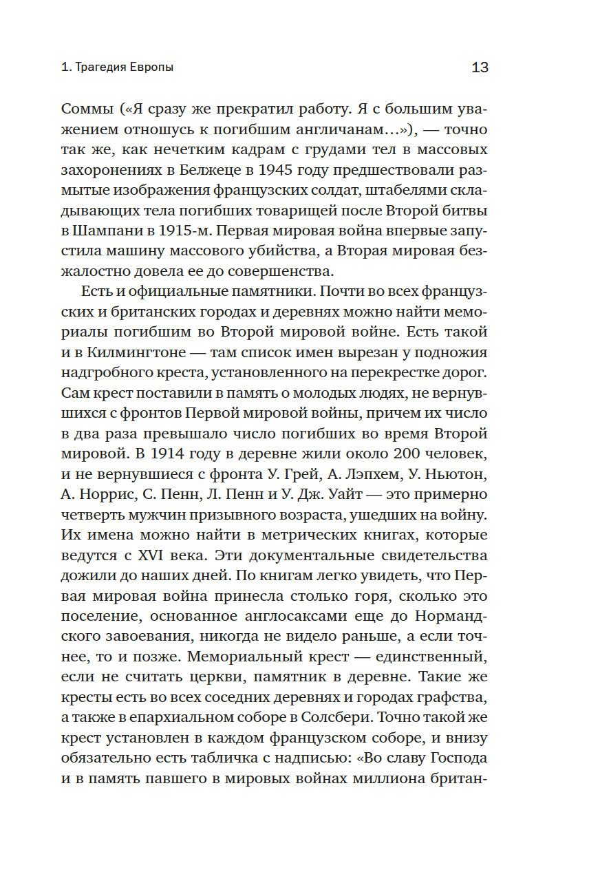 "Хроника сражений составляет самые мрачные страницы военной истории. Мы не услышим громких фанфар в память миллионов, встретивших свою смерть на унылых равнинах Пикардии и Польши, или молебнов за их лидеров, развязавших эту бойню. Политические результаты по сравнению с понесенными жертвами ничтожны. Разрушенная Европа перестала быть центром мировой цивилизации, христианские королевства уступили место безбожным тираниям". (Джон Киган)