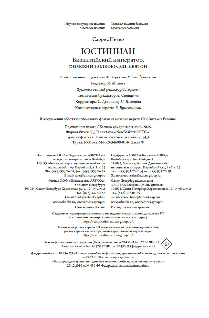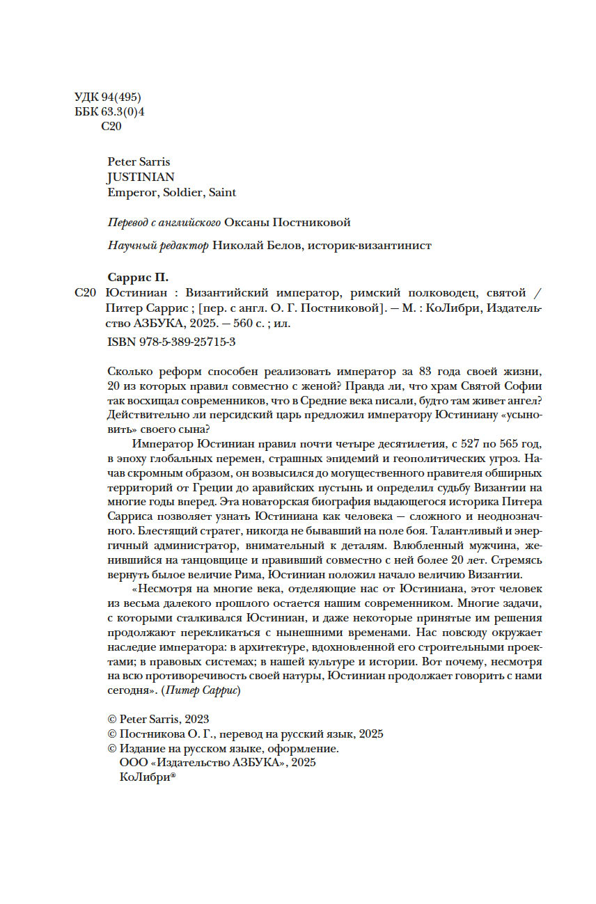 Император Юстиниан правил почти четыре десятилетия, с 527 по 565 год, в эпоху глобальных перемен, страшных эпидемий и геополитических угроз. Начав скромным образом, он возвысился до могущественного правителя обширных территорий от Греции до аравийских пустынь и определил судьбу Византии на многие годы вперед. Эта новаторская биография выдающегося историка Питера Сарриса позволяет узнать Юстиниана как человека – сложного и неоднозначного. Блестящий стратег, никогда не бывавший на поле боя. Талантливый и энергичный администратор, внимательный к деталям. Влюбленный мужчина, женившийся на танцовщице и правивший совместно с ней более 20 лет. Стремясь вернуть былое величие Рима, Юстиниан положил начало величию Византии.
