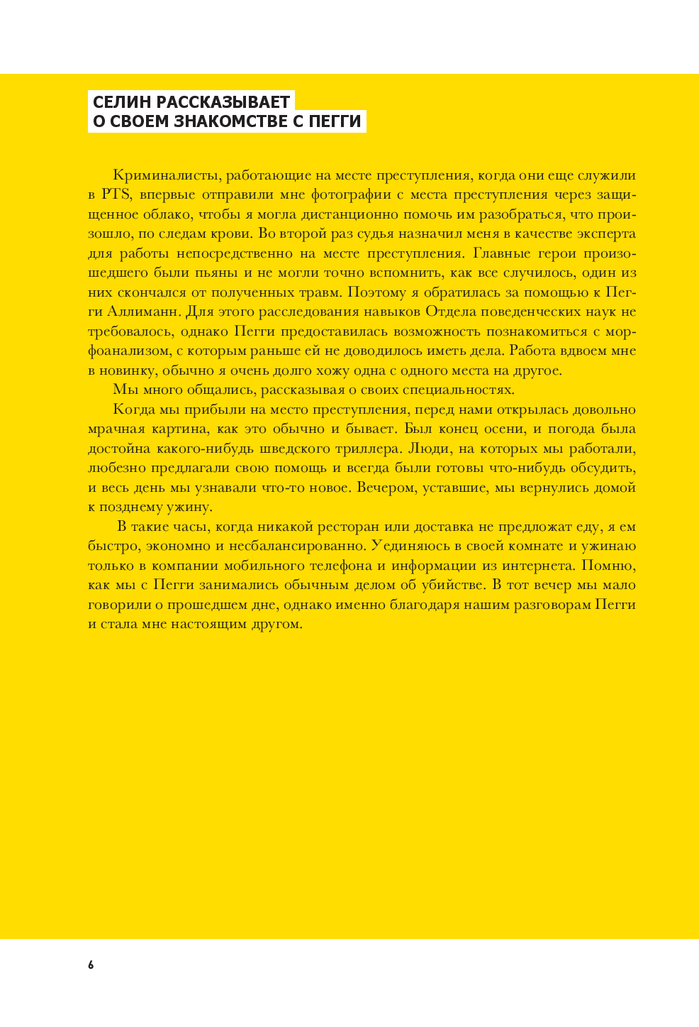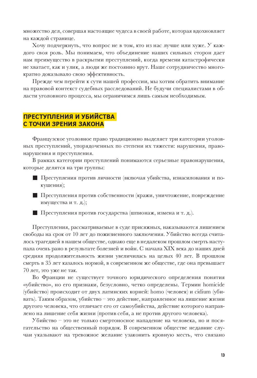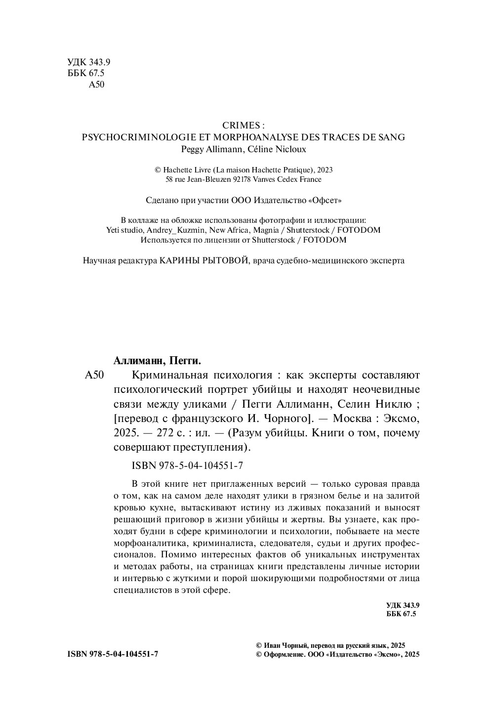 В этой книге нет приглаженных версий – только суровая правда о том, как на самом деле находят улики в грязном белье и на залитой кровью кухне, вытаскивают истину из лживых показаний и выносят решающий приговор в жизни убийцы и жертвы. Вы узнаете, как проходят будни в сфере криминологии и психологии, побываете на месте морфоаналитика, криминалиста, следователя, судьи и других профессионалов. Помимо интересных фактов об уникальных инструментах и методах работы, на страницах книги представлены личные истории и интервью с жуткими и порой шокирующими подробностями от лица специалистов в этой сфере.