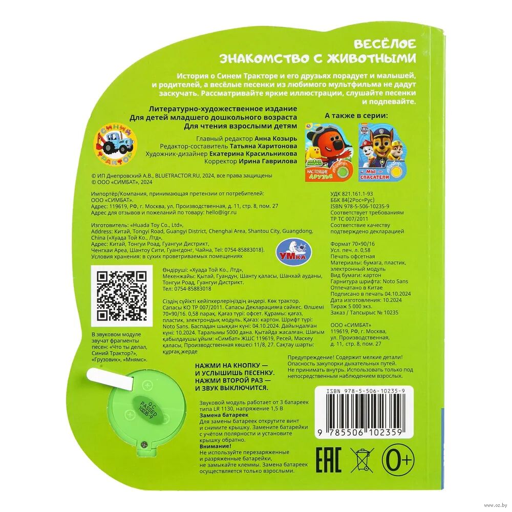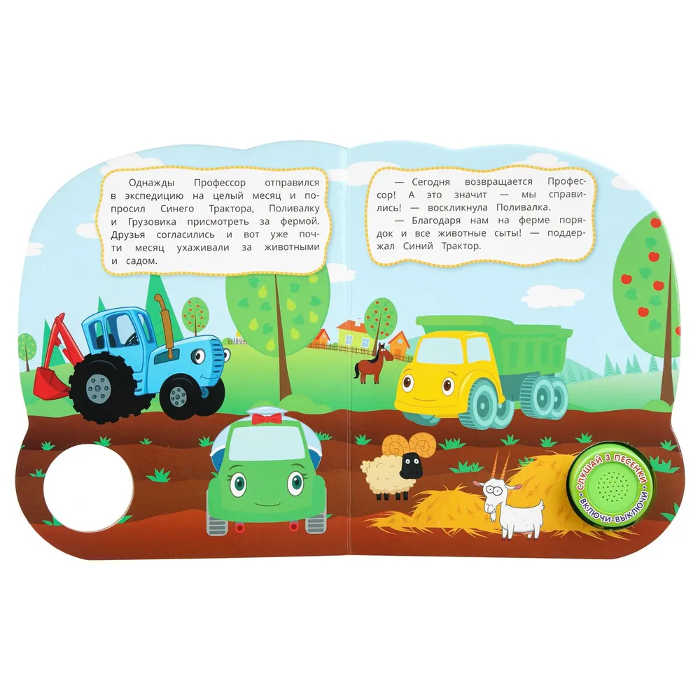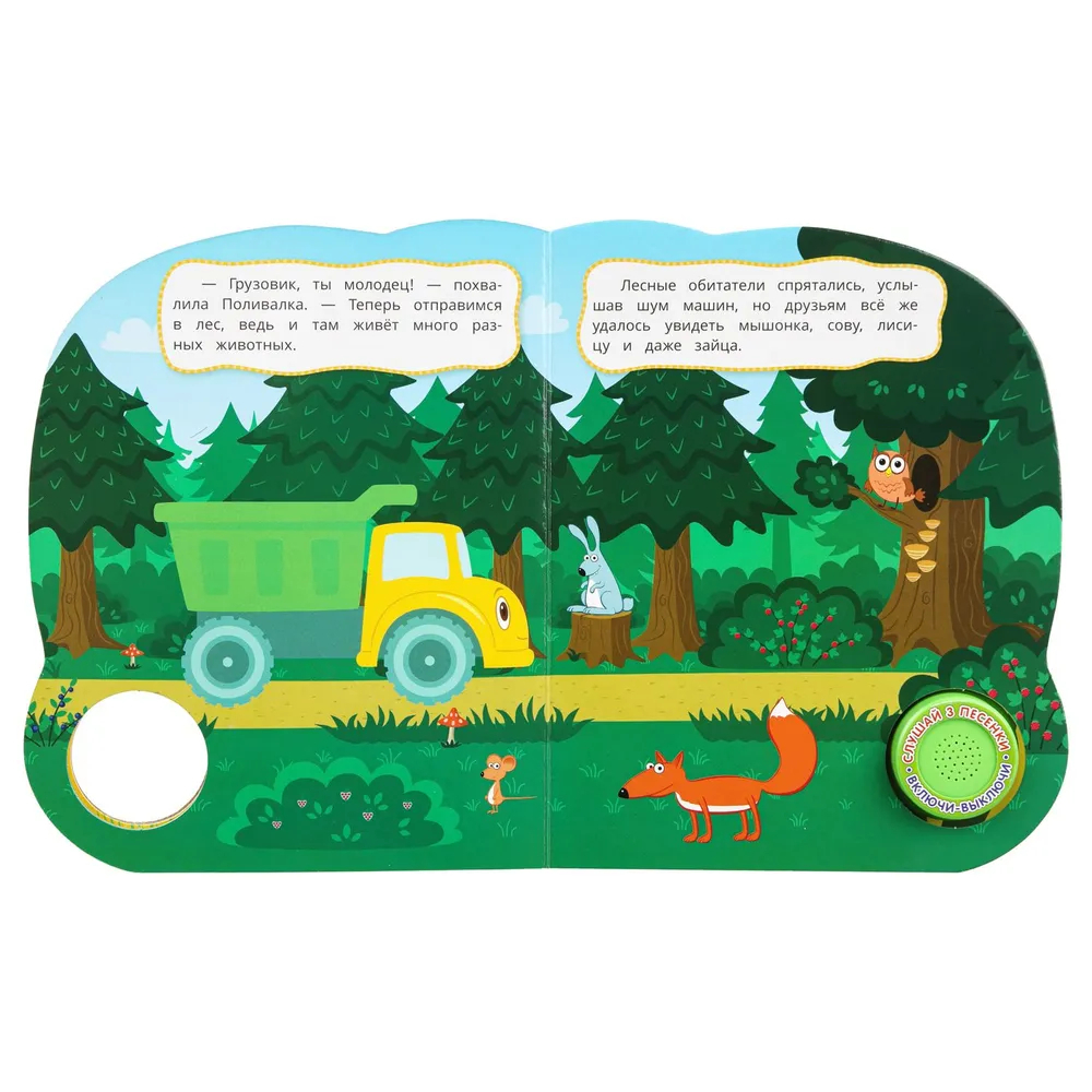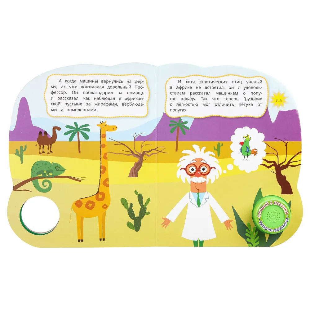 Ребёнок с удовольствием будет листать плотные страницы, рассматривать яркие картинки с забавными животными и , конечно, нажимать на кнопку и слушать весёлые песенки. Малыш легко освоит включение звука: по нажатию на кнопку песенка включится, при втором нажатии выключится, при третьем – заиграет следующая композиция. Интересный дизайн обложки с блестящими глазками сделает игру с книгой ещё более занимательной. Благодаря компактному размеру книгу удобно взять с собой в дорогу.