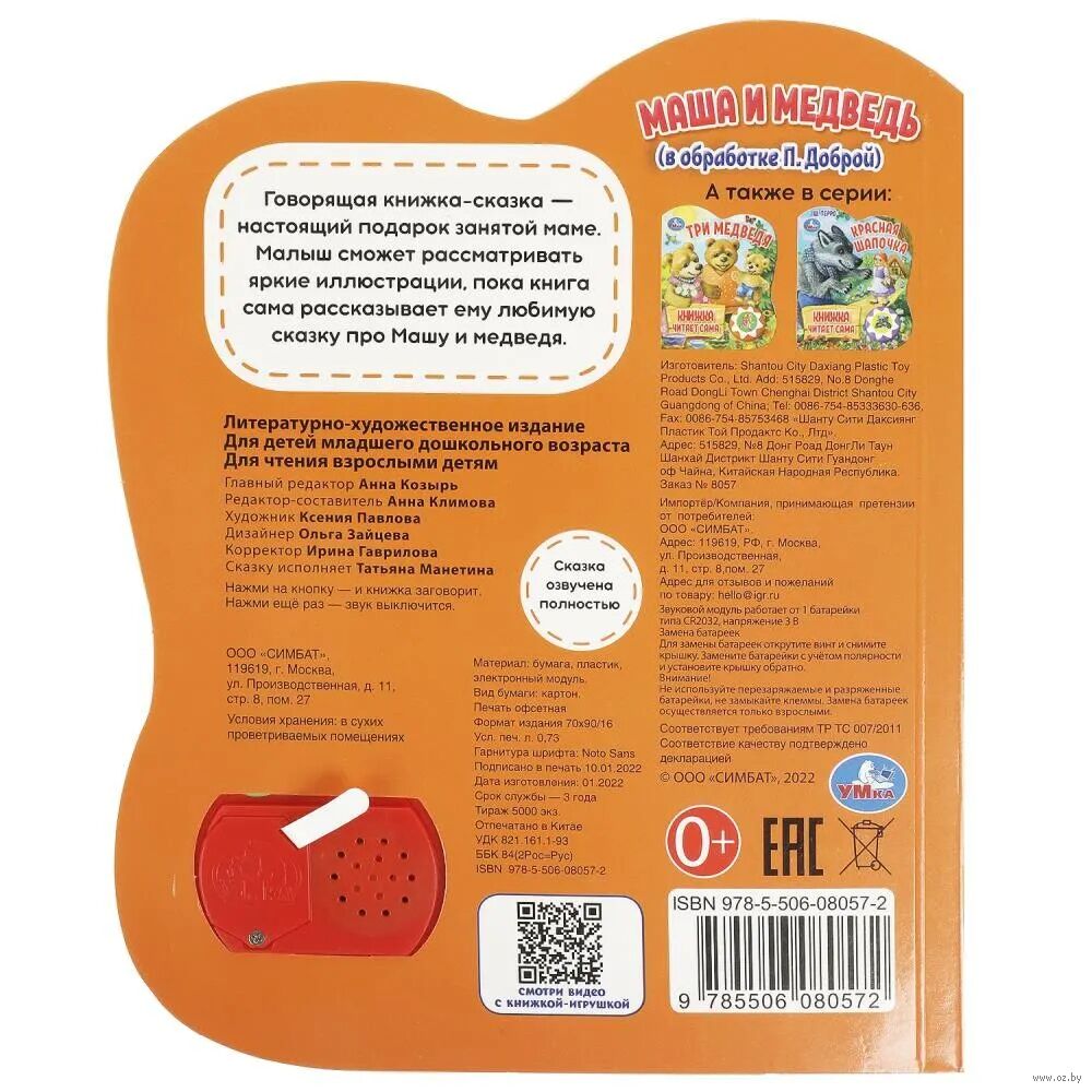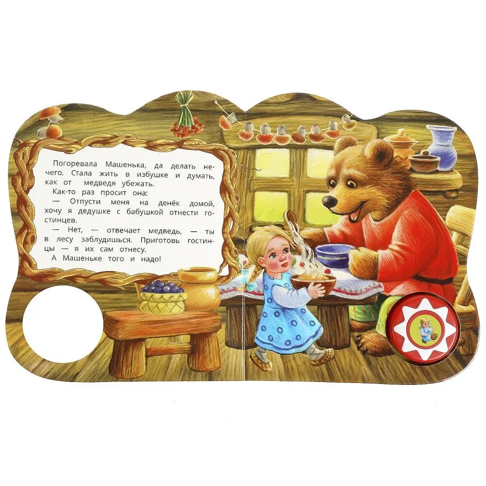 Малыш будет с удовольствием рассматривать яркие картинки, нажимать на кнопку и слушать любимую сказку – маме даже не придется ее читать, книга сделает это сама! Книжка сделана из плотного картона, поэтому родители могут не опасаться, что ребенок порвет странички. Благодаря компактному формату книгу удобно брать с собой в путешествие.