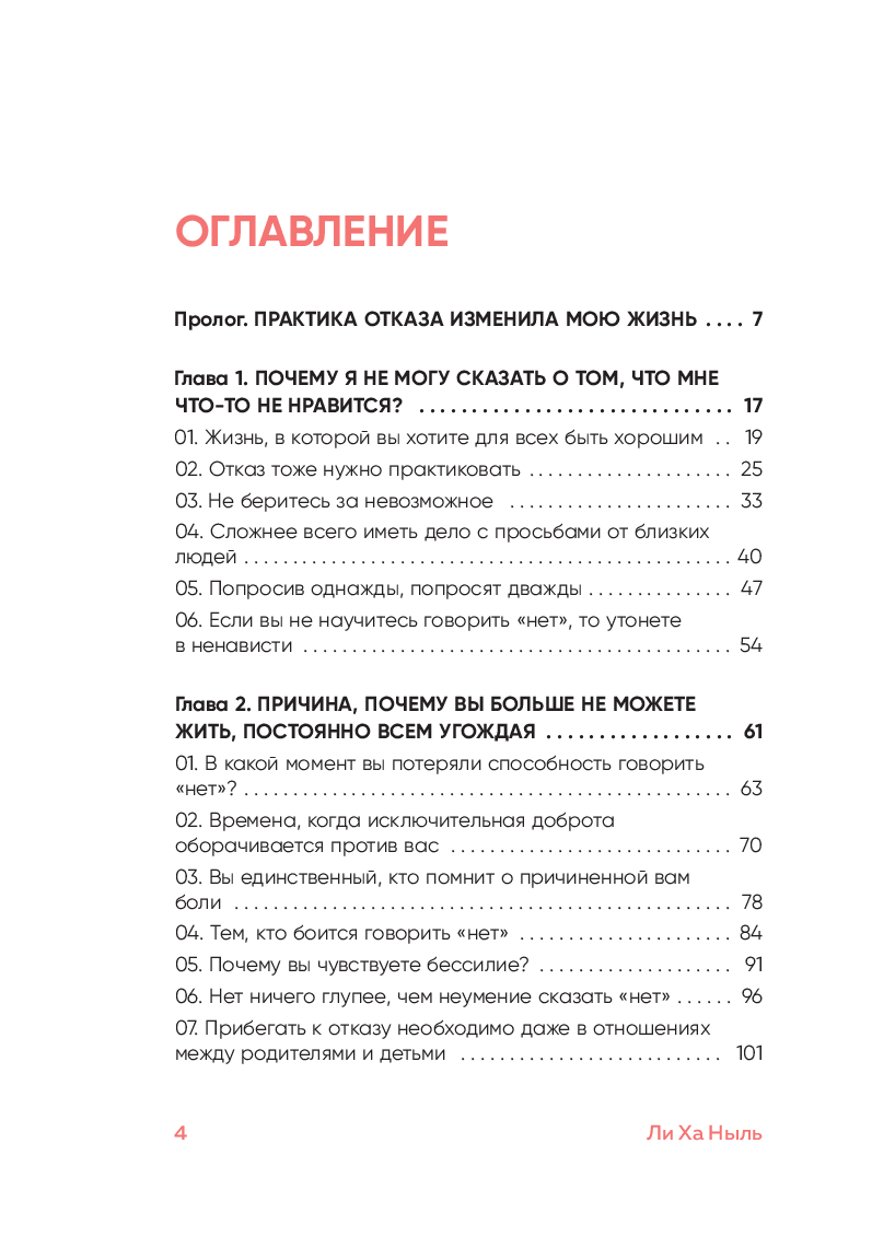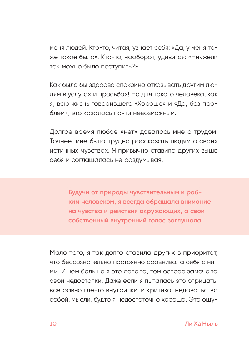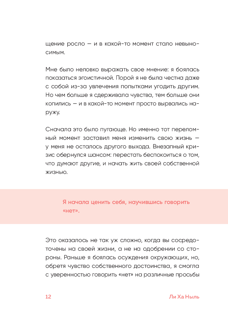 В этой книге психотерапевт Ли Ха Ныль рассказывает, как безотказность и желание быть для всех удобной довели ее до тревоги и депрессии. Чтобы выйти из этого состояния, она сосредоточилась на самоанализе и обнаружила, что первый ключ к счастливой жизни – искусство говорить "нет". Советы, которые дает Ха Ныль, помогут всем, кто испытывает трудности в отношениях и хочет вновь обрести потерянное самоуважение.