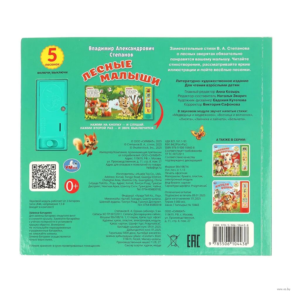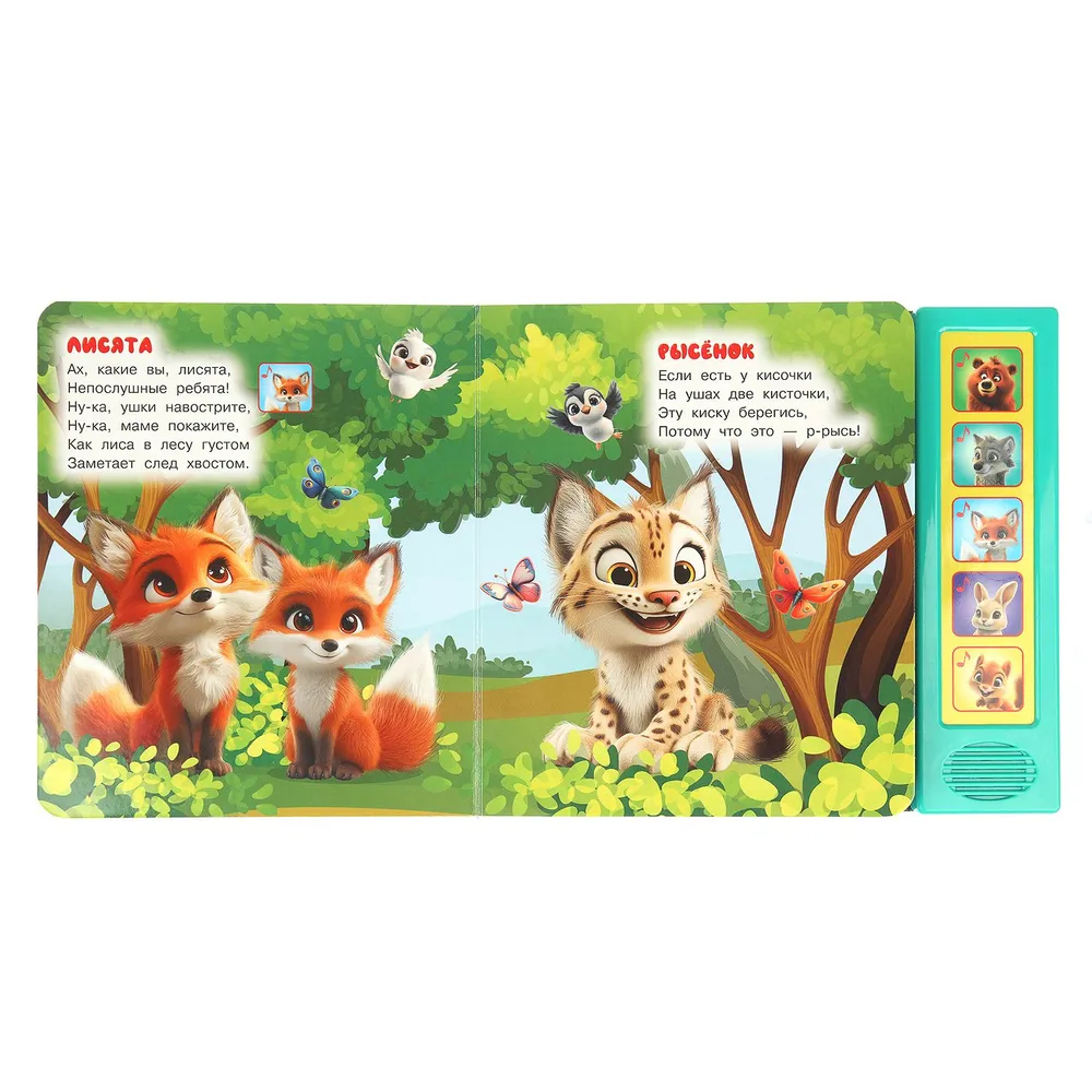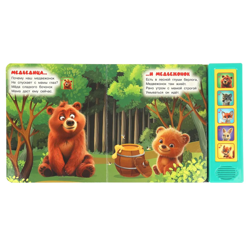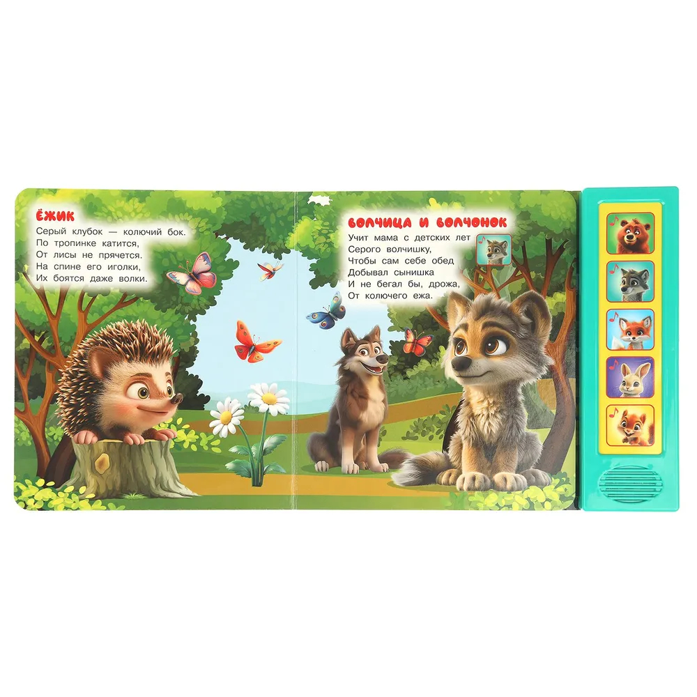 Красочная музыкальная книга познакомит малыша с лесными зверятами. Напетые стихи сделают чтение ещё более увлекательным. Ребёнок легко освоит включение звука: по нажатию на кнопку звук включится, при втором нажатии выключится. Книжка сделана из плотного картона, поэтому родители могут не опасаться за её сохранность. Благодаря компактному формату её удобно брать с собой.