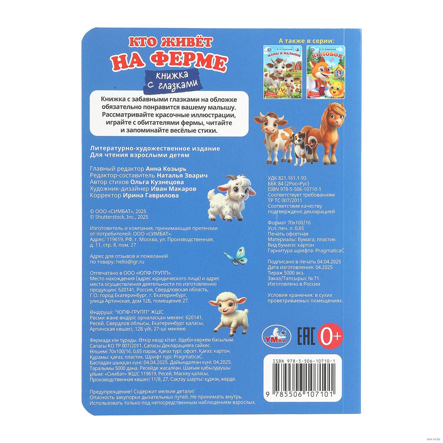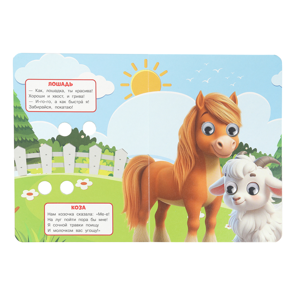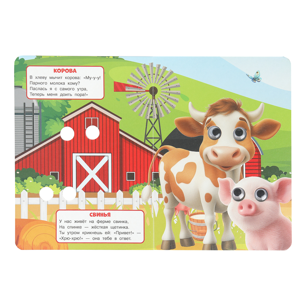 На страницах этой яркой книги ребёнка ждёт встреча с милыми обитателями фермы. Короткие тексты о них сопровождаются большими красочными картинками с подвижными глазками, благодаря которым персонажи сказки выглядят совсем как живые. Компактный размер книги позволяет взять её с собой в путешествие.