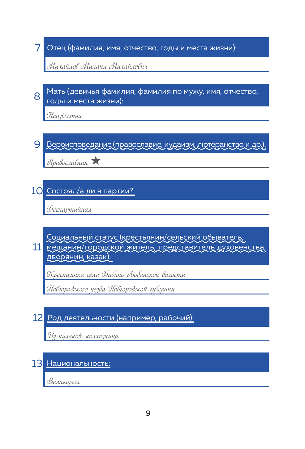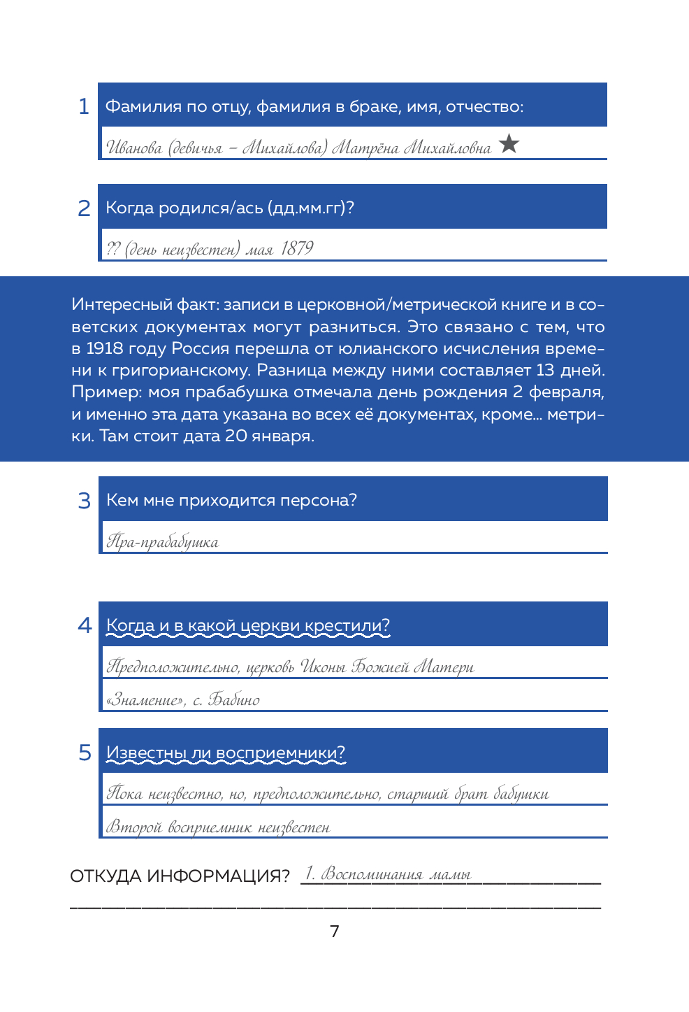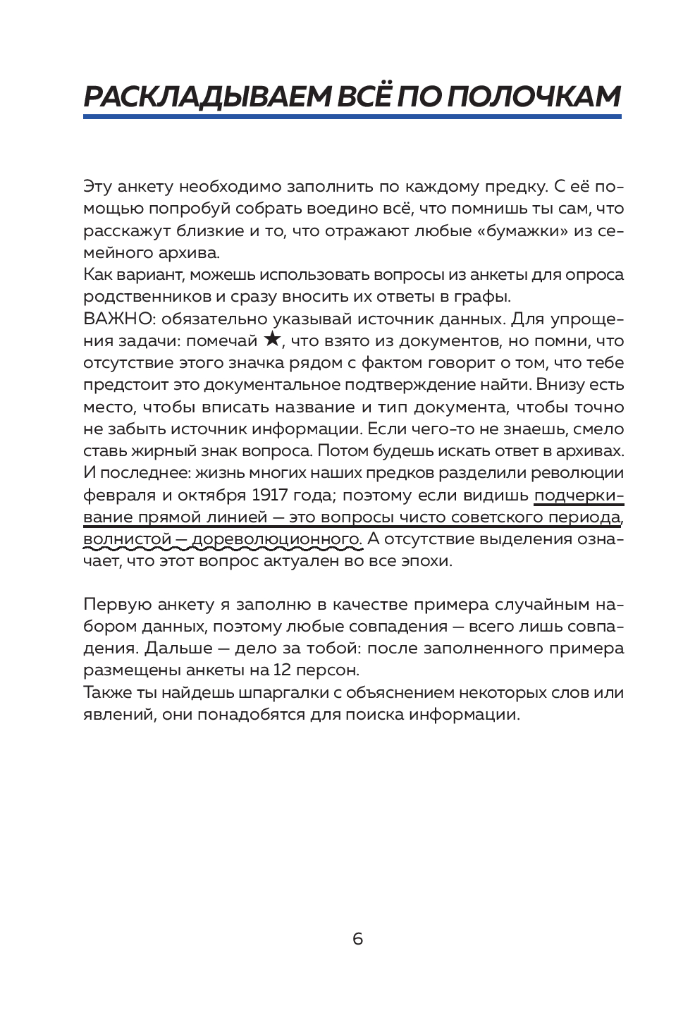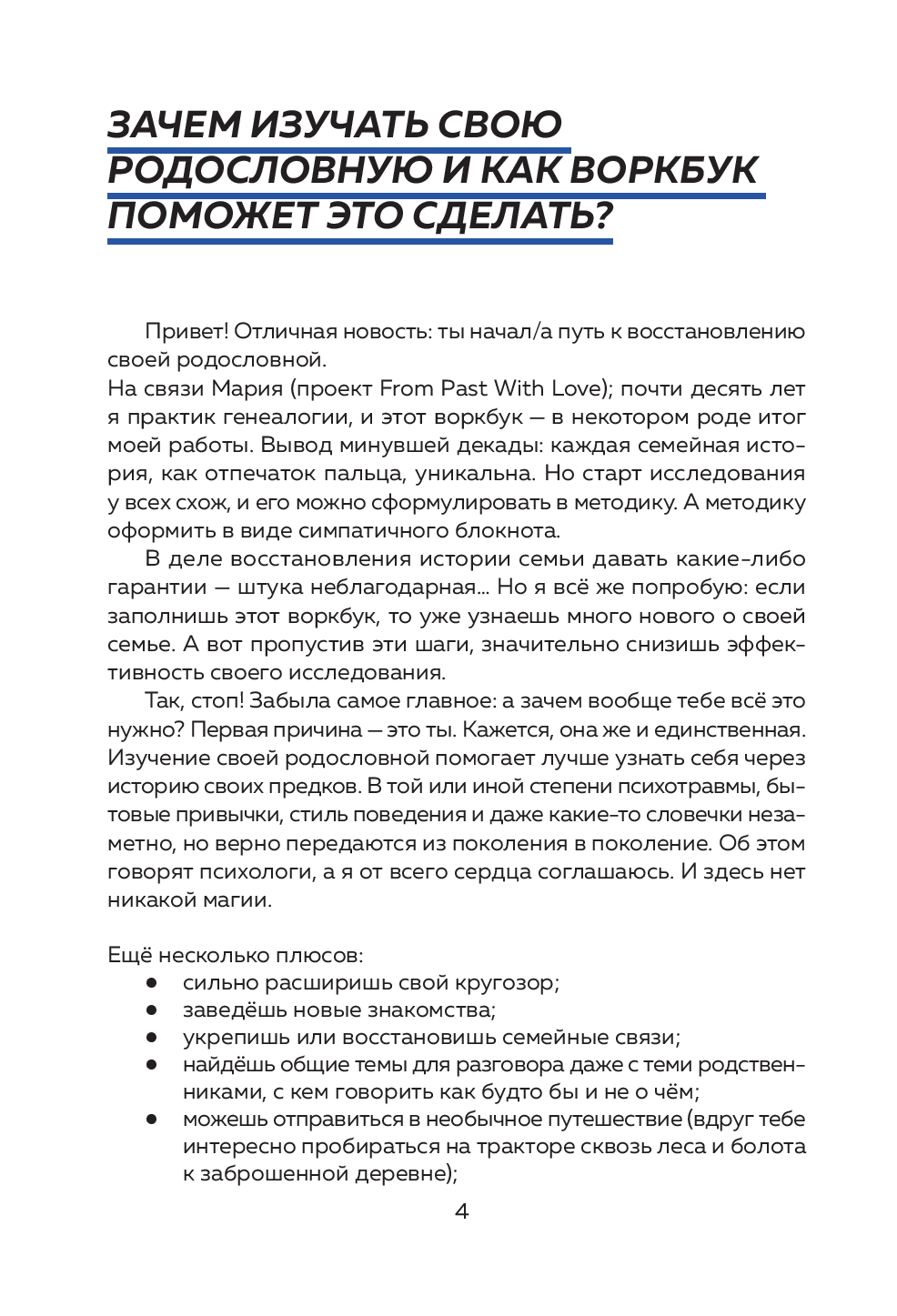 Мария Тычинина, генеалог с 10-летним опытом и автор проекта From Past With Love, создала этот пошаговый гид для всех, кто хочет сохранить связь с родом и гордо нести ее в будущее. С ним ты разгадаешь увлекательный детектив в виде прошлого своей семьи, сохранишь ценные данные и откроешь удивительные факты о своих предках. В процессе ты узнаешь, откуда в тебе эта стойкость – возможно, от прабабушки, пережившей войну, или почему в семье так ценят образование – а вдруг твой прадед был первым грамотным в деревне?