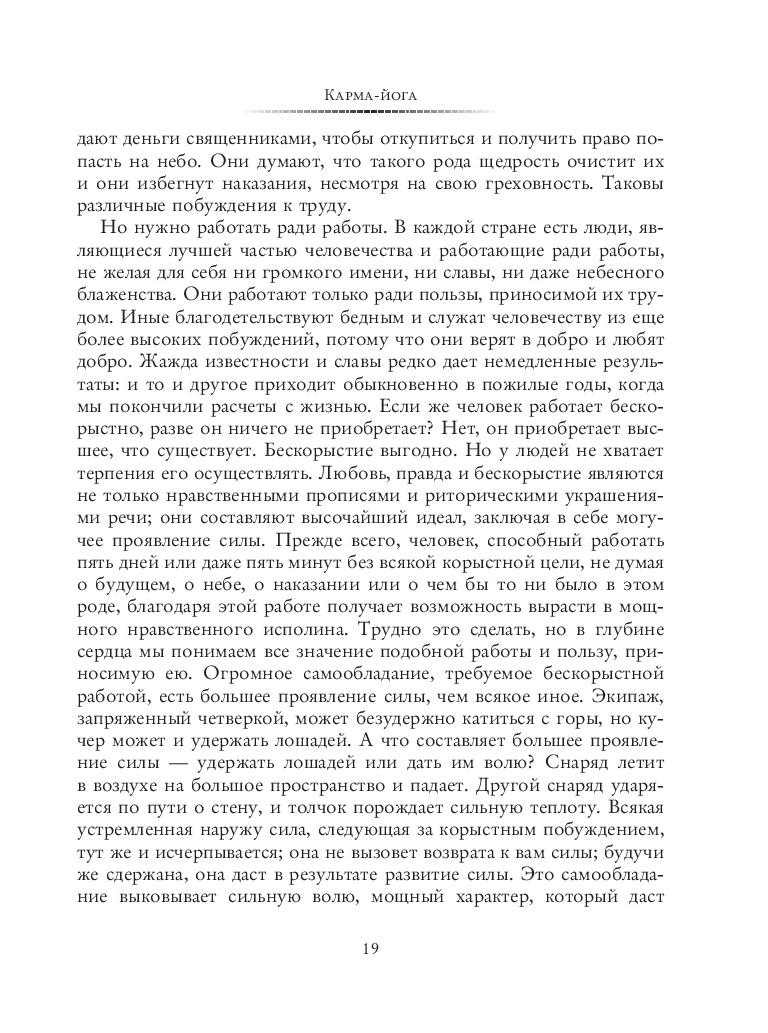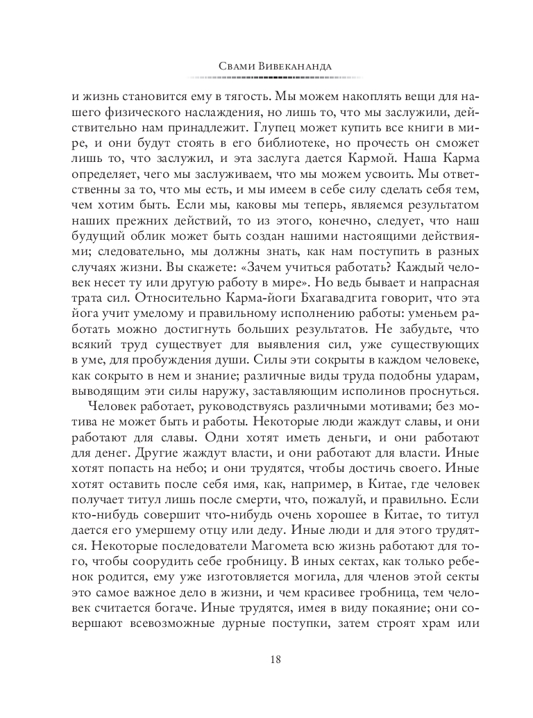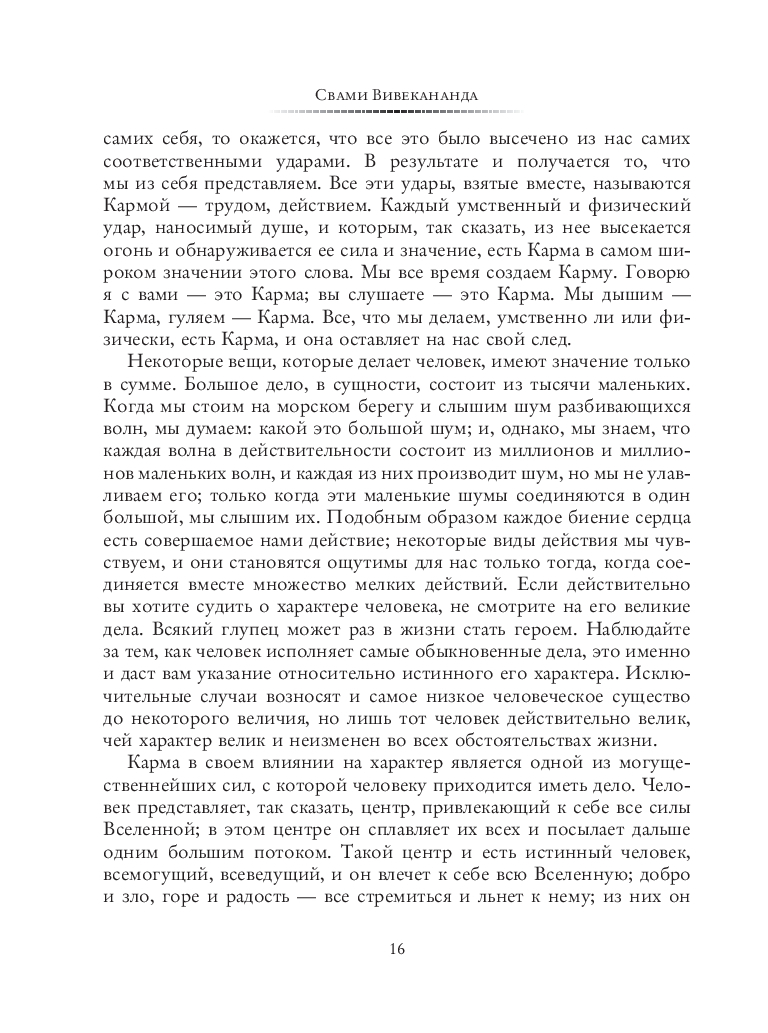 Философия Веданты и йоги преподносится в этом сборнике на простых и близких западному читателю примерах. В книгу вошли лекции по Карма-, Бхакти-, Джнана- и Раджа-йоге, затрагивающие, соответственно, такие темы, как работа и труд, любовь к Богу, реальность и иллюзия, а также разум и его освобождение. Здесь вы найдете и сочинение "Практическая Веданта", трактующее Упанишады и раскрывающее их смысл для современного человека. Немалый интерес представляют также "Вдохновенные беседы" – записи выступлений Свами Вивекананды, в которых он делится своей мудростью в форме афоризмов, притч и философских высказываний.