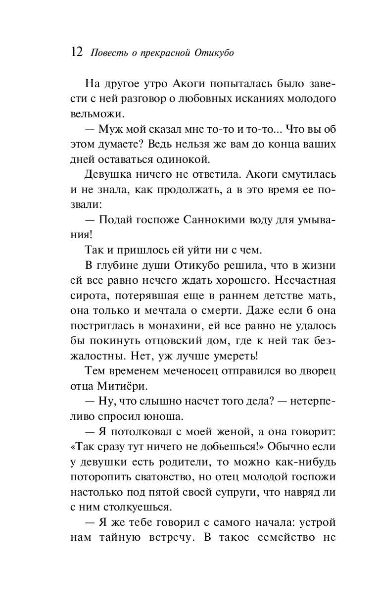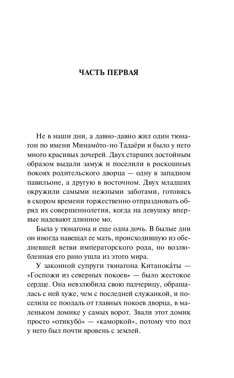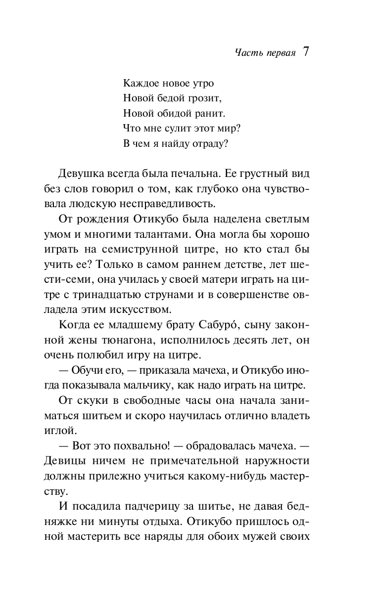 Старинная японская повесть о прекрасной Отикубо написана сказочным гладким языком, полна чудесными образами, красотой, тонким юмором, нежностью и хрупкостью. Читающий ее получит истинное наслаждение от яркой и красочной атмосферы загадочной страны восходящего солнца. Этот шедевр древней классики дает возможность прикоснуться к древним традициям, познакомиться с нравами и бытом Японии десятого века. В насыщенной красочными подробностями и тонкими поэтичными наблюдениями повести благодаря чуду любви побеждает добро и торжествует справедливость.