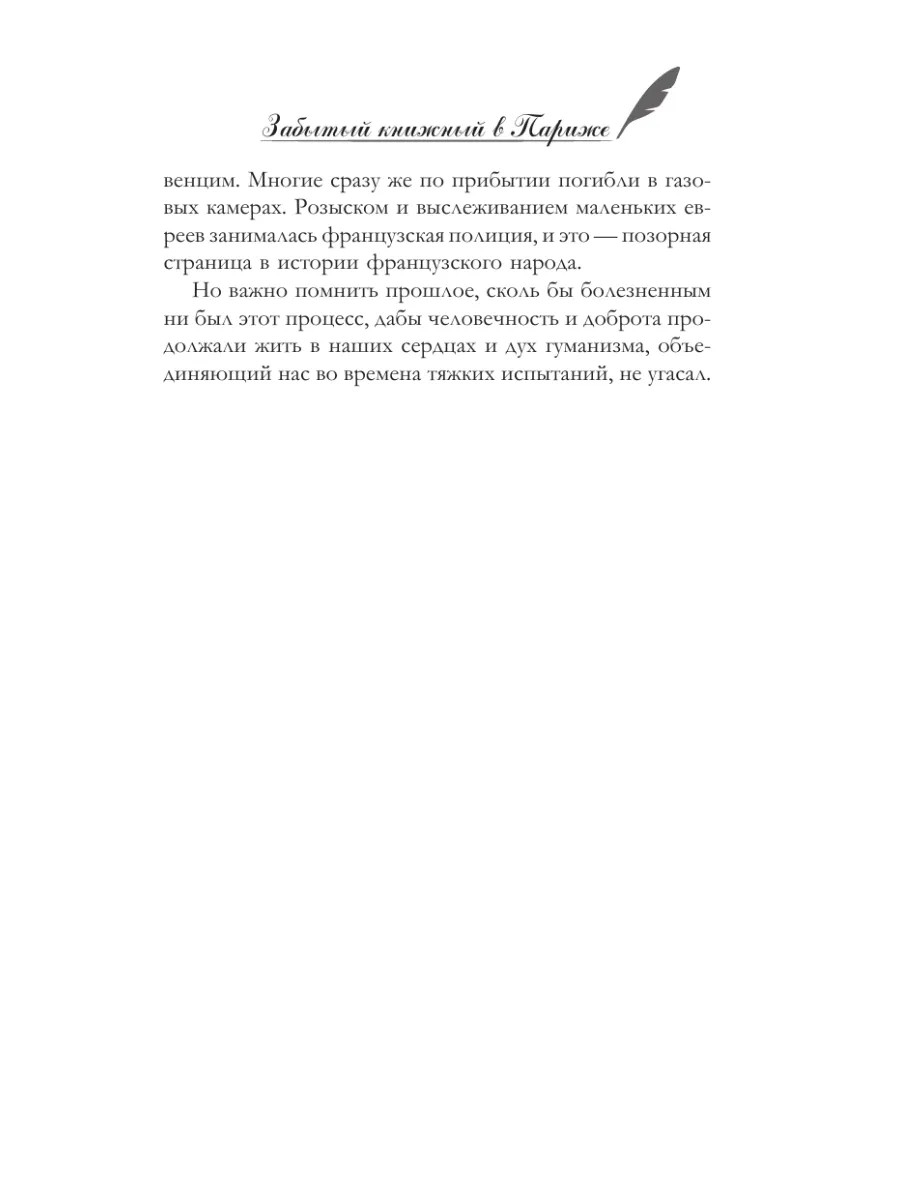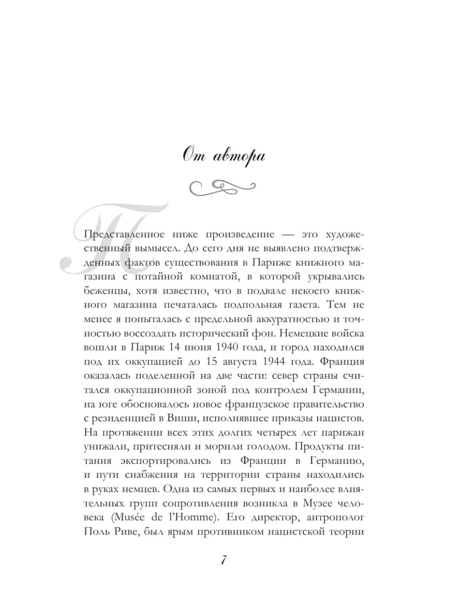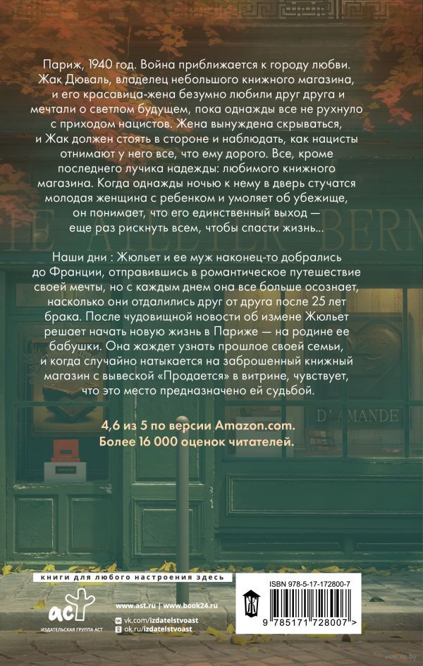 Париж, 1940 год: война приближается к городу любви. Жак Дюваль,владелец небольшого книжного магазина, и его красавица-жена безумно любили друг друга и мечтали о светлом будущем, пока однажды все не рухнуло с приходом нацистов. Жена вынуждена скрываться, и Жак должен стоять в стороне и наблюдать, как нацисты отнимают у него все, что ему дорого. Все,кроме последнего лучика надежды: любимого книжного магазина. Когда однажды ночью к нему в дверь стучатся молодая женщина с ребенком и умоляют об убежище, он понимает, что его единственный выход – еще раз рискнуть всем, чтобы спасти жизнь…