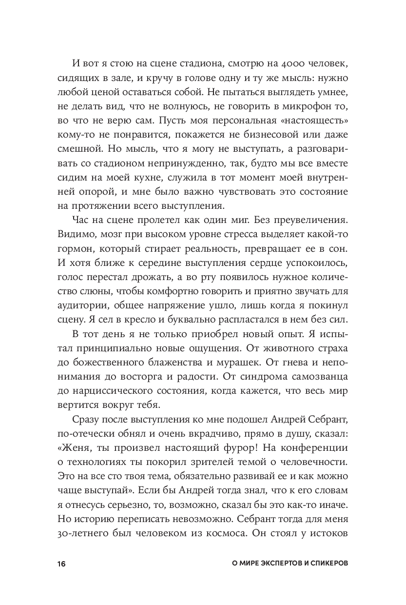 Ответы на эти и другие важные вопросы ждут вас в книге. Автор, российский предприниматель и профессиональный спикер, в прошлом долго не решавшийся выходить на сцену, рассказывает, как стать успешным оратором. Вы узнаете, как сделать ваши выступления запоминающимися и монетизировать имеющиеся экспертные знания и навыки в новой для вас профессии спикера.