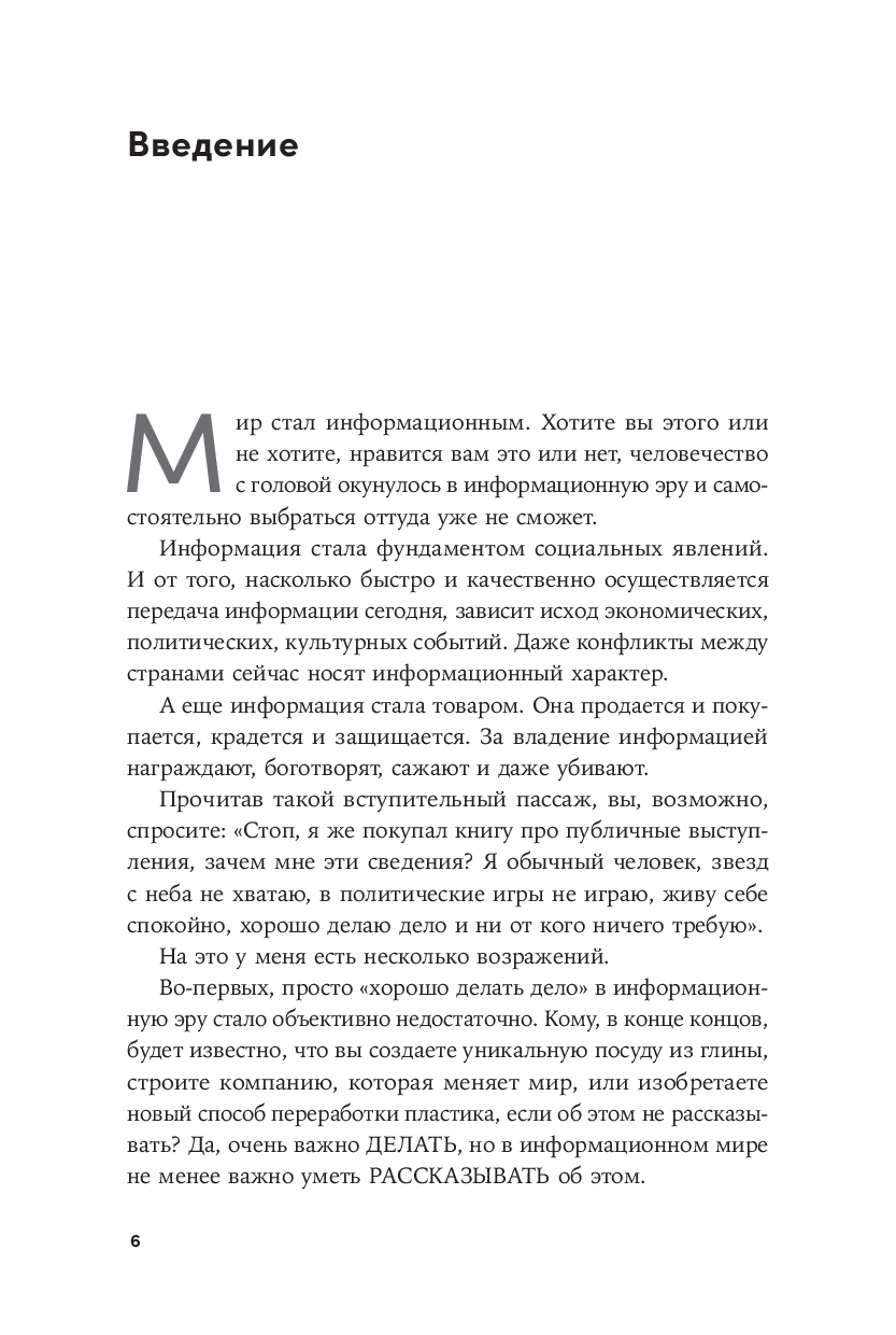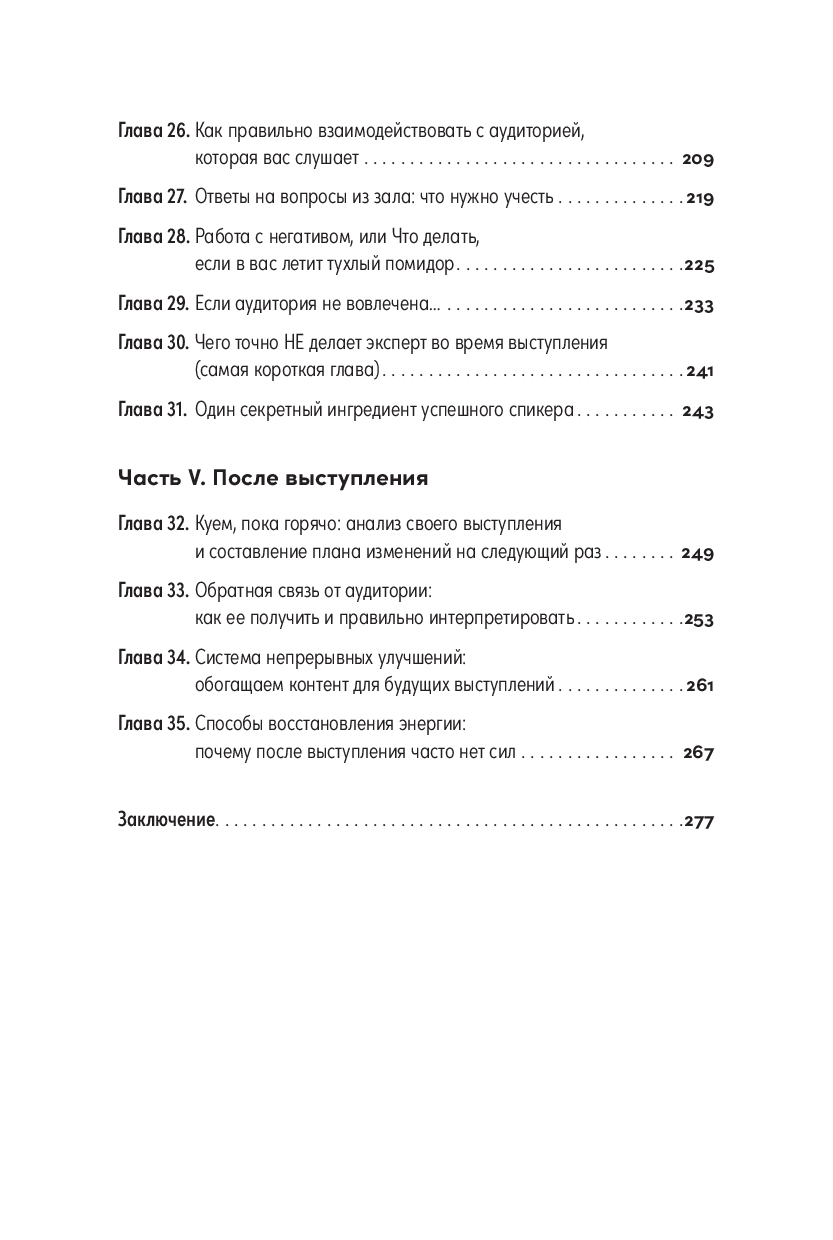 Как понять, что́ именно от вас хотят услышать, и как донести эту информацию без воды и скуки? Где найти благодарных слушателей и хорошие площадки? Как подготовиться к выступлению и как сделать действительно интересную презентацию? Как справляться с волнением и страхом? Что делать, если в момент выступления подводит память, першит в горле или хочется все бросить и сбежать? Как правильно говорить с аудиторией, работать с негативом и что делать с обратной связью? Уместно ли просить у организаторов гонорар за выступление и как понять, сколько просить?