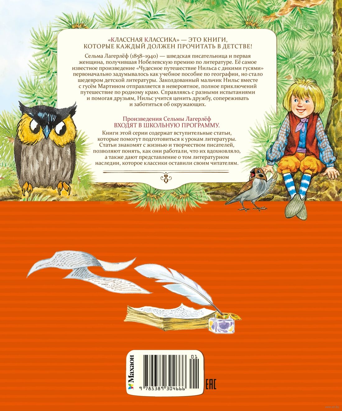 Сельма Лагерлёф (1858-1940) – шведская писательница и первая женщина, получившая Нобелевскую премию по литературе. Её самое известное произведение "Чудесное путешествие Нильса с дикими гусями" первоначально задумывалось как учебное пособие по географии, но стало шедевром детской литературы. Заколдованный мальчик Нильс вместе с гусём Мартином отправляется в увлекательное путешествие по родному краю. Их ждут опасные испытания, незабываемые встречи и удивительные приключения. Справляясь с разными трудностями и помогая друзьям, Нильс учится ценить дружбу, сопереживать и заботиться об окружающих.