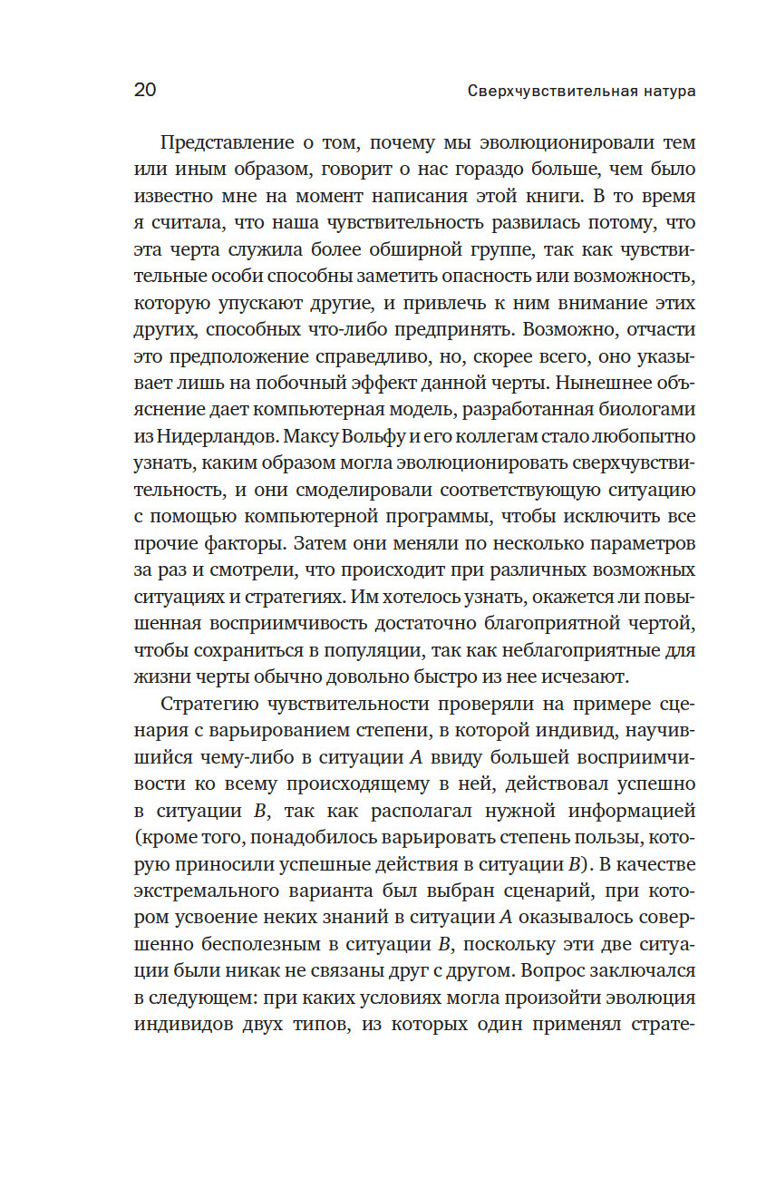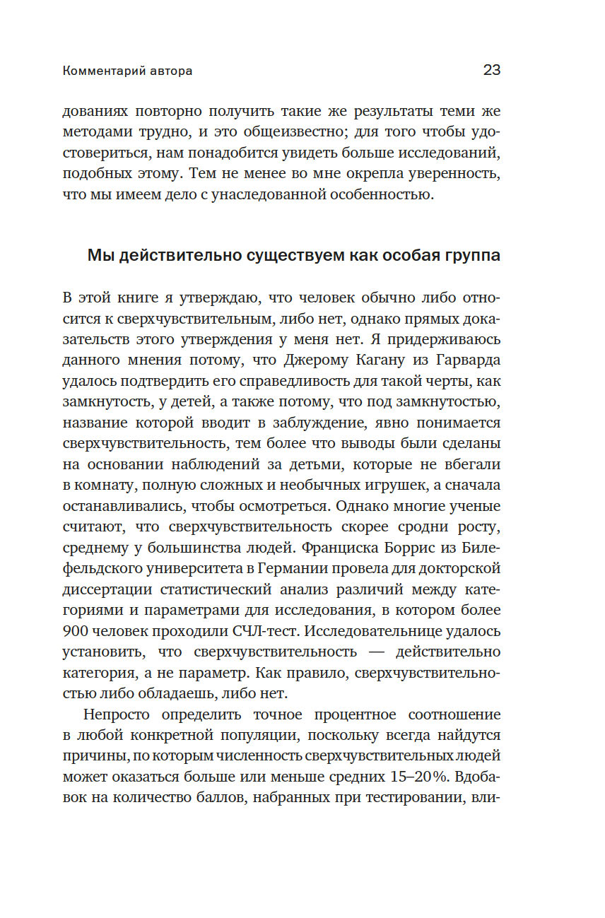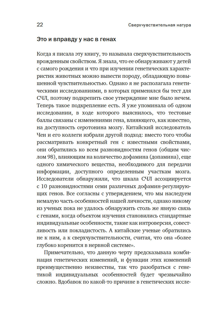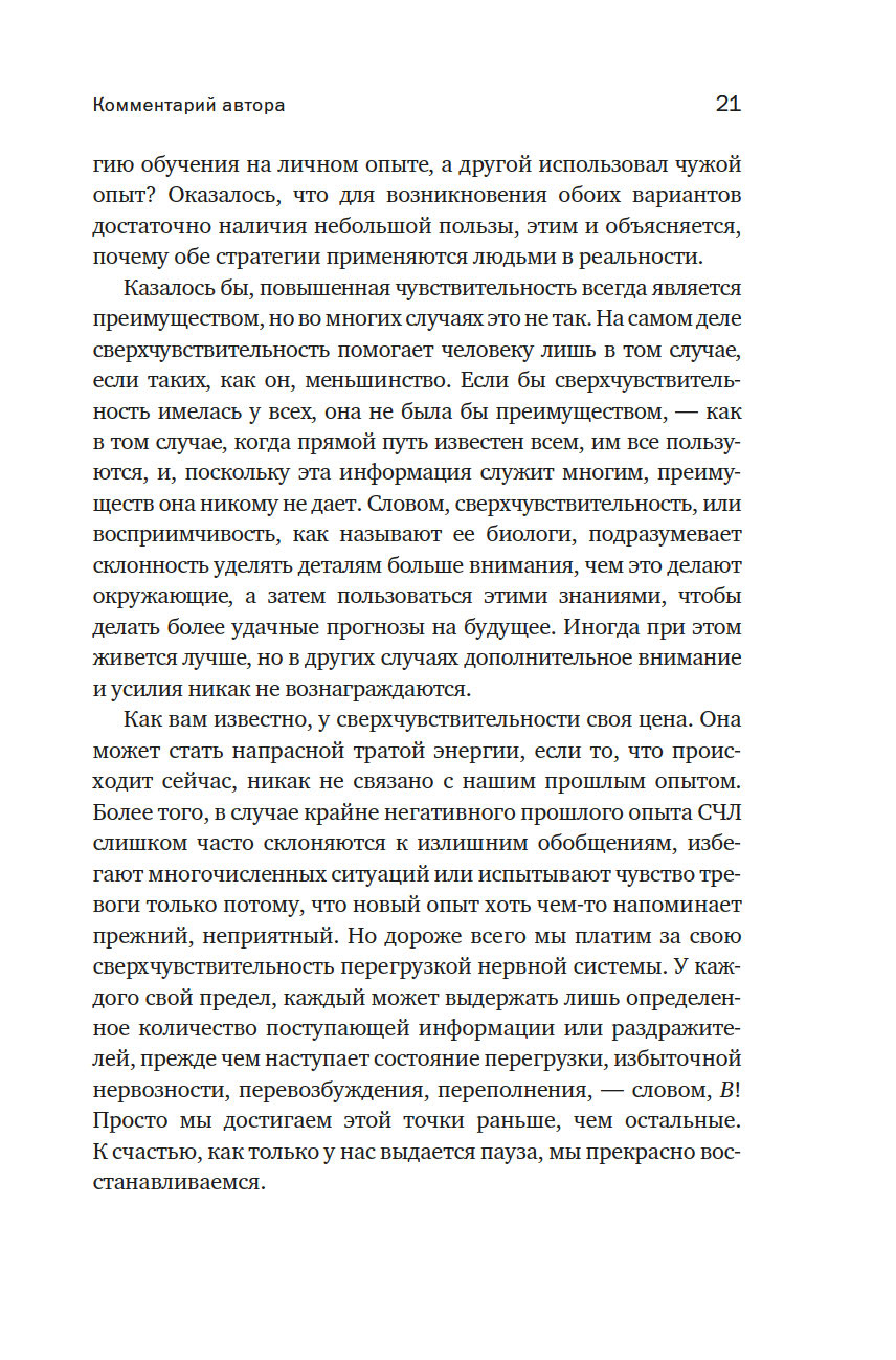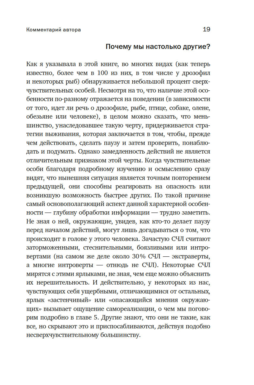 Долгое время сверхчувствительность считалась то ли слабостью, то ли выдумкой. Доктор Элейн Эйрон, будучи СЧЛ, доказала: около 20 % населения Земли – сверхчувствительные люди, унаследовавшие от родителей черту тонко чувствовать мир. Именно поэтому нельзя игнорировать их переживания и важно относиться к ним с пониманием.