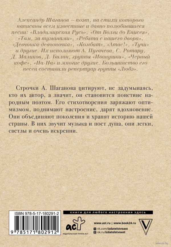 Александр Шаганов – поэт, на стихи которого написаны всем известные и давно полюбившиеся песни: "Владимирская Русь", "От Волги до Енисея", "Там, за туманами", "Ребята с нашего двора", "Девчонка-девчоночка", "Комбат", "Атас!", "Тучи" и другие. Их исполняют А. Пугачева, С. Ротару, Д. Маликов, Д. Билан, группы "Иванушки", "Черный кофе", "На-На" и многие другие. Большинство его песен составили репертуар группы "Любэ".