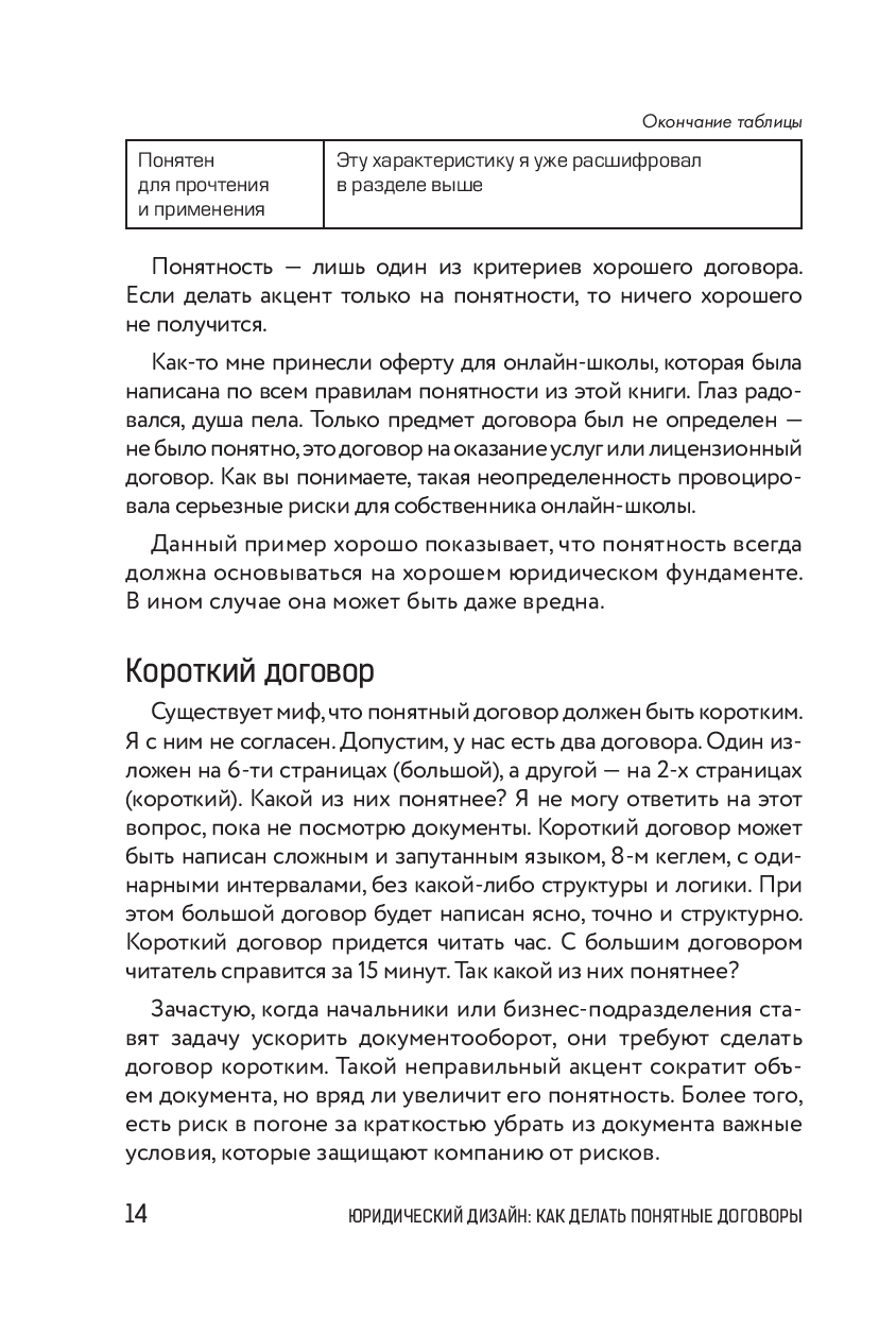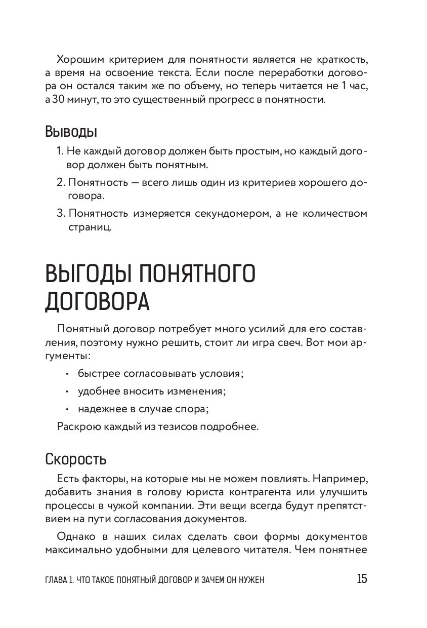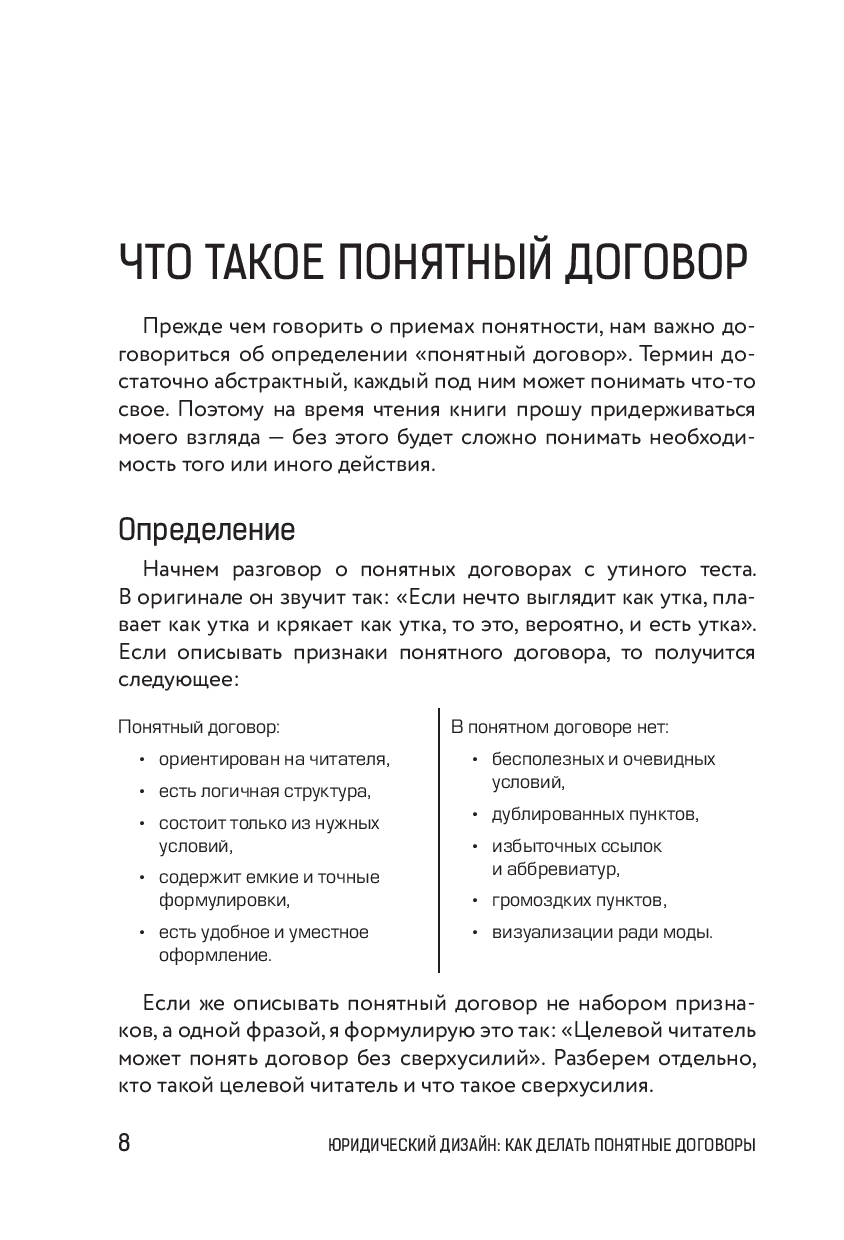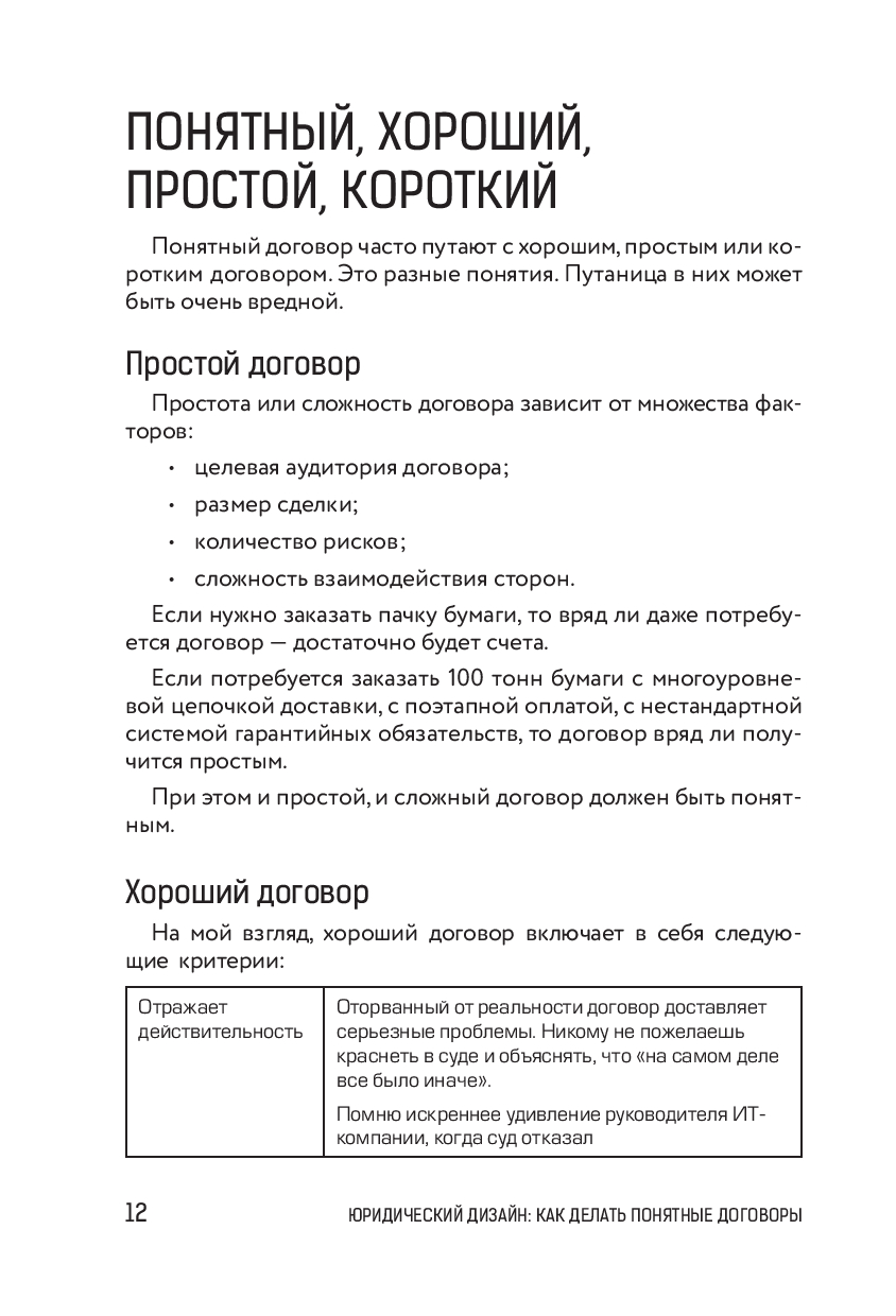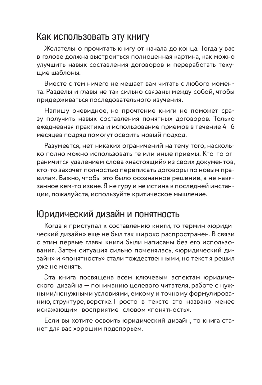 Книга посвящена ключевым аспектам юридического дизайна – пониманию целевого читателя, емкому и точному формулированию условий, структуре договора, верстке и применению нейросетей.