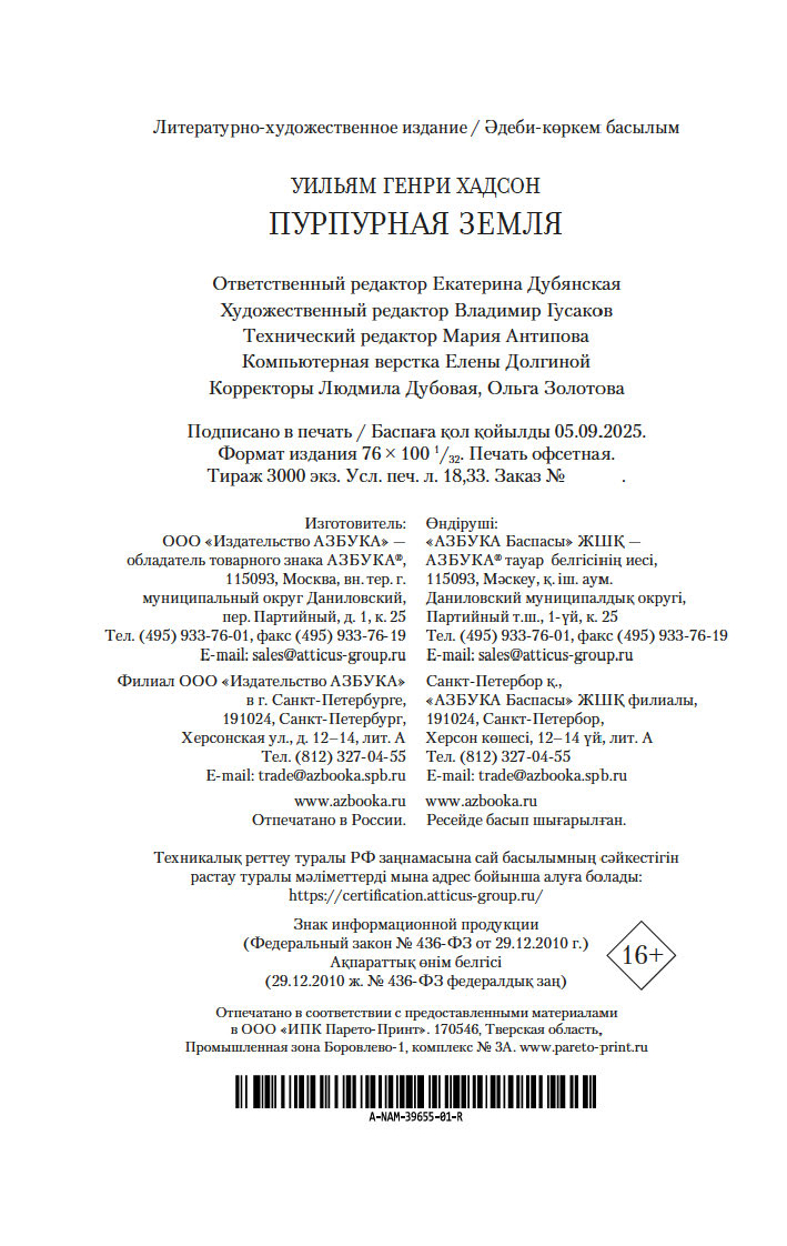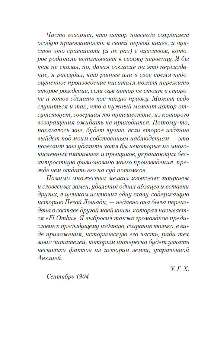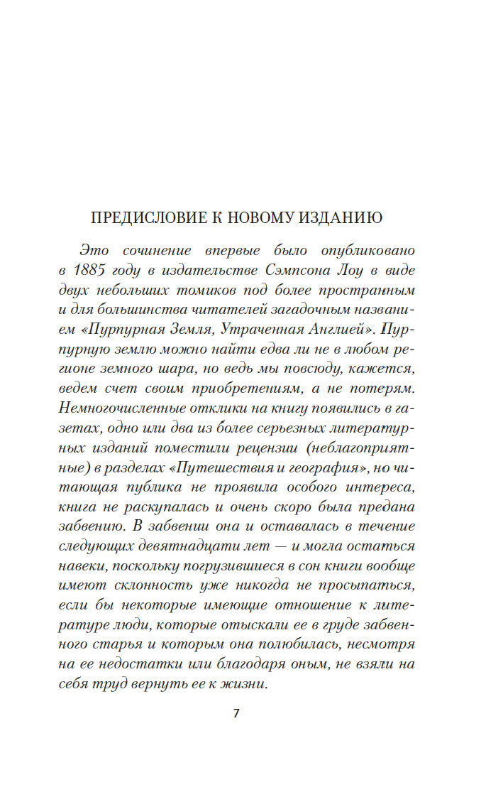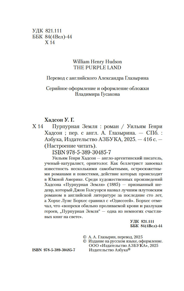 Уильям Генри Хадсон – англо-аргентинский писатель, ученый-натуралист, орнитолог. Как беллетрист завоевал известность несколькими самобытными, остросюжетными романами и повестями, действие которых происходит в Южной Америке. Среди художественных произведений Хадсона "Пурпурная Земля" (1885) – признанный шедевр, который Джон Голсуорси назвал лучшим плутовским романом в английской литературе за последние сто лет, а Хорхе Луис Борхес сравнил с "Одиссеей". Борхес отмечал, что "вопреки обильно проливаемой крови и разлукам героев, "Пурпурная Земля" – одна из немногих счастливых книг на свете".
