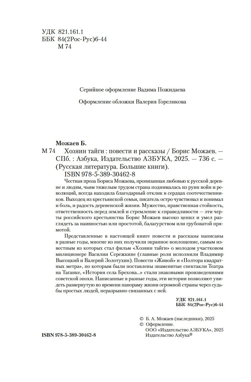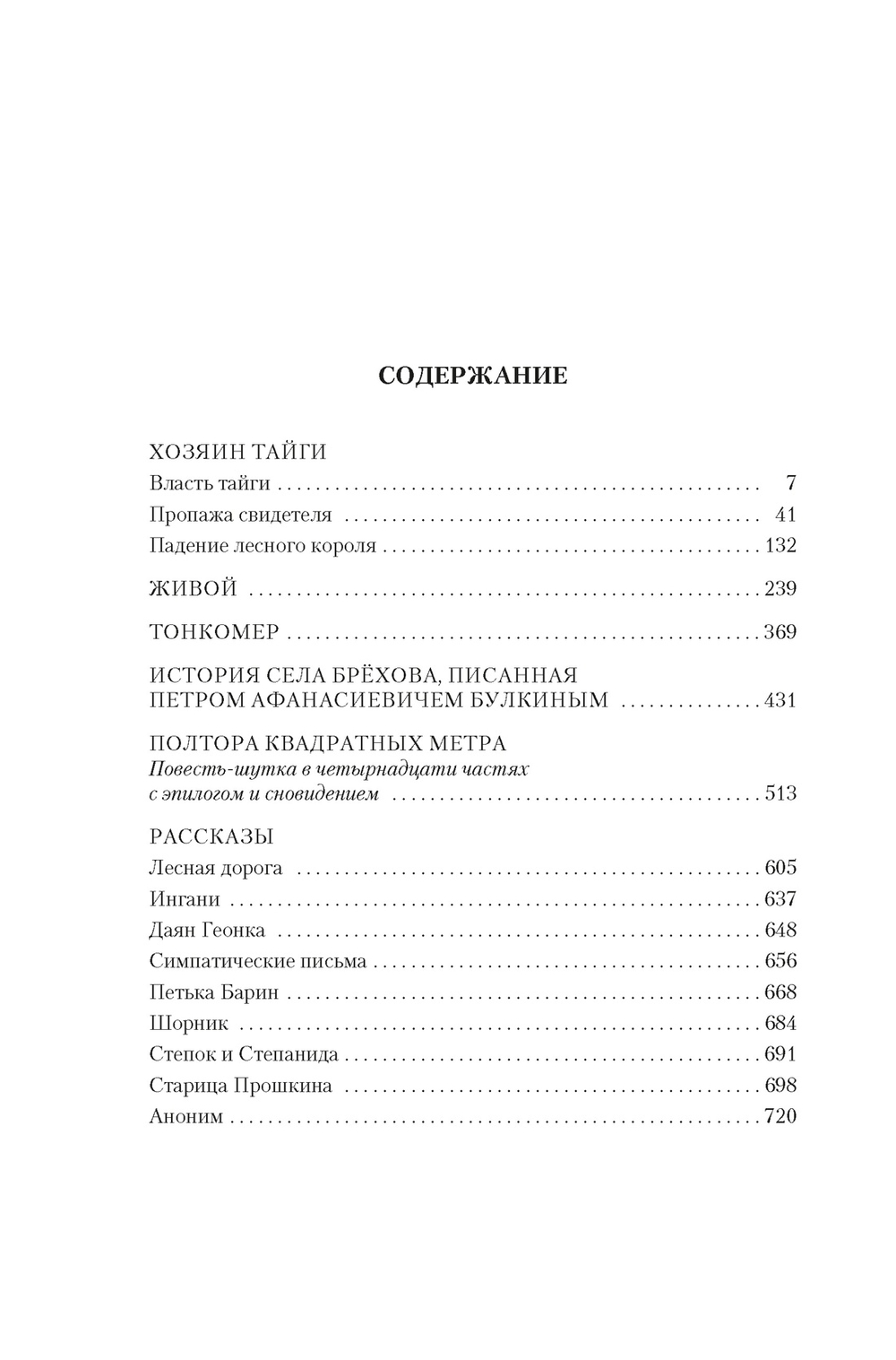 Представленные в настоящей книге повести и рассказы написаны в разные годы, многие из них получили экранное воплощение, самым известным из которых стал фильм "Хозяин тайги" о молодом участковом милиционере Василии Сережкине (главные роли исполнили Владимир Высоцкий и Валерий Золотухин). Повести "Живой" и "Полтора квадратных метра", по которым были поставлены знаменитые спектакли Театра на Таганке, "История села Брехова…" стали знаковыми произведениями советской эпохи. Написанные в разные годы, эти истории позволяют увидеть развернутую во времени панораму жизни огромной страны через судьбы простых людей, неразрывно связанных с ней.