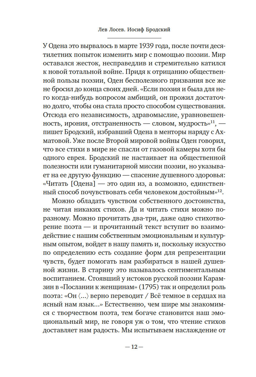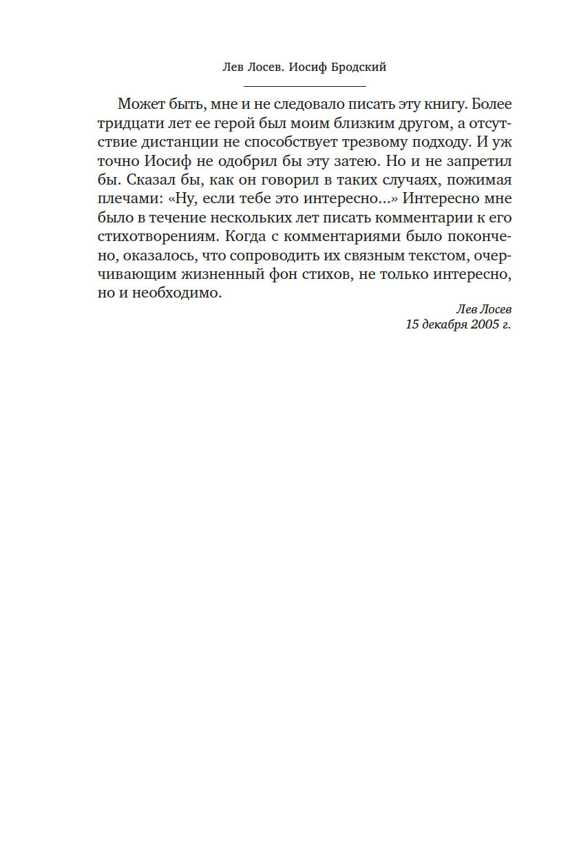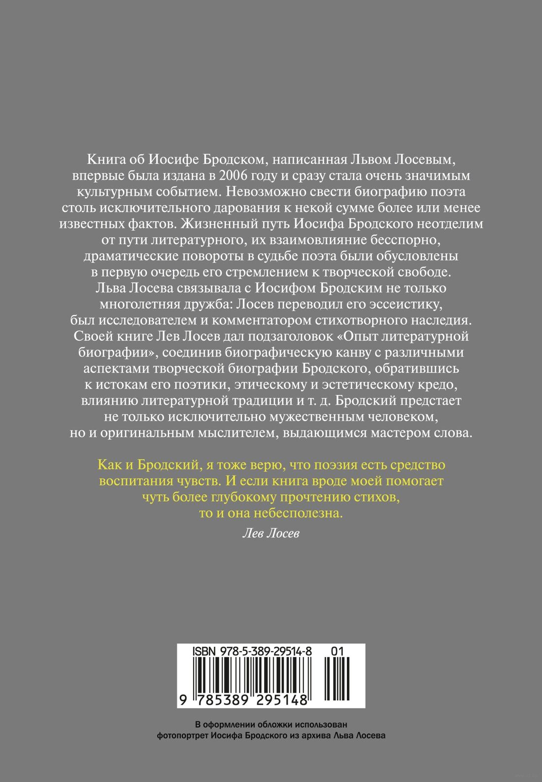 Книга об Иосифе Бродском, написанная Львом Лосевым, впервые была издана в 2006 году и сразу стала очень значимым культурным событием. Невозможно свести биографию поэта столь исключительного дарования к некой сумме более или менее известных фактов. Жизненный путь Иосифа Бродского неотделим от пути литературного, их взаимовлияние бесспорно, драматические повороты в судьбе поэта были обусловлены в первую очередь его стремлением к творческой свободе. Льва Лосева связывала с Иосифом Бродским не только многолетняя дружба: Лосев переводил его эссеистику, был исследователем и комментатором стихотворного наследия. Своей книге Лев Лосев дал подзаголовок "Опыт литературной биографии", соединив биографическую канву с различными аспектами творческой биографии Бродского, обратившись к истокам его поэтики, этическому и эстетическому кредо, влиянию литературной традиции и т. д. Бродский предстает не только исключительно мужественным человеком, но и оригинальным мыслителем, выдающимся мастером слова.
