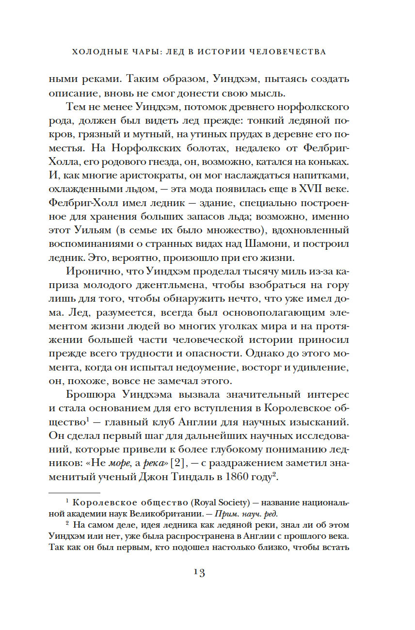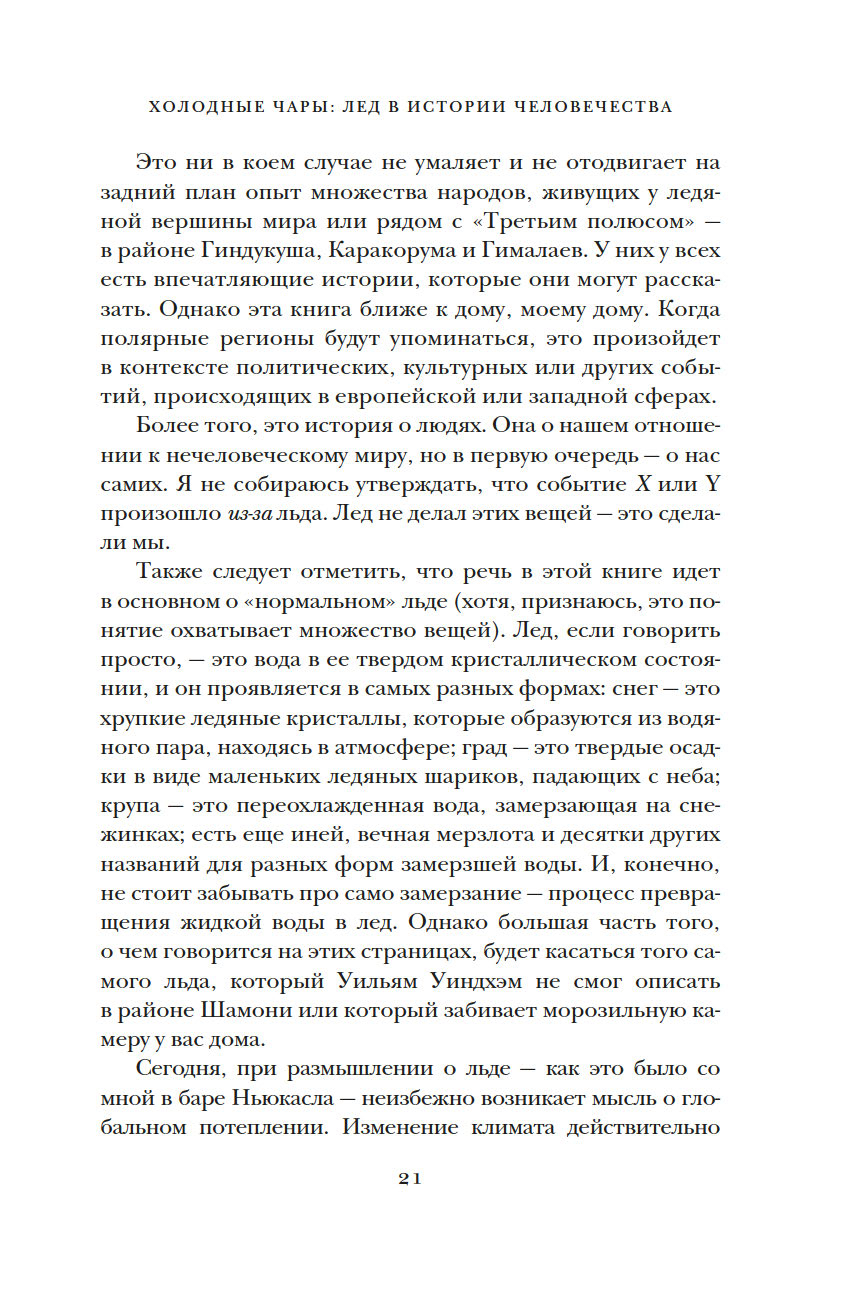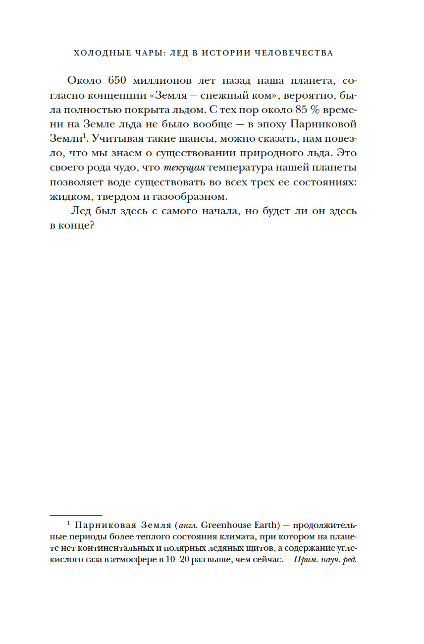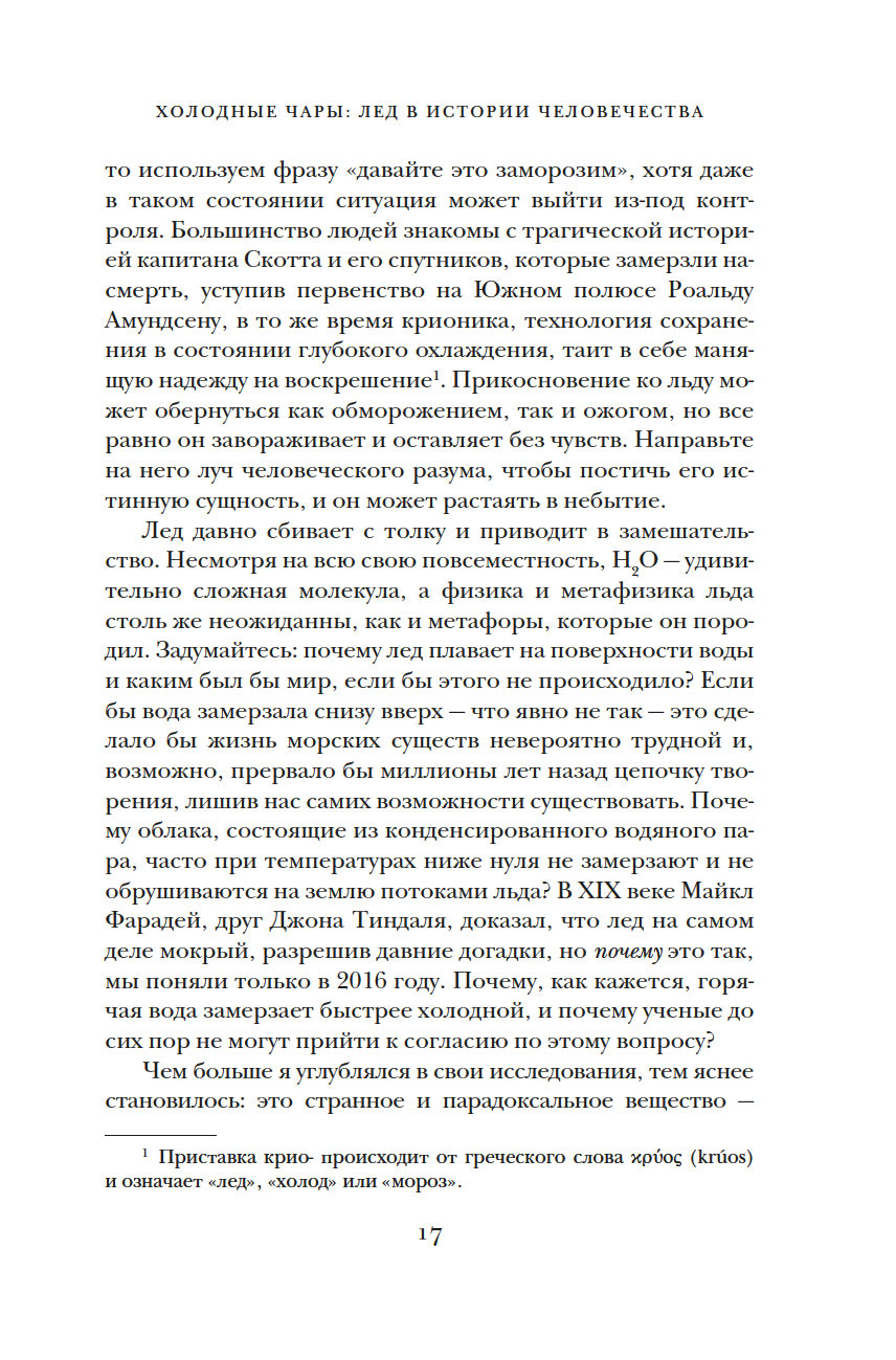 Задолго до появления человека Земля была покрыта льдом. Заснеженные горные вершины, ледники и наши холодильники скрывают в себе одно из самых интересных состояний молекулы H2O. Лед дарует и забирает жизнь, он используется во множестве сфер, и без него были бы немыслимы достижения науки. На страницах этой книги вы встретите Уинстона Черчилля, мамонтов, "ледяного человека" Этци и сэра Джона Франклина, об экспедиции которого Дэн Симмонс написал роман "Террор". Ледниковый период в Средние века, палеонтологические раскопки и разработка оружия во Вторую мировую войну – лед всегда был тихим героем человеческой истории.