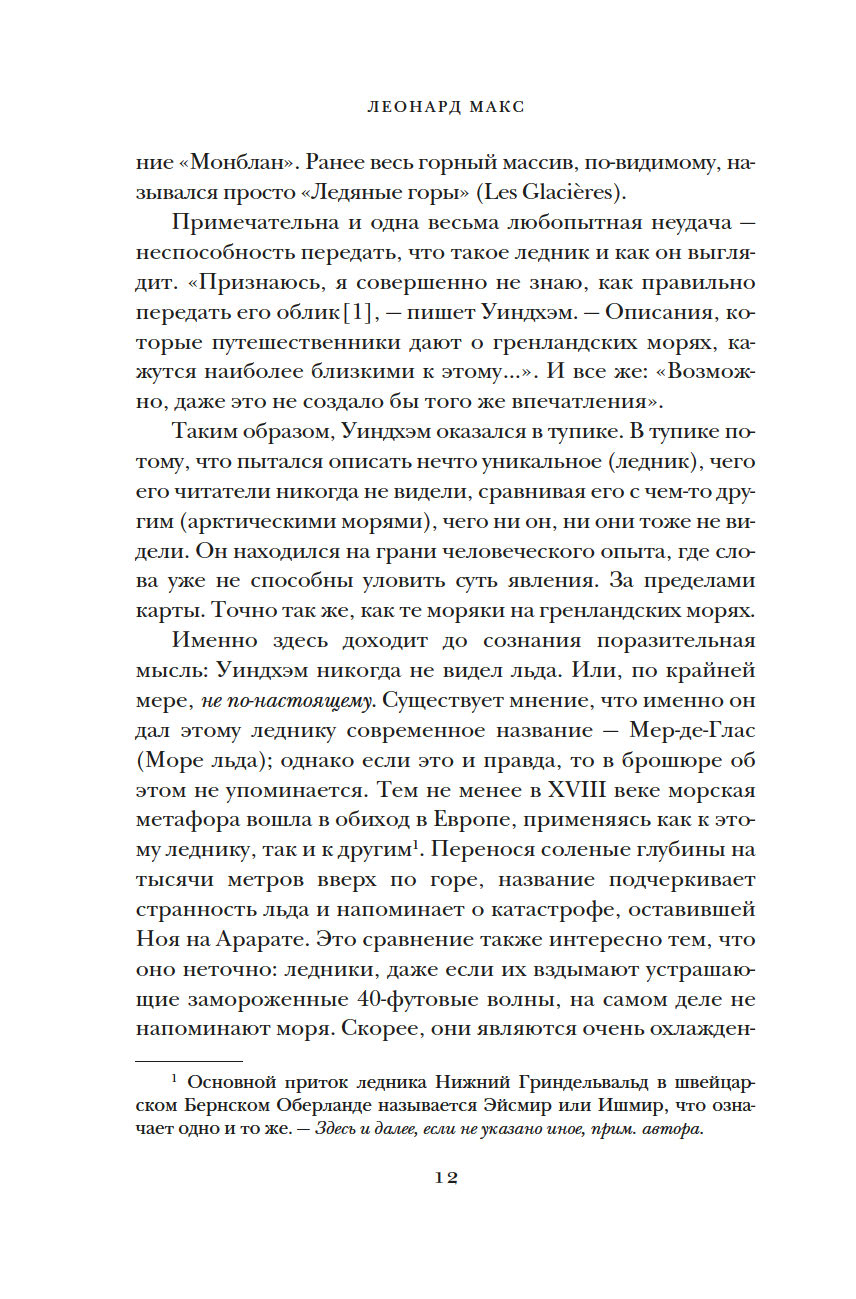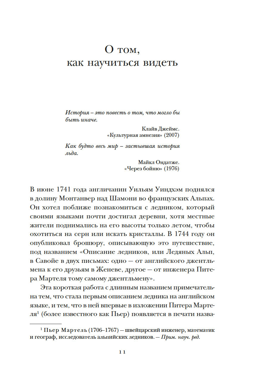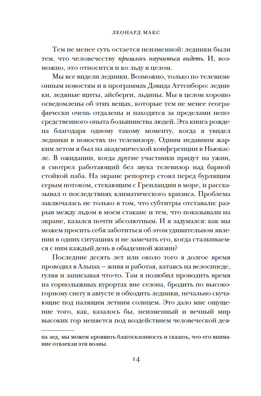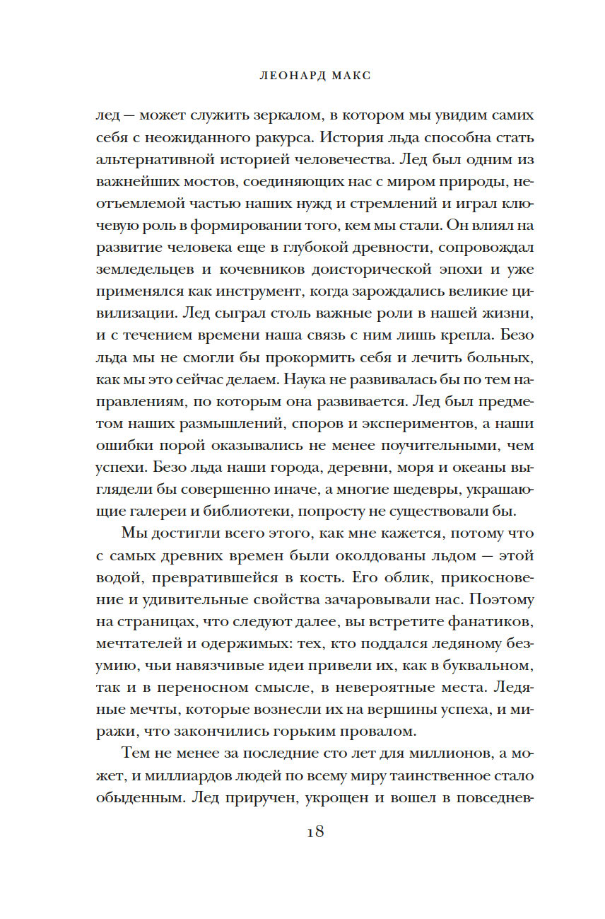 "Лед был одним из важнейших мостов, соединяющих нас с миром природы… Он влиял на развитие человека еще в глубокой древности, сопровождал земледельцев и кочевников доисторической эпохи… Безо льда мы не смогли бы прокормить себя и лечить больных, как мы это сейчас делаем. Наука не развивалась бы по тем направлениям, по которым она развивается. Безо льда наши города, деревни, моря и океаны выглядели бы совершенно иначе, а многие шедевры, украшающие галереи и библиотеки, попросту не существовали бы" (Макс Леонард).