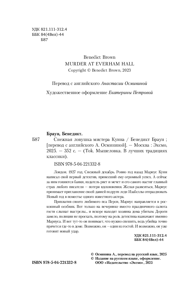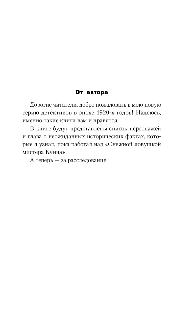 Лондон. 1927 год. Снежный декабрь. Ровно год назад Мариус Куин написал свой первый детектив, принесший ему огромный успех. А сейчас за ним гоняются банки, издатель рвет и мечет, и его самого настиг главный страх любого писателя – потеря вдохновения. Желая развеяться, Мариус принимает приглашение своей давней подруги леди Изабеллы отпраздновать Новый год в поместье одного известного актера.