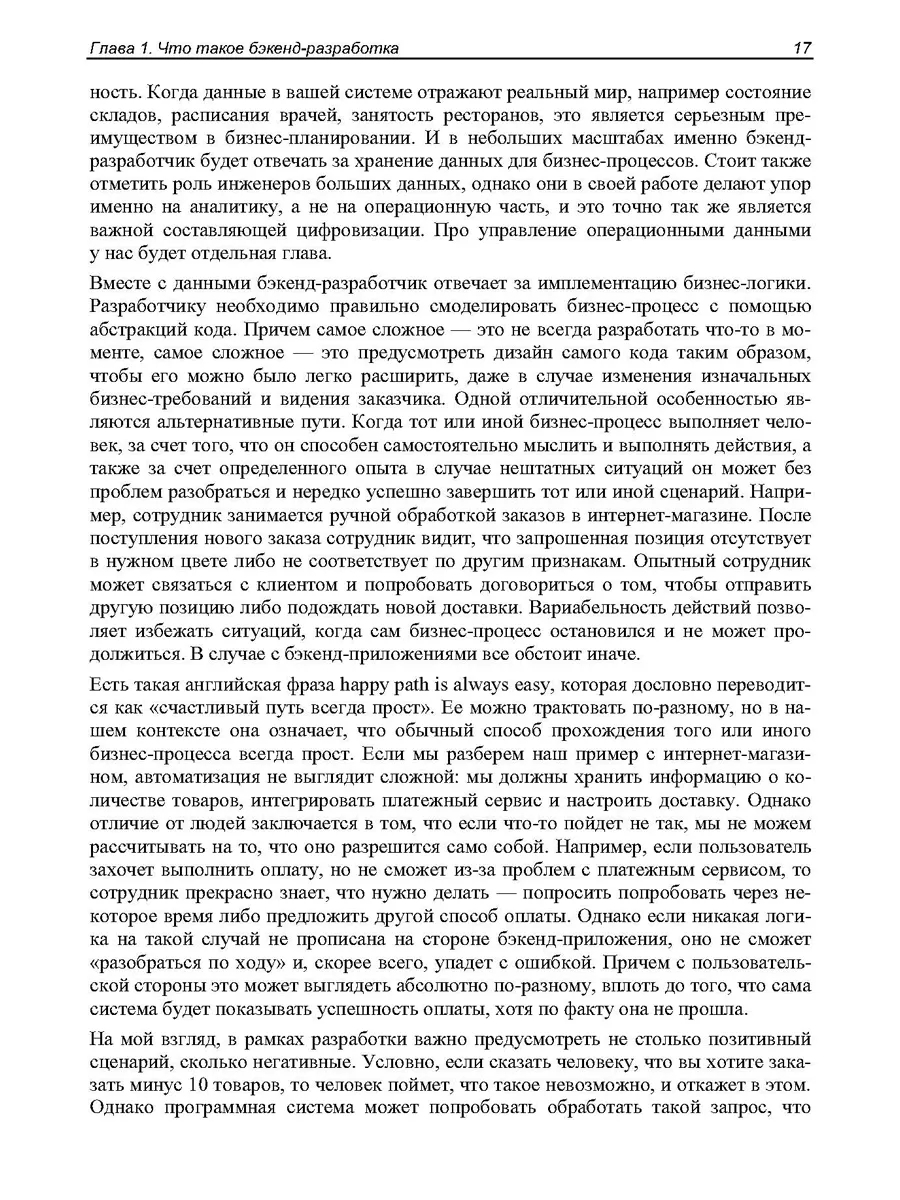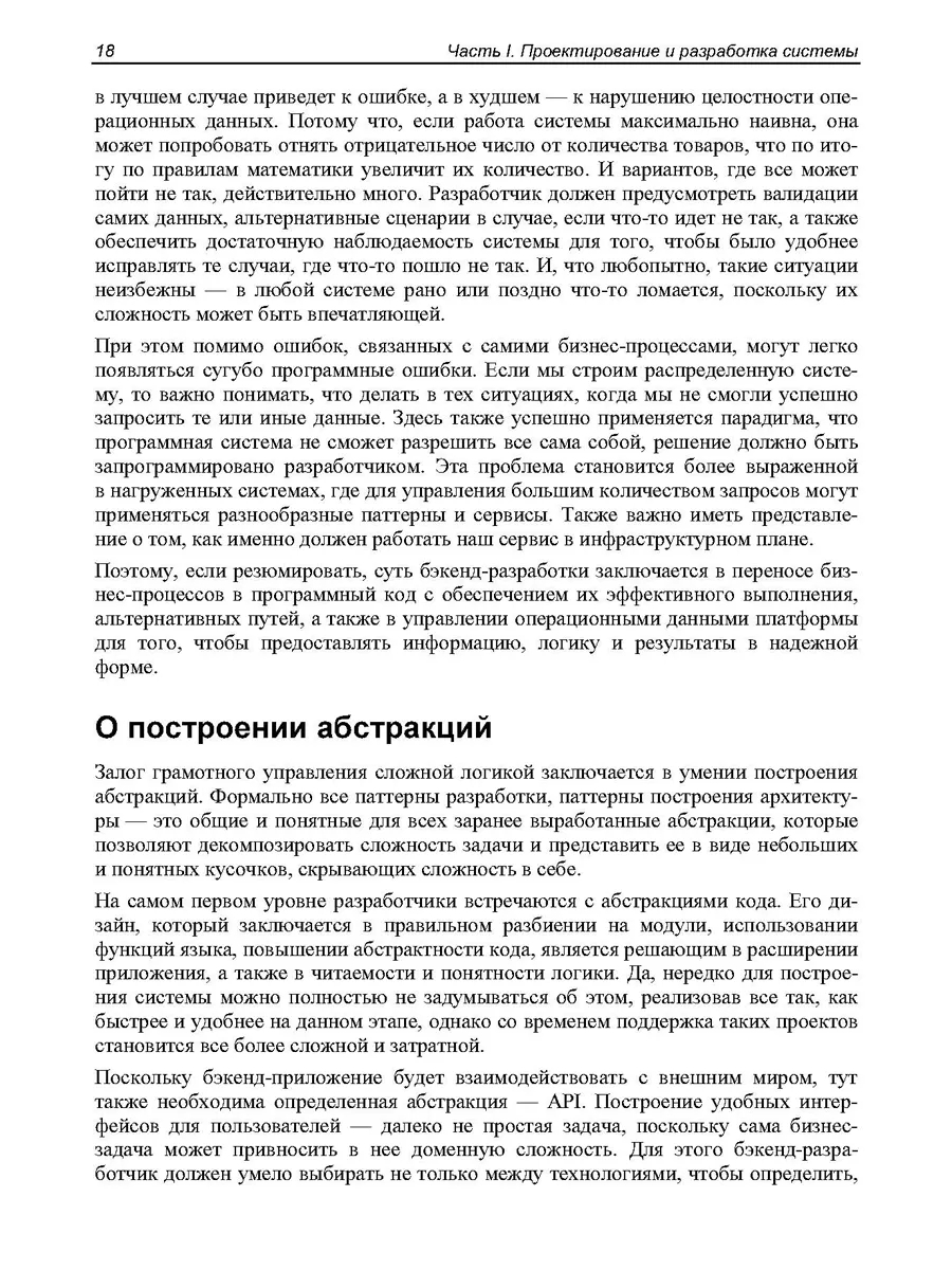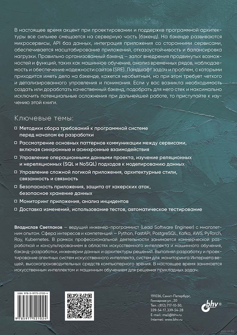 Книга посвящена полному циклу бэкенд-разработки, начиная от сбора требований и заканчивая мониторингом приложения. Основные темы книги касаются масштабирования приложений, балансировки нагрузки, создания и доработки REST API, подбора инструментов для анализа данных, технологии SQL и NoSQL, обеспечения безопасности приложений, архитектурных стилей, применяемых при проектировании бэкенда. Также рассмотрены вопросы тестирования и развёртывания приложений, обмен данными в синхронном и асинхронном режиме, разница между связанностью и связностью. Без жесткой привязки к конкретным технологиям раскрыты основные особенности и сложности, возникающие в процессе создания новых сервисов, а также даны рекомендации по улучшению имеющихся сервисов и микросервисов. Структура книги подразумевает сквозное изучение материала, раскрывает принципы построения бэкенд-решений в рамках реальных проектов, где требуется одновременно учитывать технологическую составляющую, меняющиеся бизнес-требования и человеческий фактор.