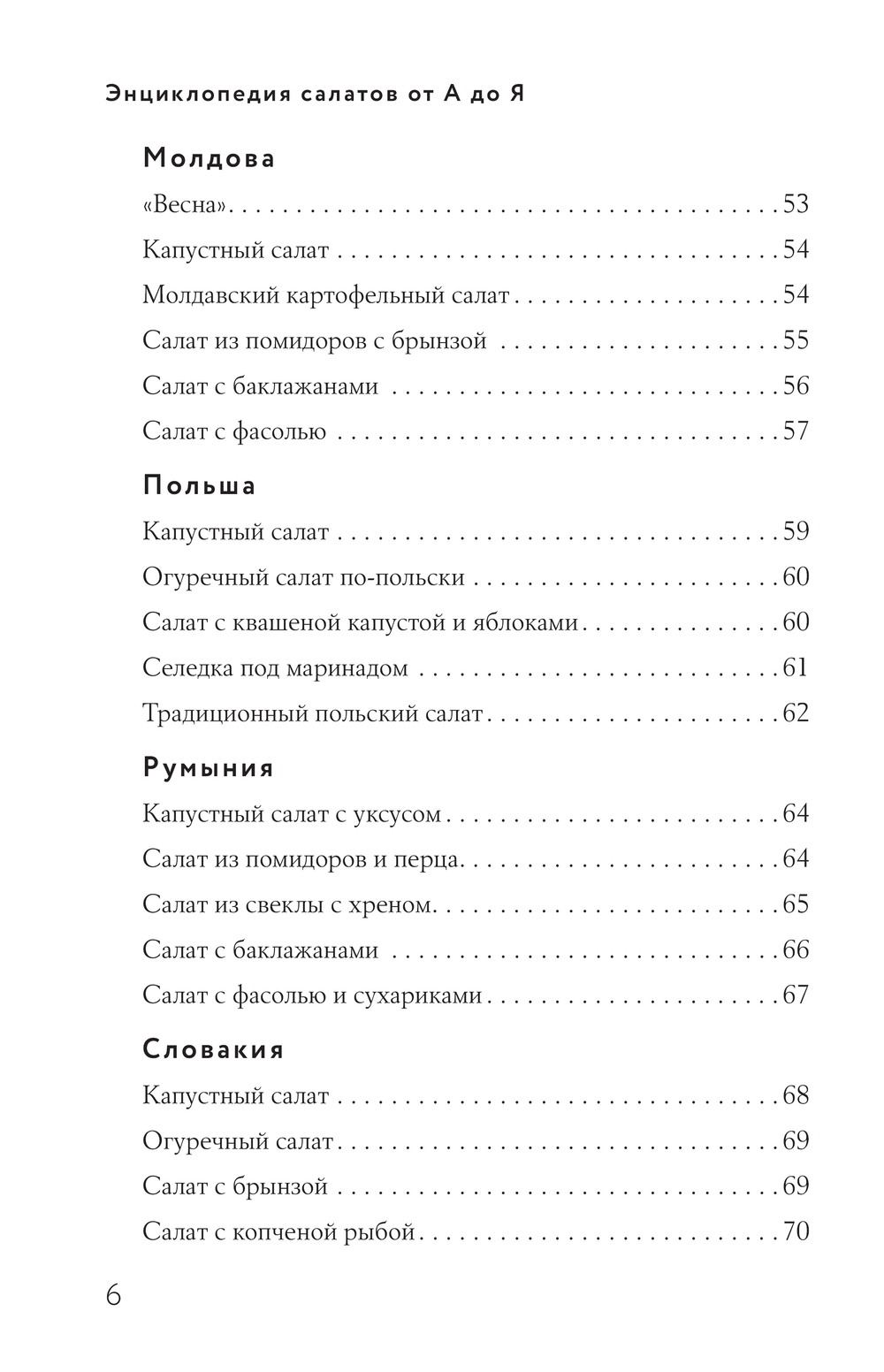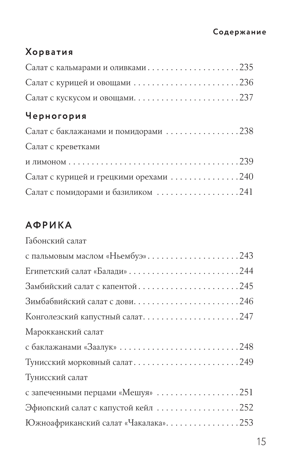 В нашей книге вы найдете поразительное количество салатов со всех концов света: из Европы, Азии и Африки, Америки и, разумеется, из России. С картошкой и капустой, которые любят во всех странах. С мясом, рыбой, морепродуктами, которые в каждой стране имеют свой вкус. С овощами и фруктами, которые теперь можно найти в любое время года в любом уголке мира. Особую прелесть составляют салаты, где сочетаются соленые и сладкие вкусы, свежие и обработанные продукты, простые и экзотические ароматы.