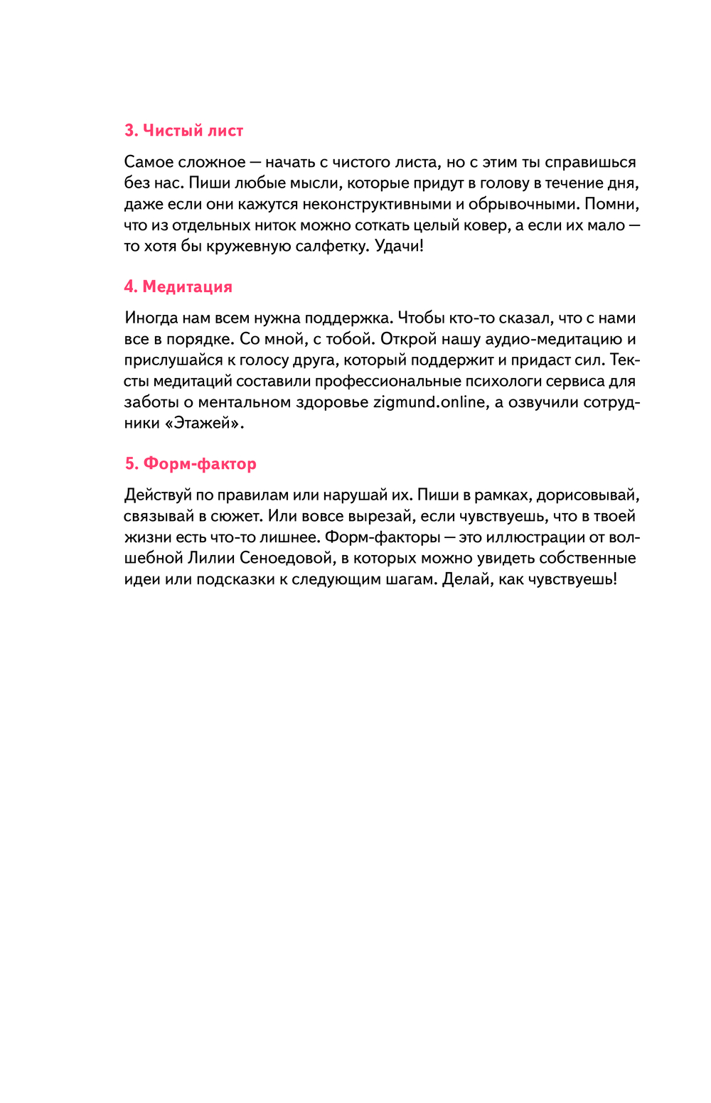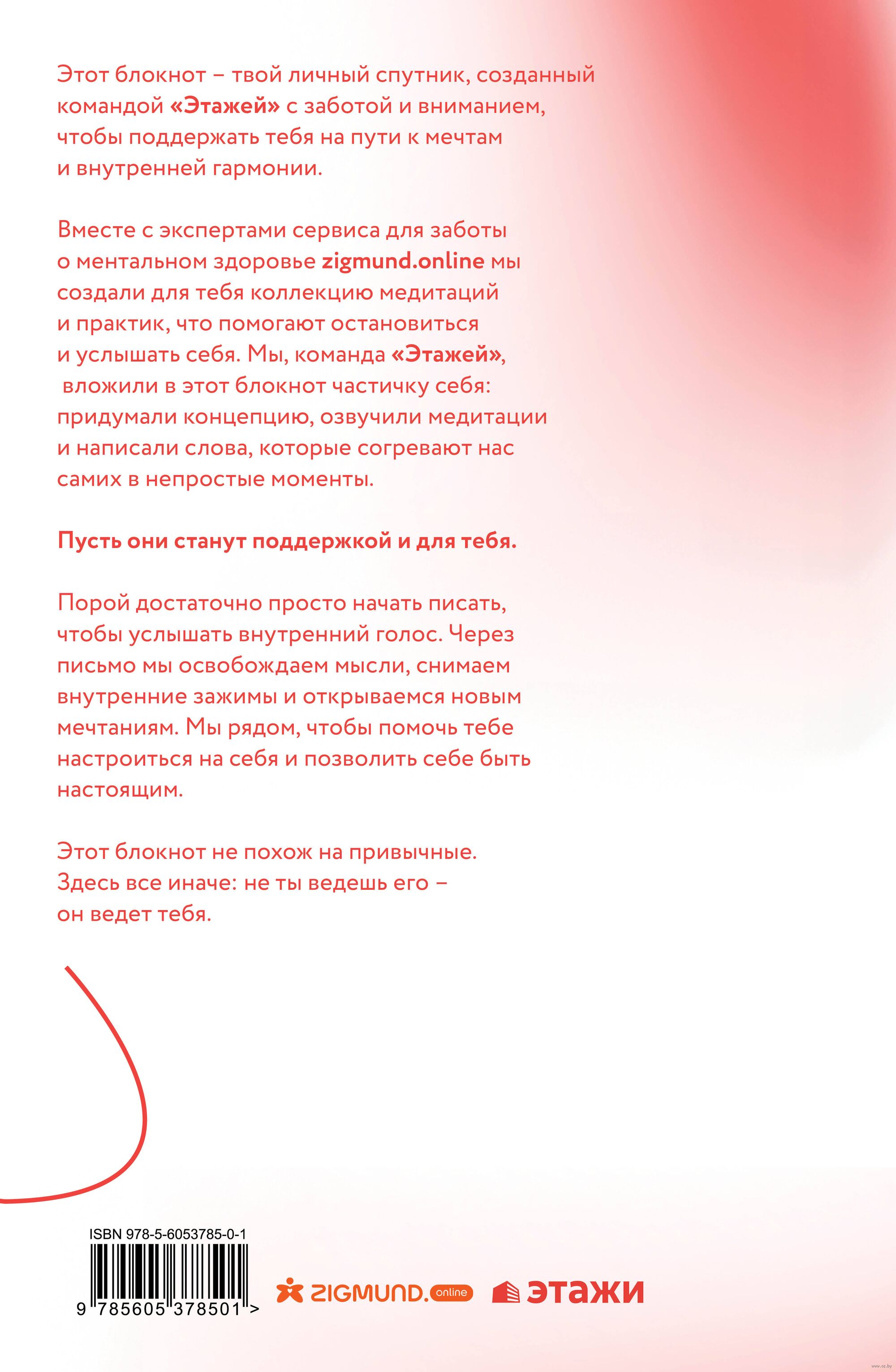 Вместе с экспертами сервиса для заботы о ментальном здоровье zigmund.online мы создали для тебя коллекцию медитаций и практик, что помогают остановиться и услышать себя. Мы, команда "Этажей", вложили в этот блокнот частичку себя: придумали концепцию, озвучили медитации и написали слова, которые согревают нас самих в непростые моменты.