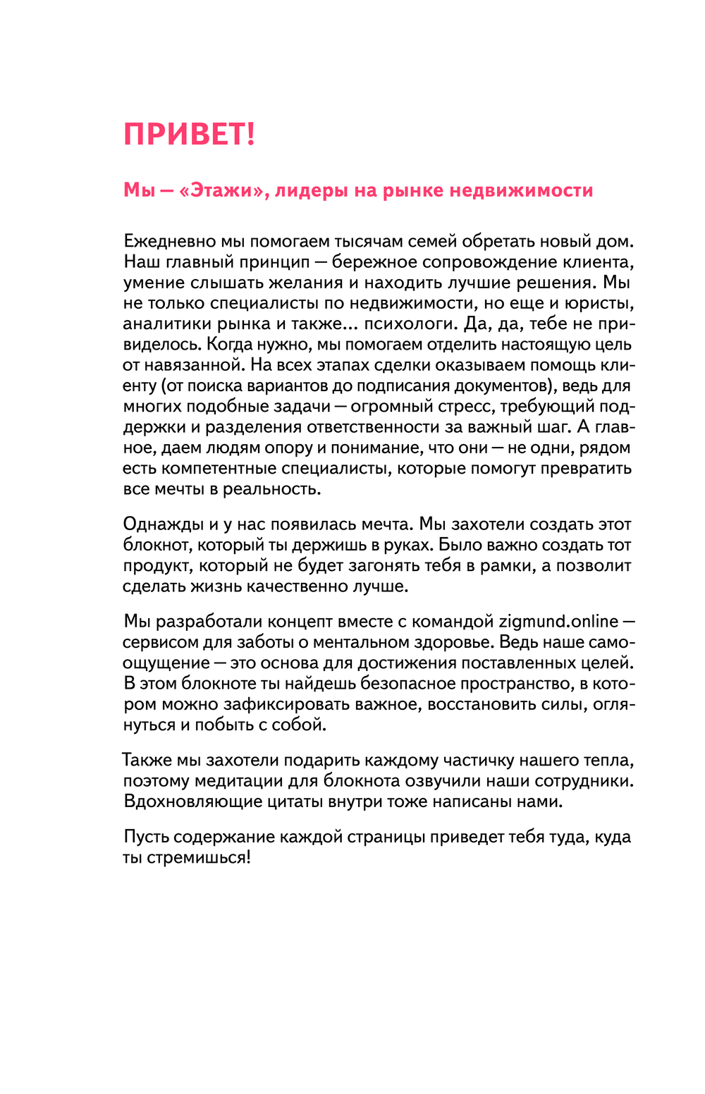 Этот блокнот – твой личный спутник, созданный командой "Этажей" с заботой и вниманием, чтобы поддержать тебя на пути к мечтам и внутренней гармонии.