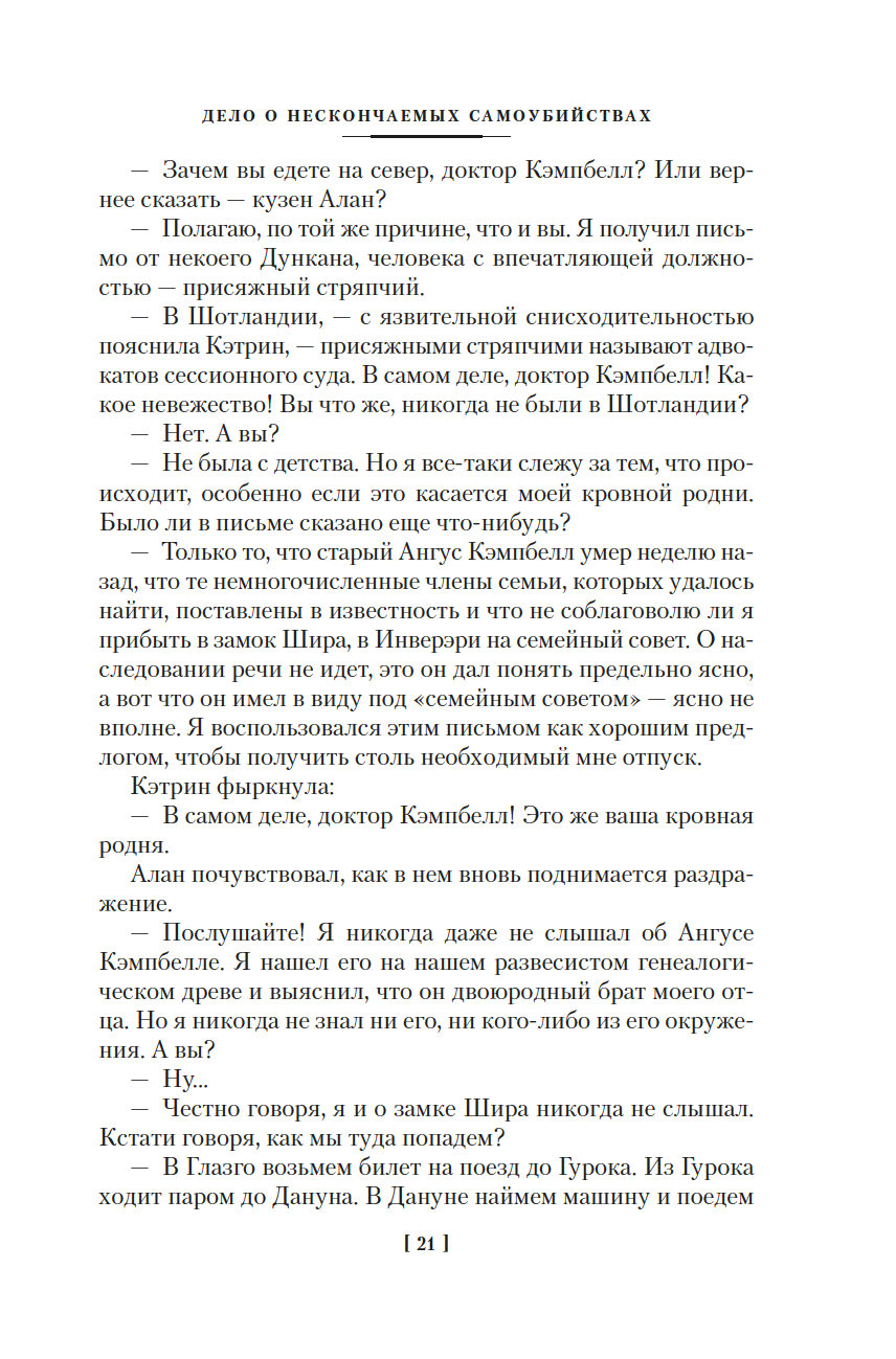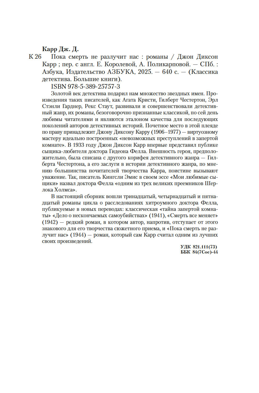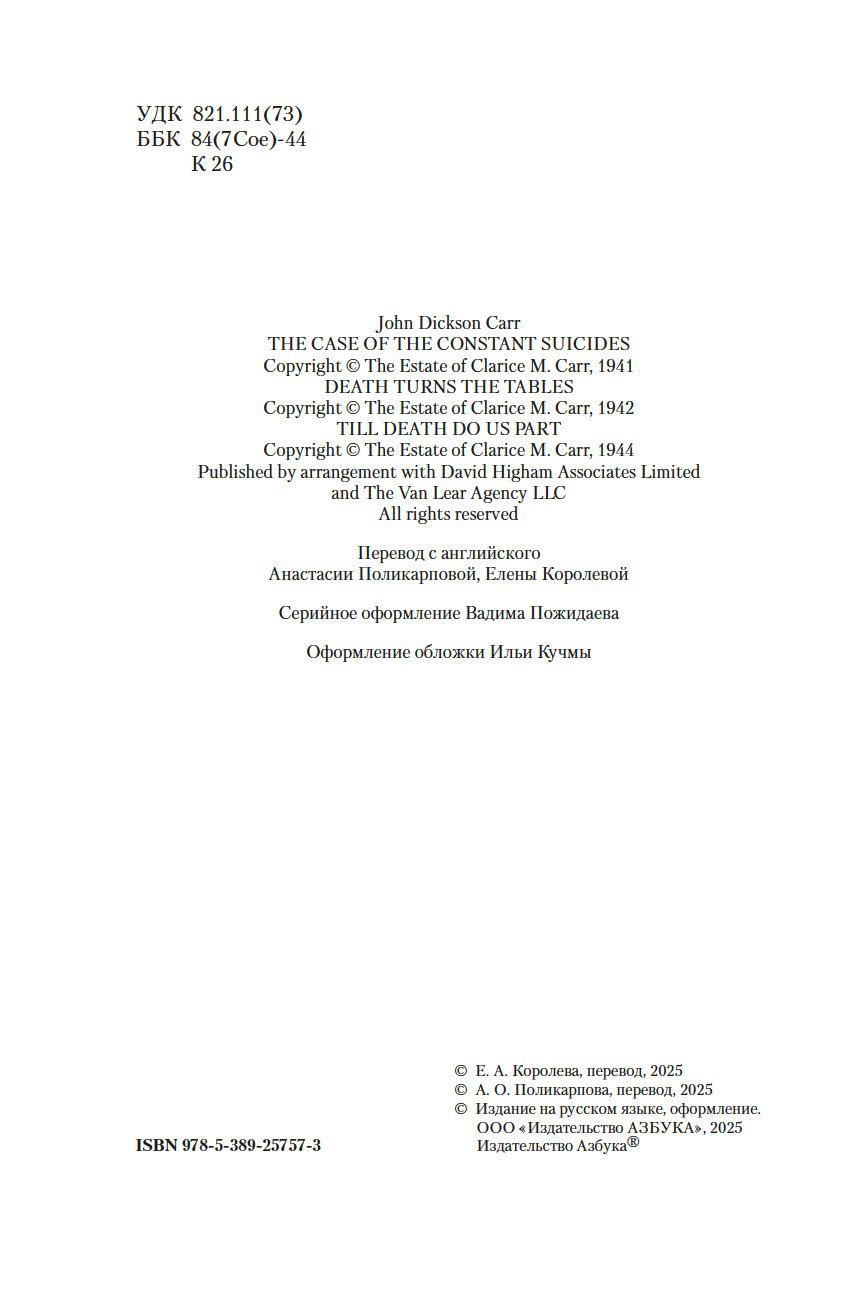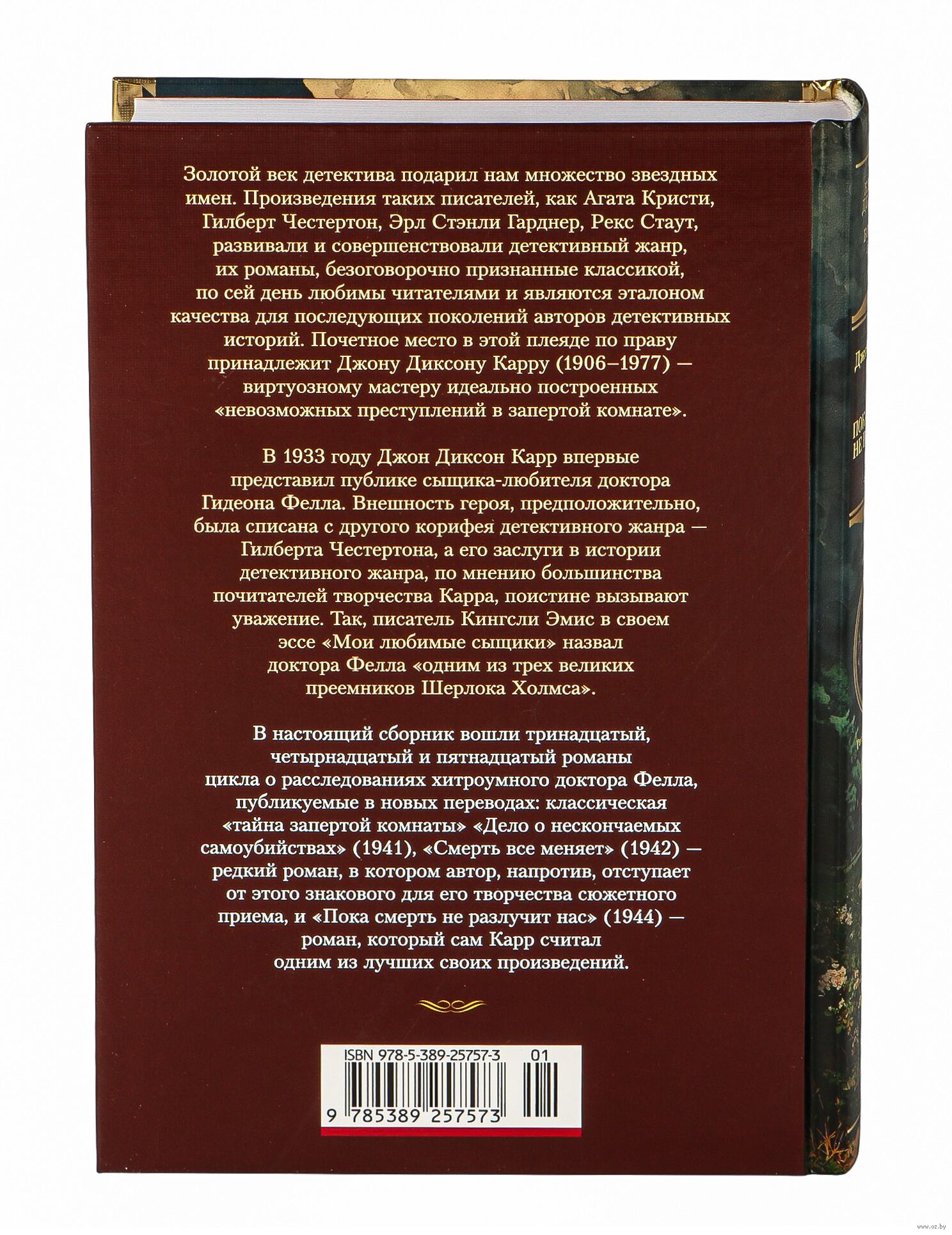 В настоящий сборник вошли тринадцатый, четырнадцатый и пятнадцатый романы цикла о расследованиях хитроумного доктора Фелла, публикуемые в новых переводах: классическая "тайна запертой комнаты" "Дело о нескончаемых самоубийствах" (1941), "Смерть все меняет" (1942) – редкий роман, в котором автор, напротив, отступает от этого знакового для его творчества сюжетного приема, и "Пока смерть не разлучит нас" (1944) – роман, который сам Карр считал одним из лучших своих произведений.