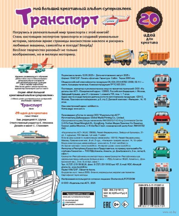 Погрузись в увлекательный мир транспорта с этой книгой! Стань настоящим экспертом транспорта и создавай уникальные истории, заполни яркие страницы множеством наклеек и раскрась любимые машины, самолёты и поезда! Вперёд!