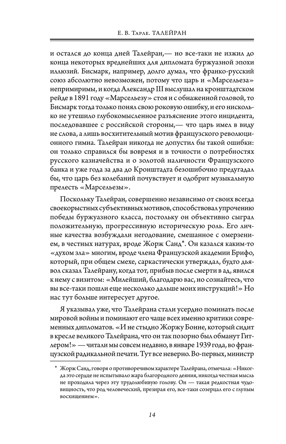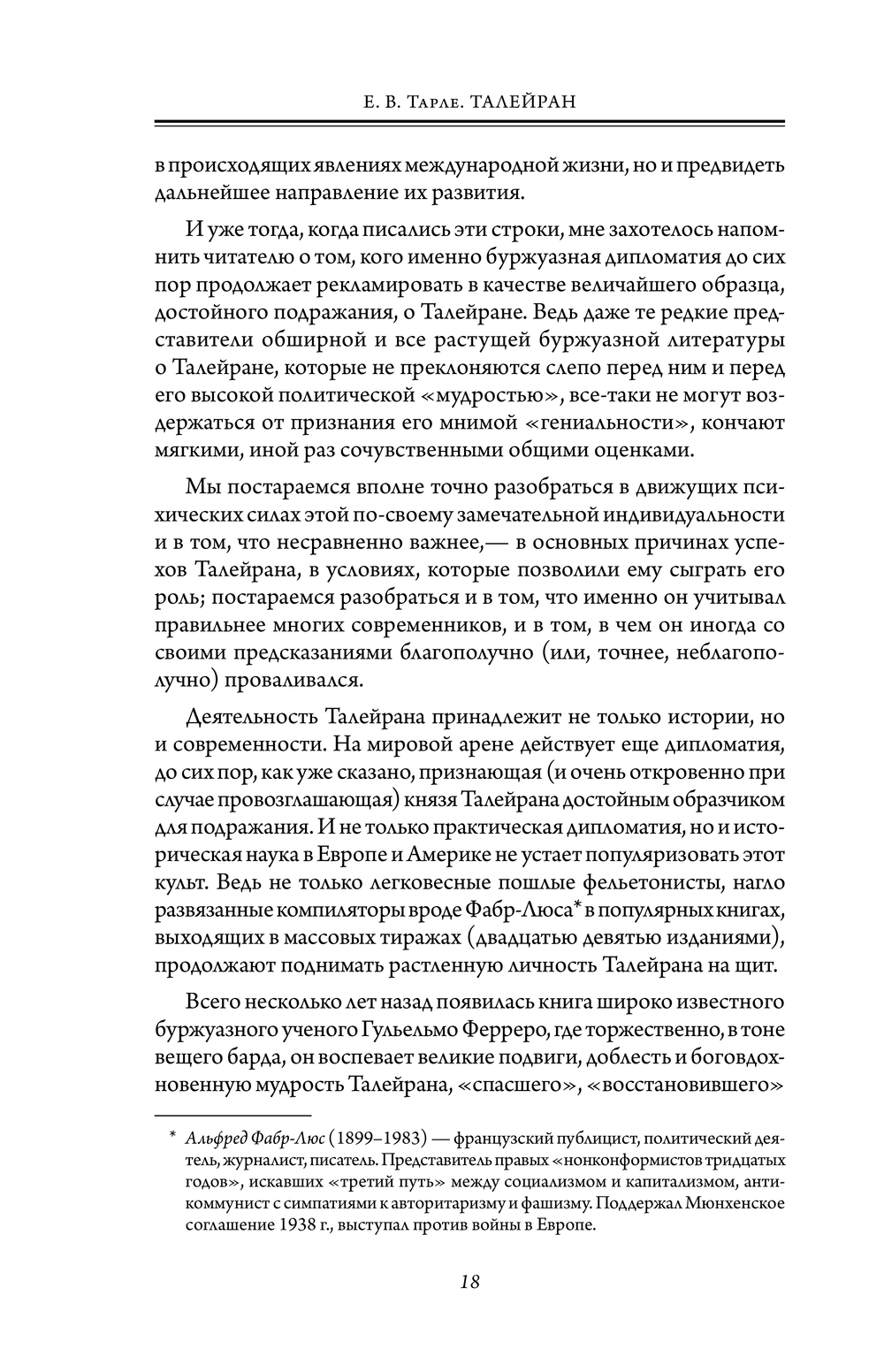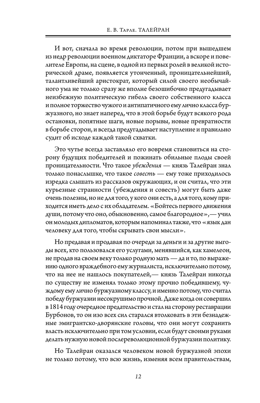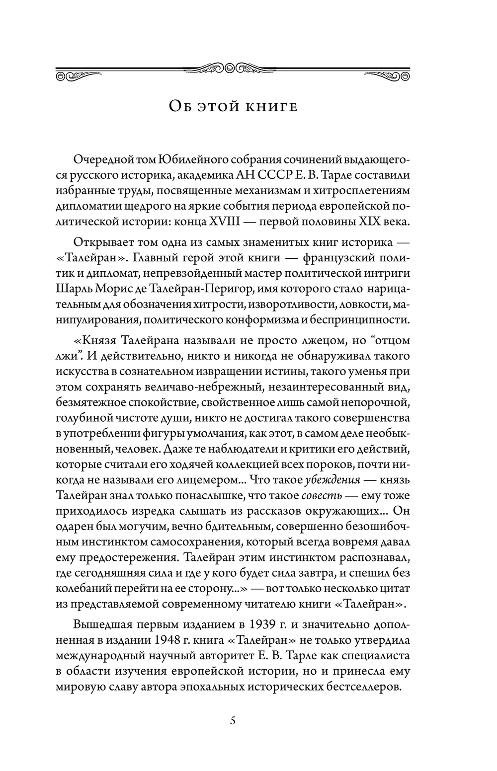 Этот том Юбилейного собрания сочинений выдающегося русского историка, академика Е. В. Тарле открывает одна из самых знаменитых его книг – "Талейран". Главный герой этого яркого исследования – французский политик и дипломат, непревзойденный мастер политической интриги Шарль Морис де Талейран-Перигор, истинный "отец лжи" европейской дипломатии, имя которого стало нарицательным для обозначения хитрости, изворотливости, ловкости, манипулирования, политического конформизма и беспринципности. Разносторонние научные знания, глубокое владение темой исследования, умение давать меткие характеристики историческим персонажам, образность, эмоциональность, ирония, то есть все то, что вкупе с пристальным вниманием к деталям является характерными чертами трудов Е. В. Тарле, в этой работе проявились во всем блеске литературного таланта автора. Неудивительно, что вышедшая первым изданием в 1939 г. и значительно дополненная в издании 1948 г. книга "Талейран" не только утвердила международный авторитет Е. В. Тарле как специалиста в области изучения европейской политики, но и принесла ему мировую славу автора эпохальных исторических бестселлеров.