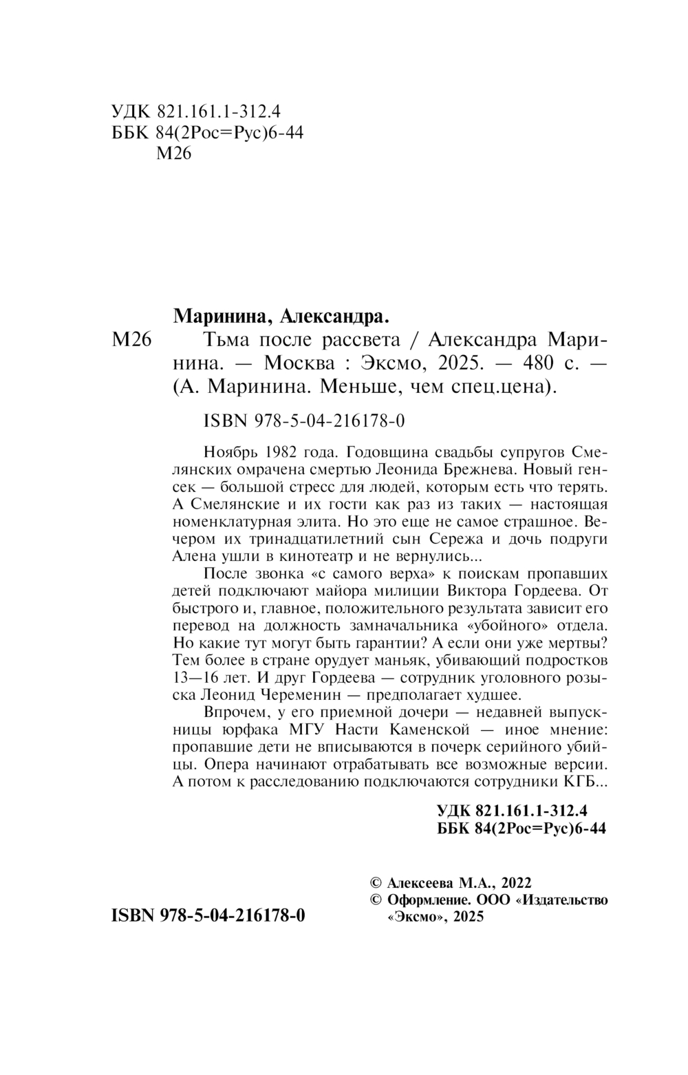 Впрочем, у его приемной дочери – недавней выпускницы юрфака МГУ Насти Каменской – иное мнение: пропавшие дети не вписываются в почерк серийного убийцы. Опера начинают отрабатывать все возможные версии. А потом к расследованию подключаются сотрудники КГБ...