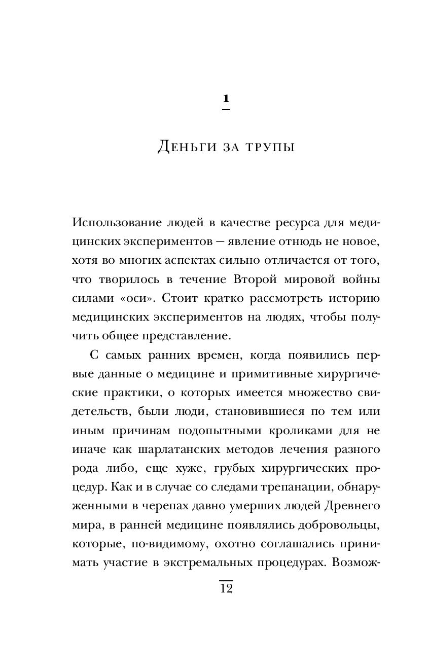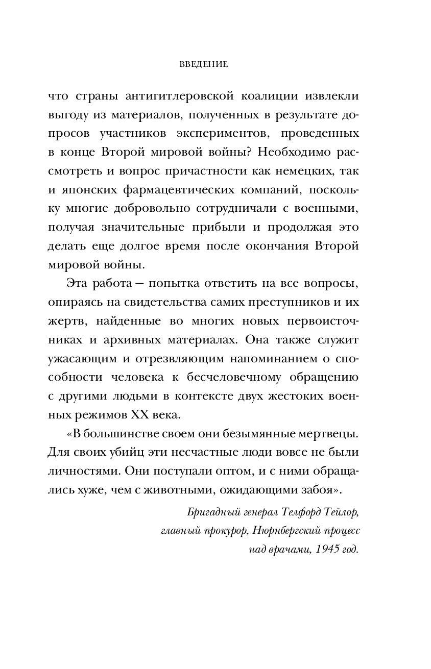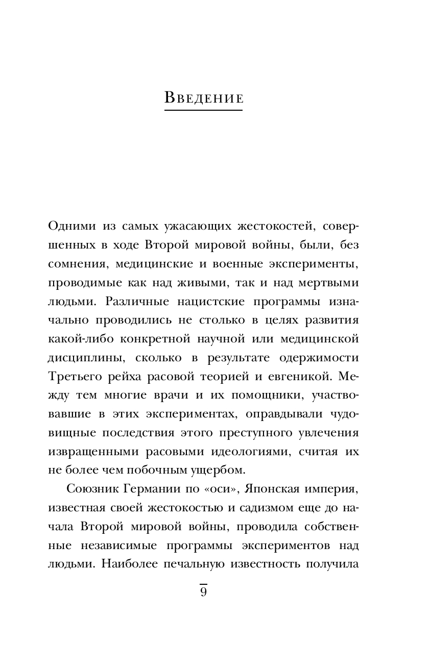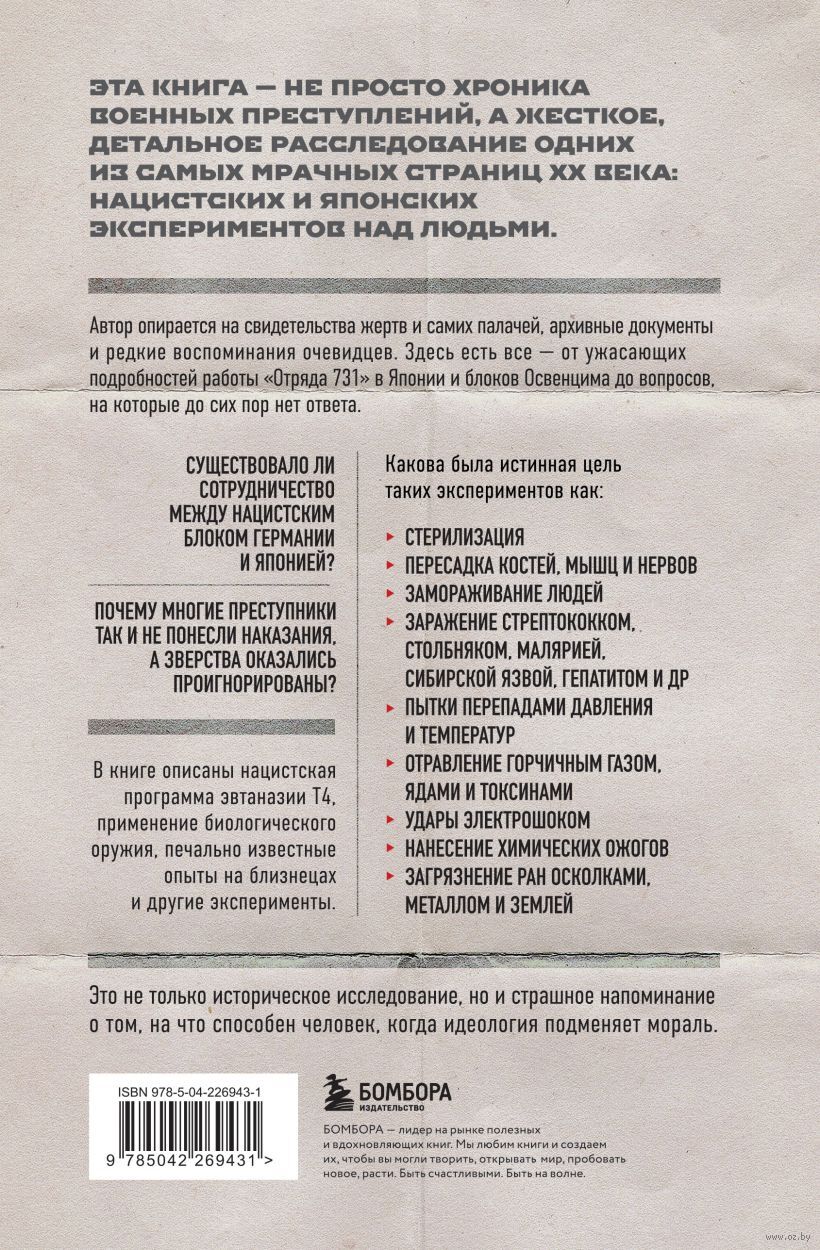 Эта книга – не просто хроника военных преступлений, а жесткое, детальное расследование одних из самых мрачных страниц XX века: нацистских и японских экспериментов над людьми. Автор опирается на свидетельства жертв и самих палачей, архивные документы и редкие воспоминания очевидцев. Здесь есть все – от ужасающих подробностей работы "Отряда 731" в Японии и блоков Освенцима до вопросов, на которые до сих пор нет полного ответа: какова была истинная цель этих экспериментов, существовало ли сотрудничество между нацистским блоком Германии и Японии, и почему многие преступники так и не понесли наказания, а зверства оказались проигнорированы.