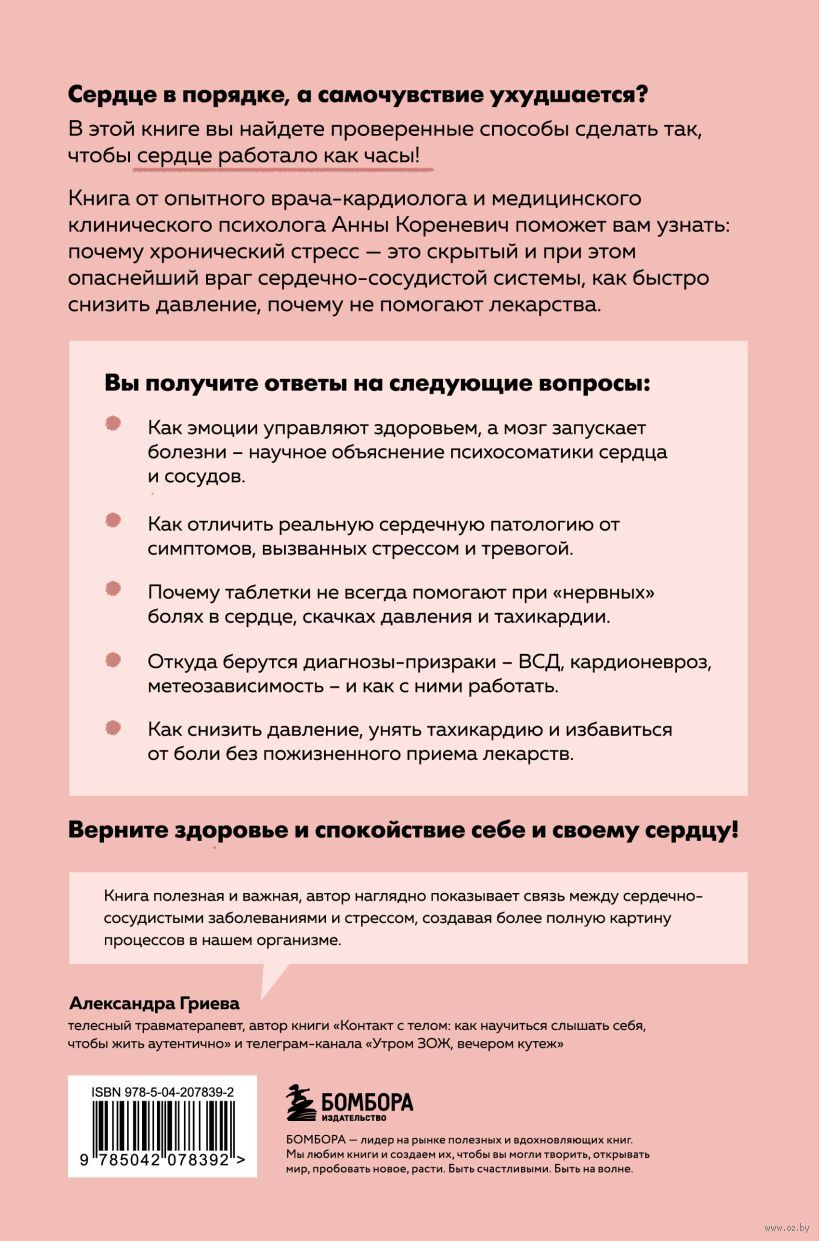 Ваше сердце в порядке, но неприятные ощущения не проходят? Эта книга поможет разобраться, почему так происходит. Автор – опытный кардиолог и психолог Анна Кореневич – простыми словами объясняет, как наше эмоциональное состояние влияет на здоровье сердца. Вы узнаете, откуда берутся "беспричинные" боли, скачки давления и учащенное сердцебиение, и что с этим делать. Здесь вы найдете не только понятные объяснения, но и практичные рекомендации.