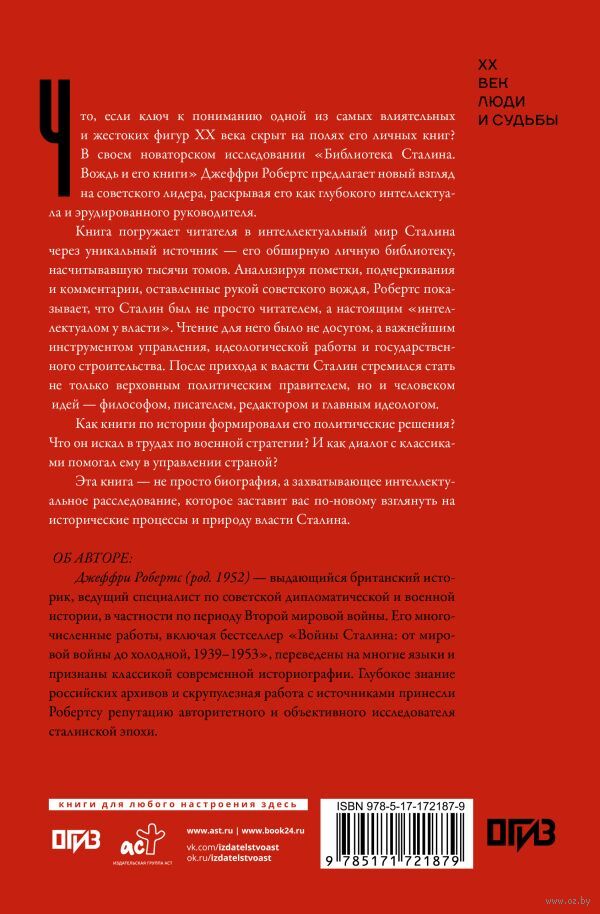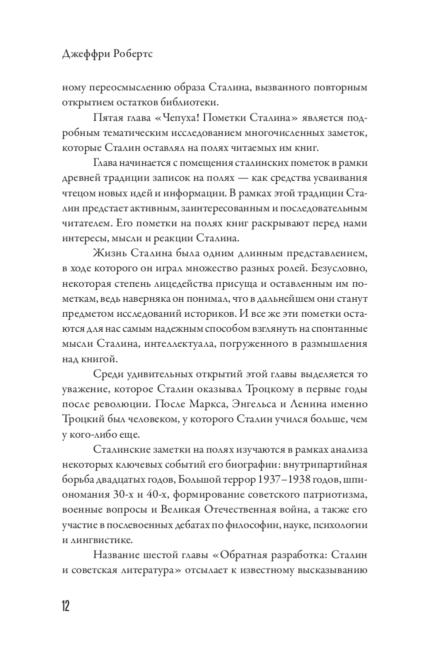 Книга погружает читателя в интеллектуальный мир Сталина через уникальный источник – его обширную личную библиотеку, насчитывавшую тысячи томов. Анализируя пометки, подчеркивания и комментарии, оставленные рукой советского вождя, Робертс показывает, что Сталин был не просто читателем, а настоящим "интеллектуалом у власти". Чтение для него было не досугом, а важнейшим инструментом управления, идеологической работы и государственного строительства. После прихода к власти Сталин стремился стать не только верховным политическим правителем, но и человеком идей – философом, писателем, редактором и главным идеологом.