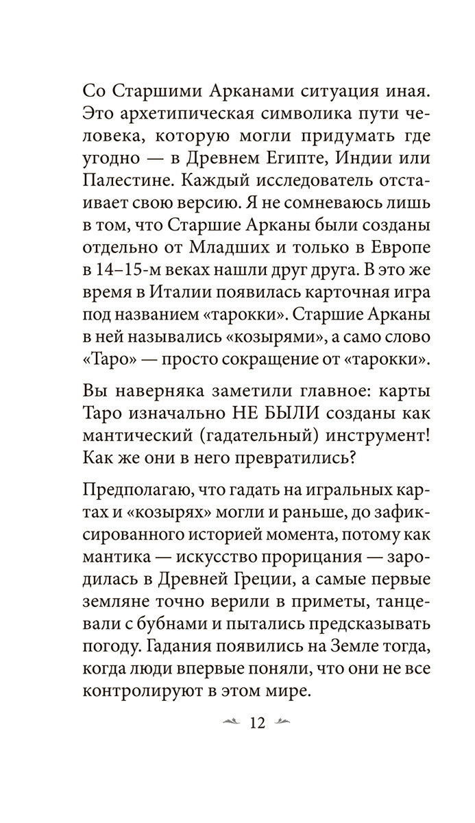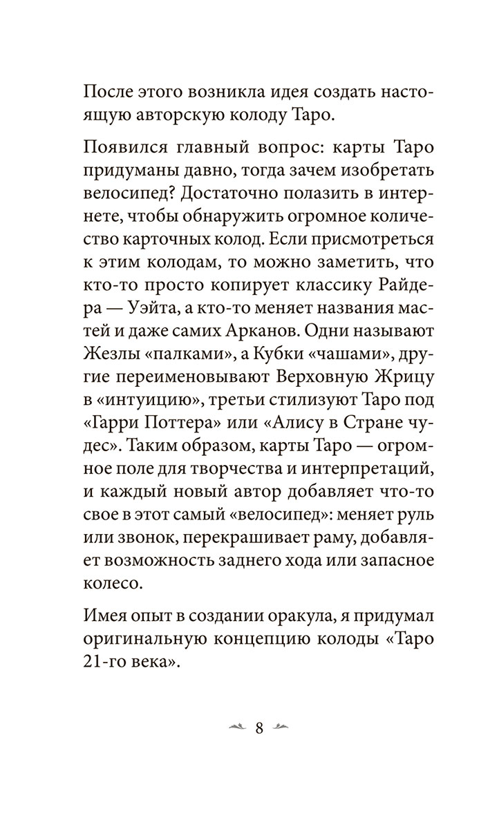 Перед вами современные карты Таро – простые, понятные, позитивные, универсальные. Изучив колоду, вы удивитесь: карты Таро – это широкая наезженная дорога к вашим целям и мечтам. "Таро 21-го века" – не только надежный путеводитель по вашей судьбе, но и добрый попутчик, мудрый советчик и мощный инструмент для познания мира. А если вы хотите помогать другим людям и стать настоящим тарологом, то "Таро 21-го века" – лучший выбор!
