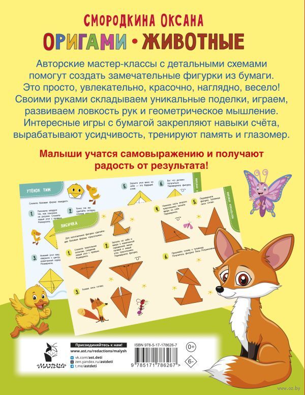 "Оригами. Животные" – самоучитель, который поможет малышу научиться складывать бумажные фигурки. Ребёнок будет рад провести время с семьёй, изучая древнее японское искусство сборки оригами. Простая инструкция по сборке поделки и иллюстрирование каждого шага облегчит обучение. 18 авторских мастер-классов будут интересны любому ребёнку: щенок, кит, пеликан, журавлик и многое другое! Творческая работа с бумагой разовьёт у ребёнка геометрическое мышление, ловкость рук, воображение, произвольное внимание и усидчивость.