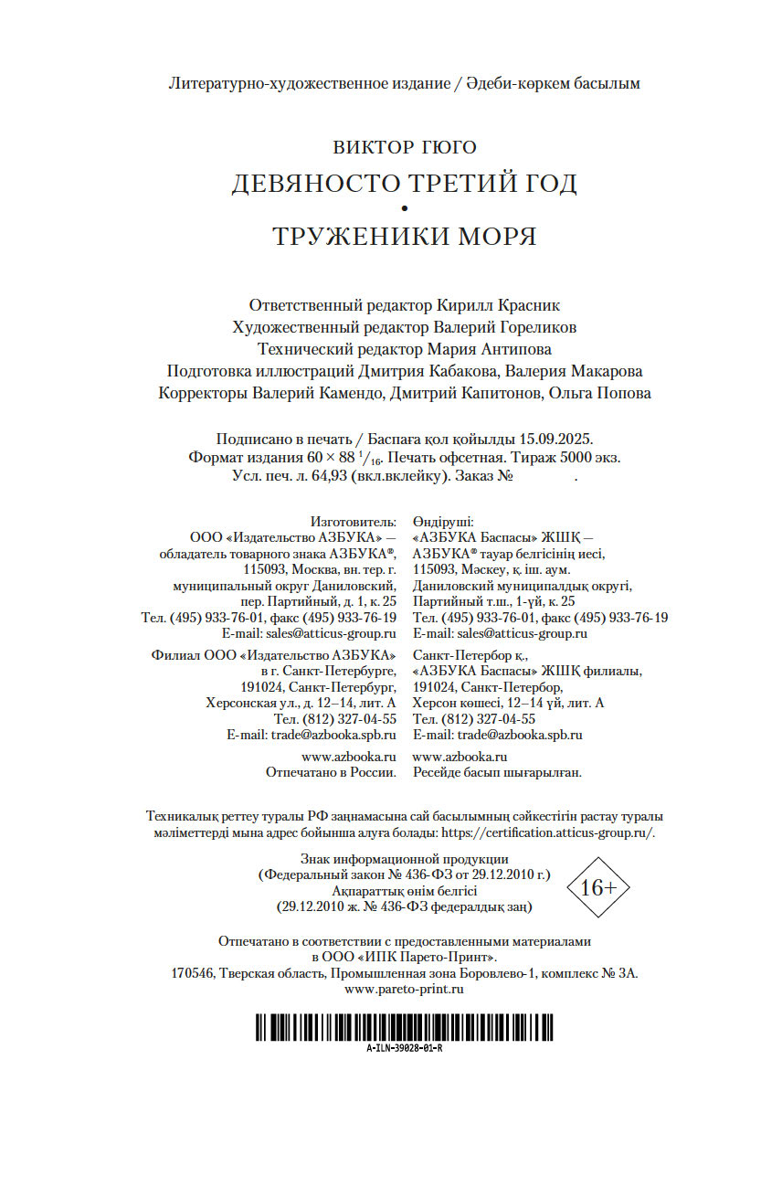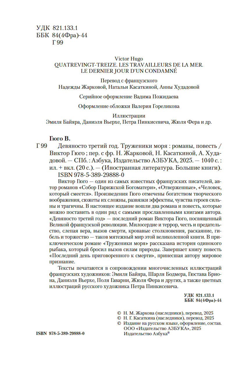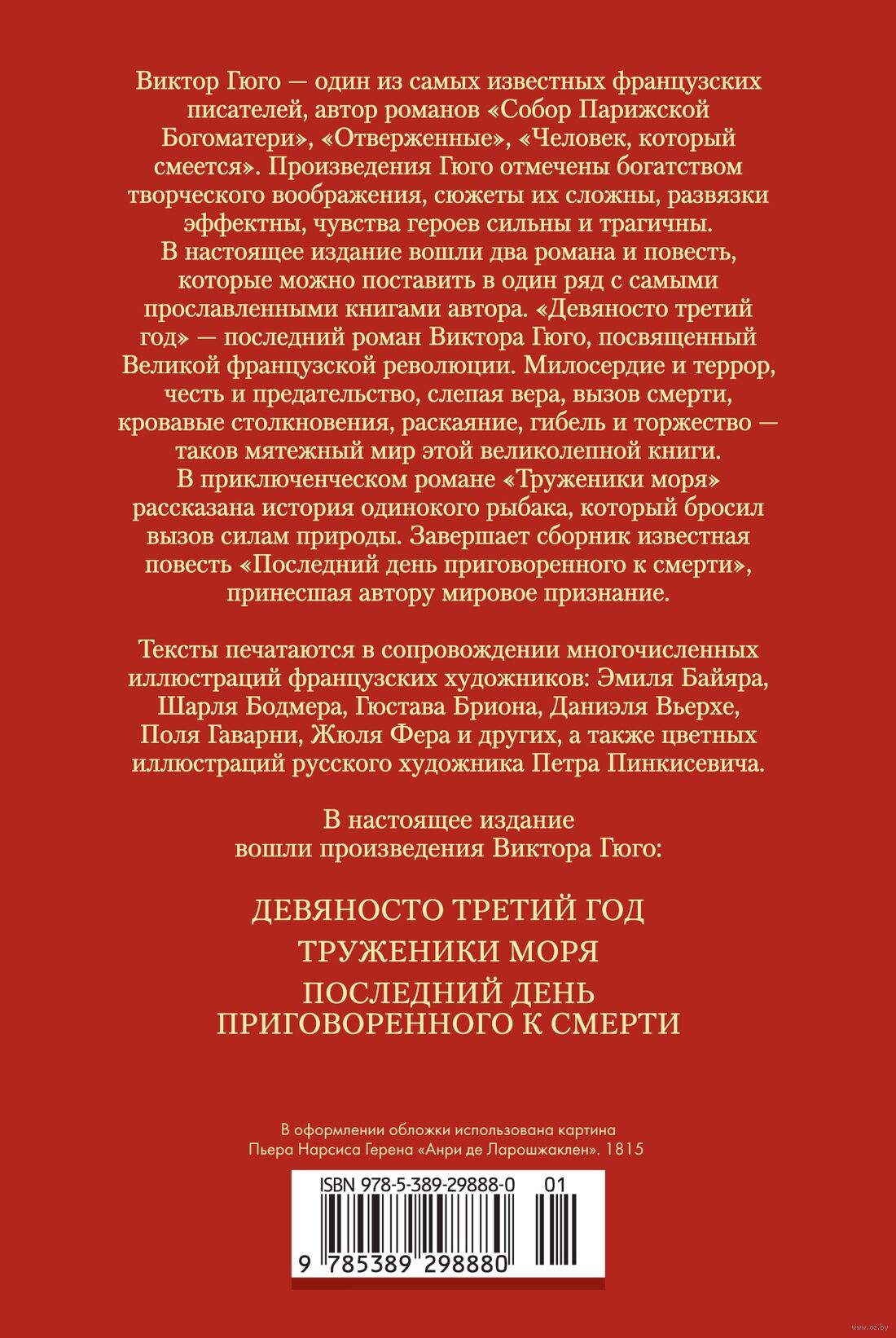 Виктор Гюго – один из самых известных французских писателей, автор романов "Собор Парижской Богоматери", "Отверженные", "Человек, который смеется". Произведения Гюго отмечены богатством творческого воображения, сюжеты их сложны, развязки эффектны, чувства героев сильны и трагичны. В настоящее издание вошли два романа и повесть, которые можно поставить в один ряд с самыми прославленными книгами автора. "Девяносто третий год" – последний роман Виктора Гюго, посвященный Великой французской революции. Милосердие и террор, честь и предательство, слепая вера, вызов смерти, кровавые столкновения, раскаяние, гибель и торжество – таков мятежный мир этой великолепной книги. В приключенческом романе "Труженики моря" рассказана история одинокого рыбака, который бросил вызов силам природы. Завершает книгу повесть "Последний день приговоренного к смерти", принесшая автору мировое признание.