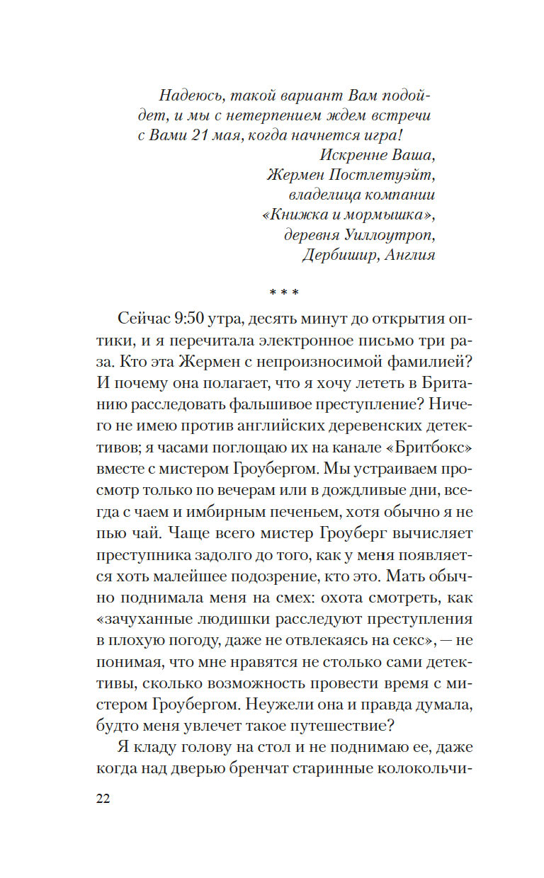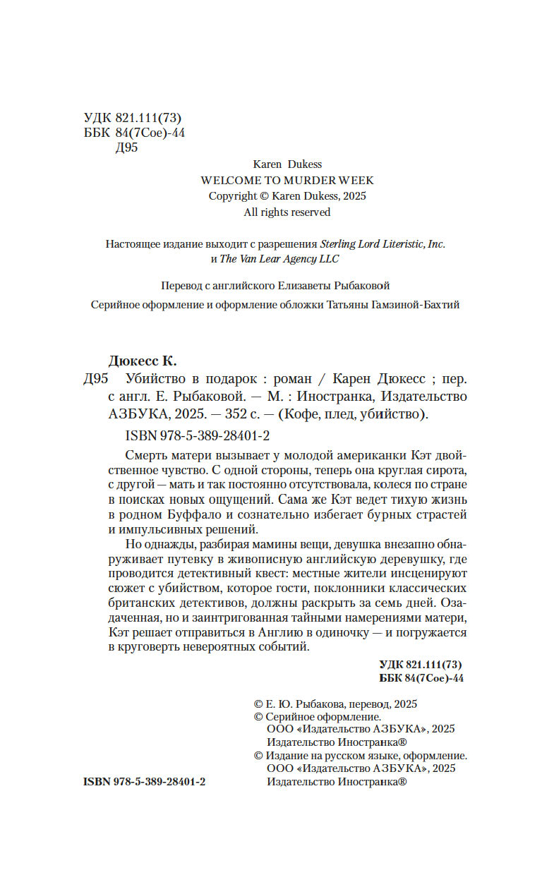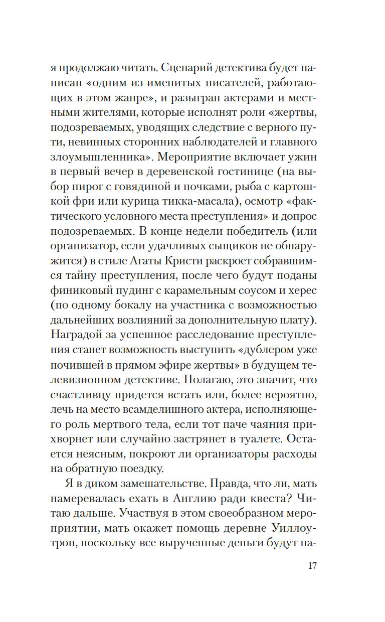 Но однажды, разбирая мамины вещи, девушка внезапно обнаруживает путевку в живописную английскую деревушку, где проводится детективный квест: местные жители инсценируют сюжет с убийством, которое гости, поклонники классических британских детективов, должны раскрыть за семь дней. Озадаченная, но и заинтригованная тайными намерениями матери, Кэт решает отправиться в Англию в одиночку – и погружается в круговерть невероятных событий.