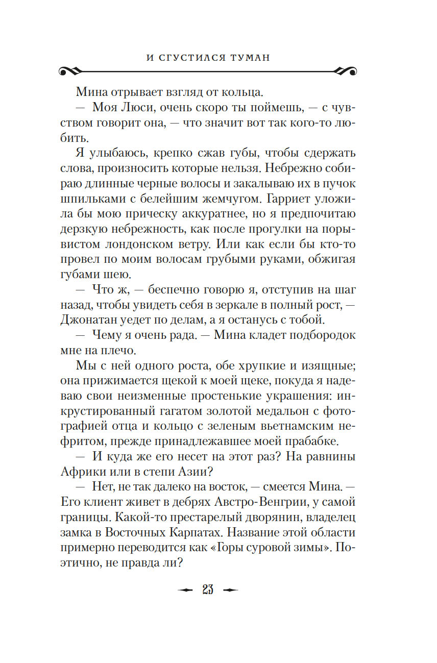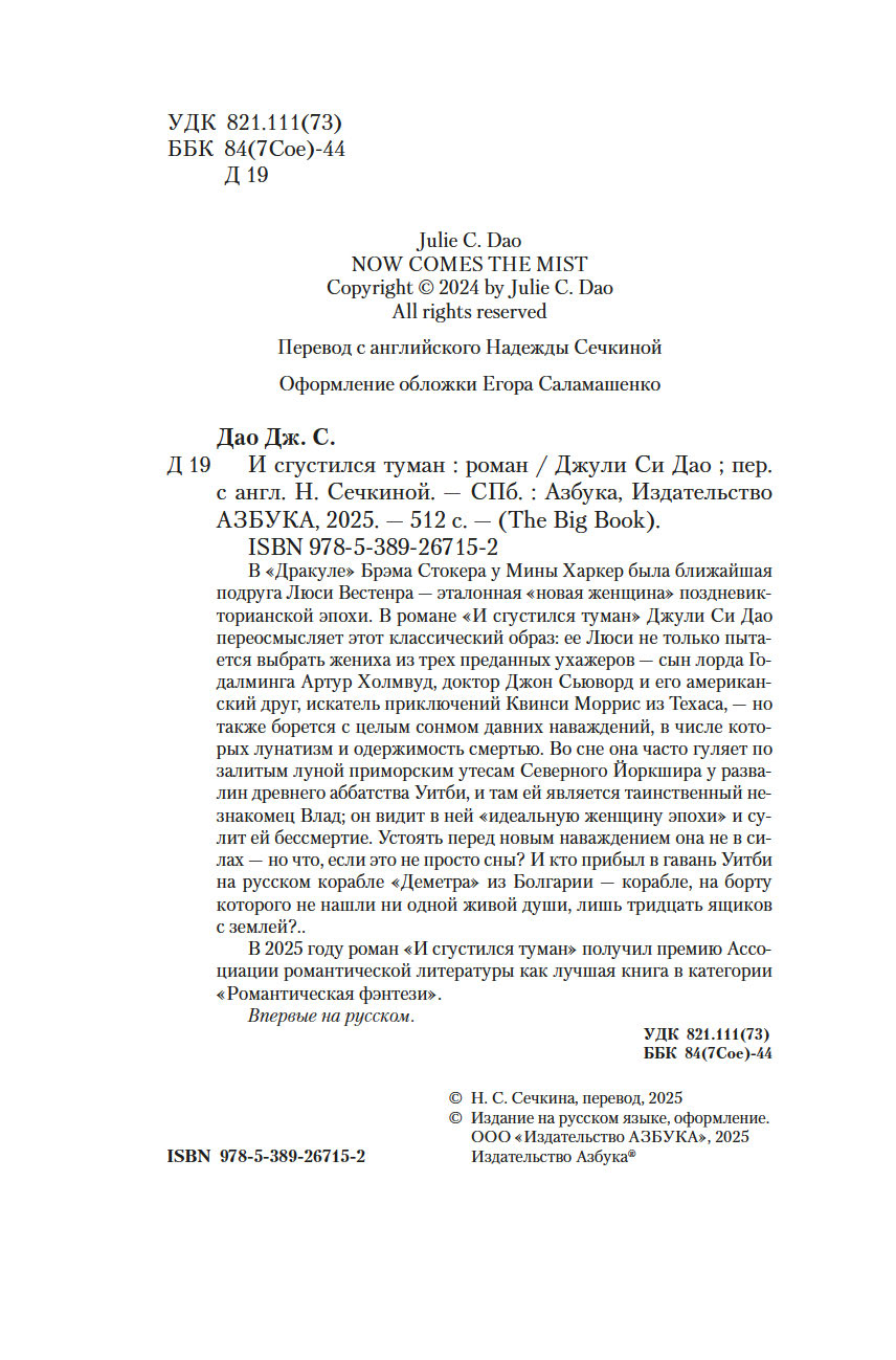 В "Дракуле" Брэма Стокера у Мины Харкер была ближайшая подруга Люси Вестенра – эталонная "новая женщина" поздневикторианской эпохи. В романе "И сгустился туман" Джули Си Дао переосмысляет этот классический образ: ее Люси не только пытается выбрать жениха из трех преданных ухажеров – сын лорда Годалминга Артур Холмвуд, доктор Джон Сьюворд и его американский друг, искатель приключений Квинси Моррис из Техаса, – но также борется с целым сонмом давних наваждений, в числе которых лунатизм и одержимость смертью. Во сне она часто гуляет по залитым луной приморским утесам Северного Йоркшира у развалин древнего аббатства Уитби, и там ей является таинственный незнакомец Влад; он видит в ней "идеальную женщину эпохи" и сулит ей бессмертие. Устоять перед новым наваждением она не в силах – но что, если это не просто сны? И кто прибыл в гавань Уитби на русском корабле "Деметра" из Болгарии – корабле, на борту которого не нашли ни одной живой души, лишь тридцать ящиков с землей?..