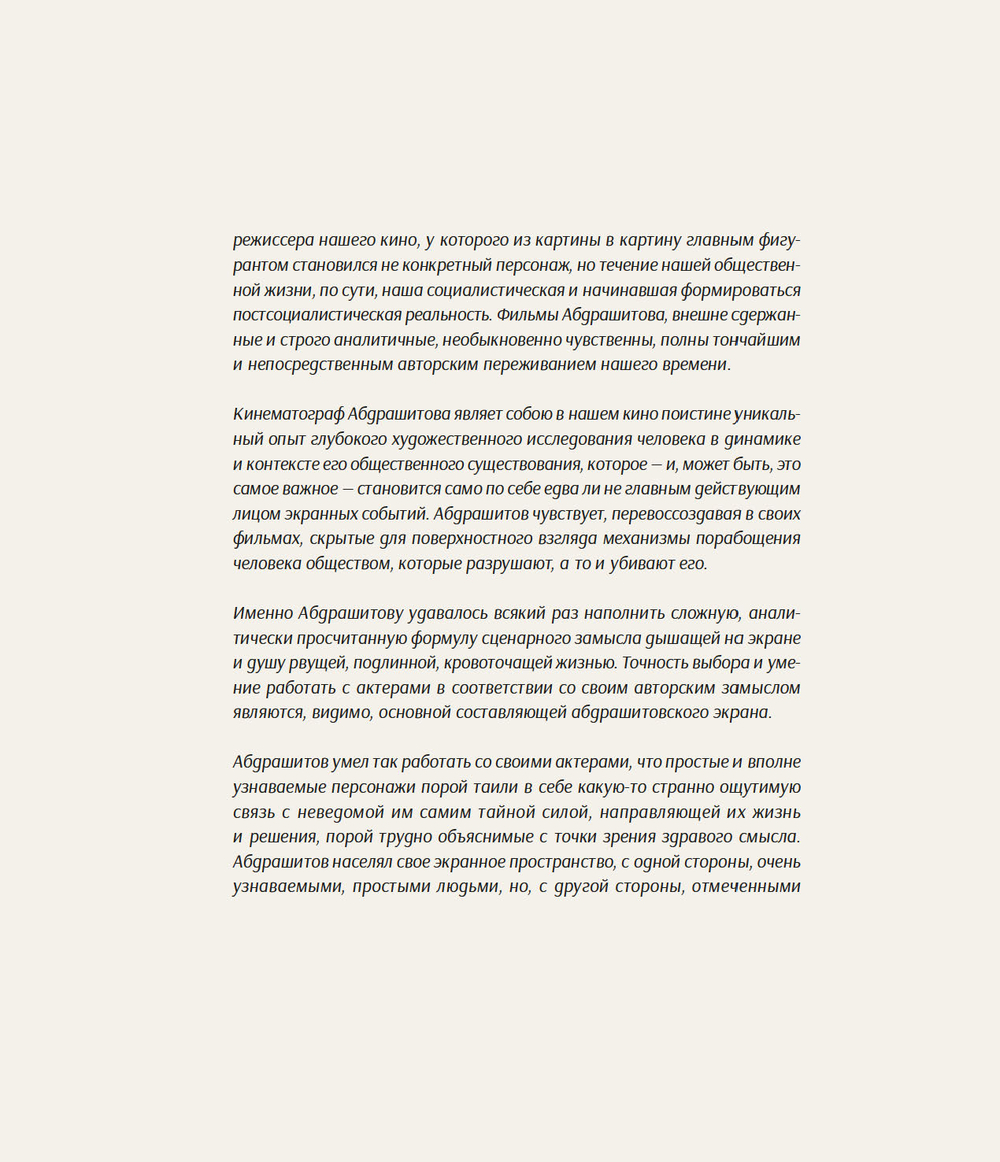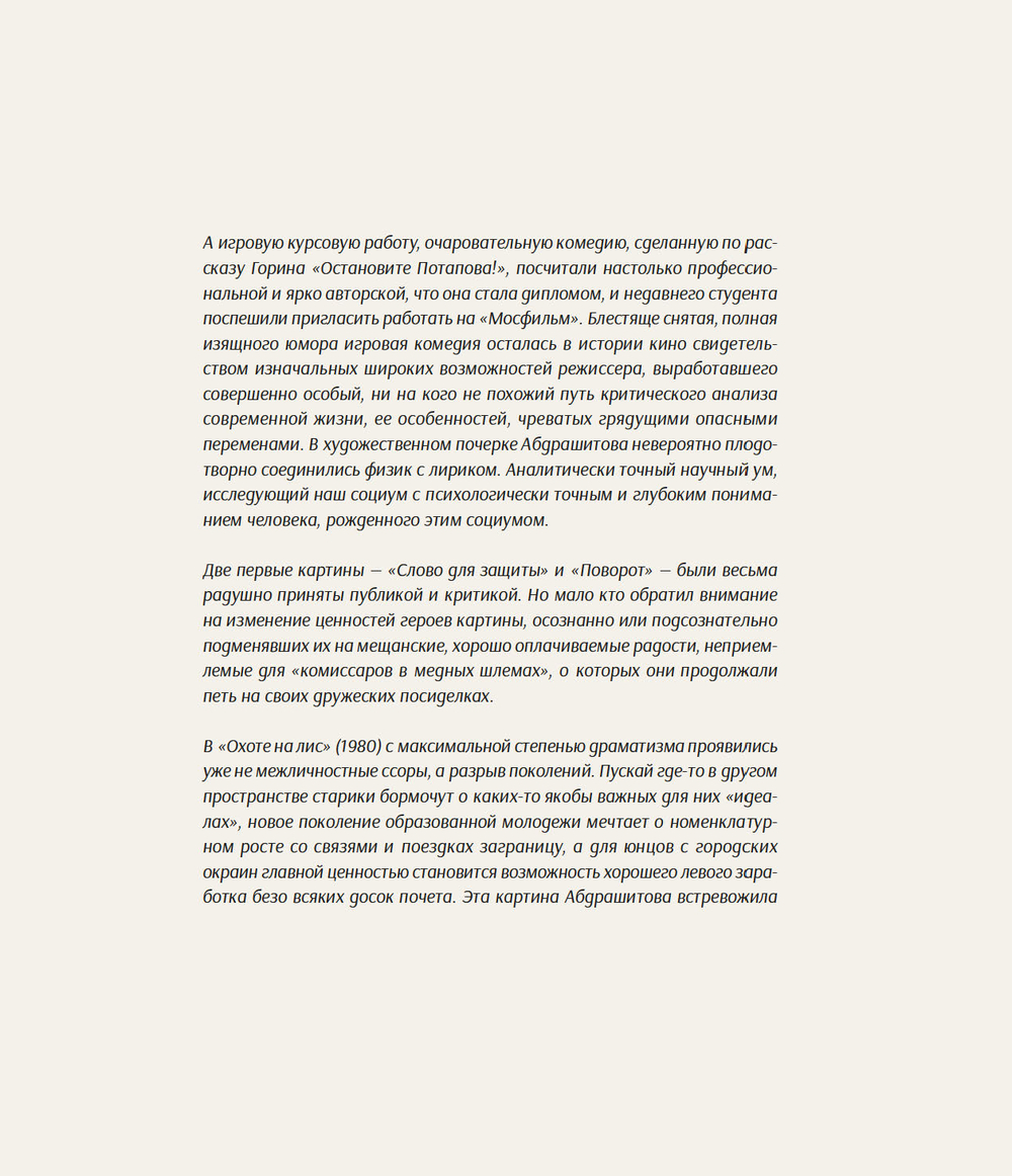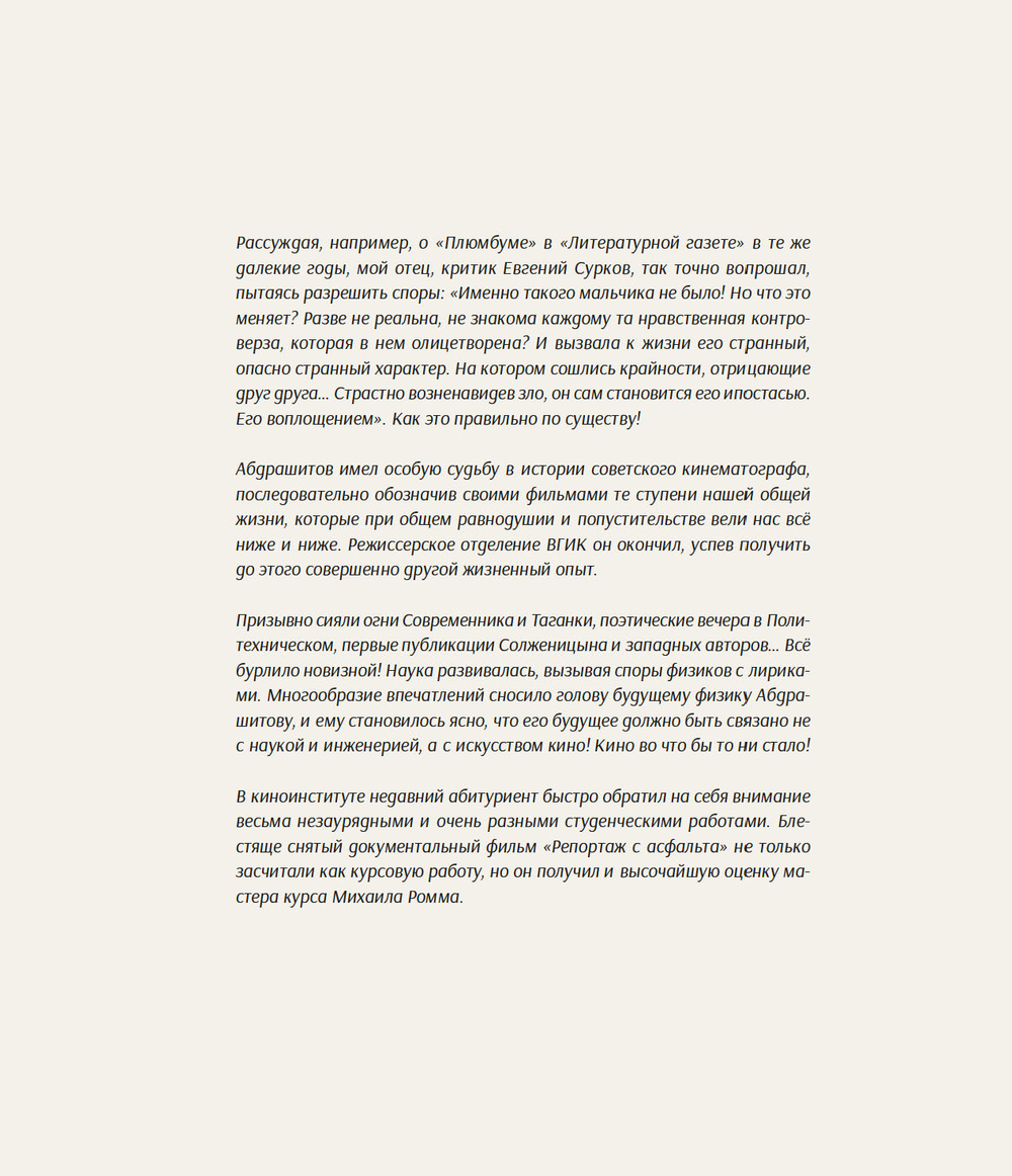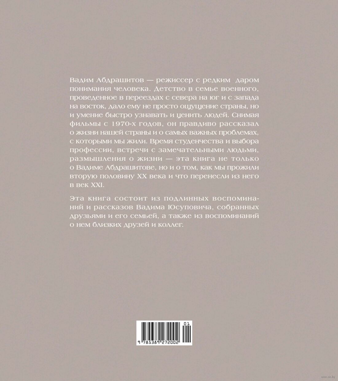 Вадим Абдрашитов родился ровно в год окончания Второй мировой войны. Снимая с 70-х годов фильмы, он очень правдиво рассказал о жизни нашей страны во второй половине ХХ века и о самых важных проблемах, с которыми мы сталкивались. Время ученичества и выбора профессии, встречи с замечательными людьми, его размышления о жизни, рассказы о нем других людей – это книга не только об Абдрашитове, но о том, как мы прожили вторую половину ХХ-го века и что мы перенесли из него в век XXI-й.