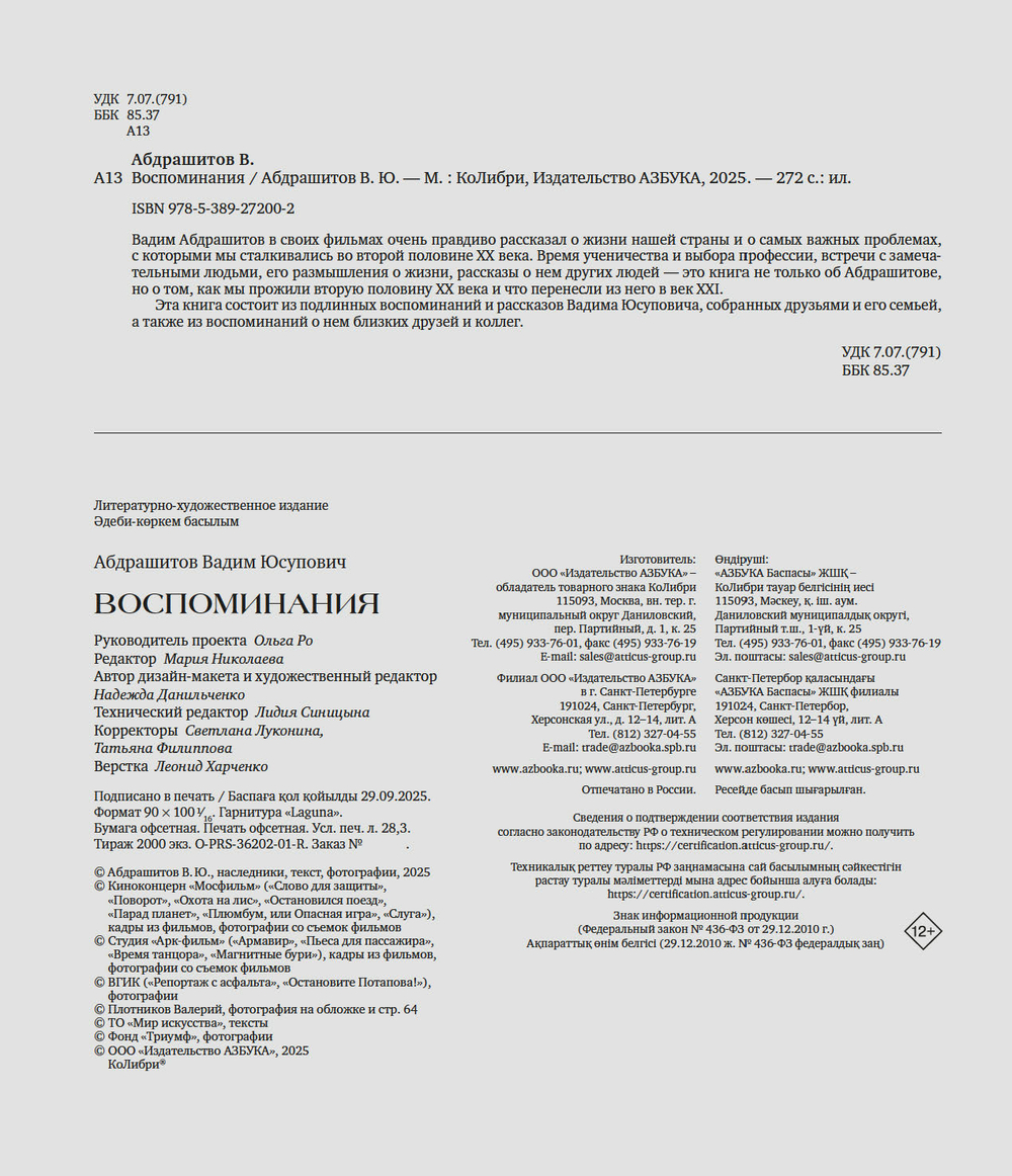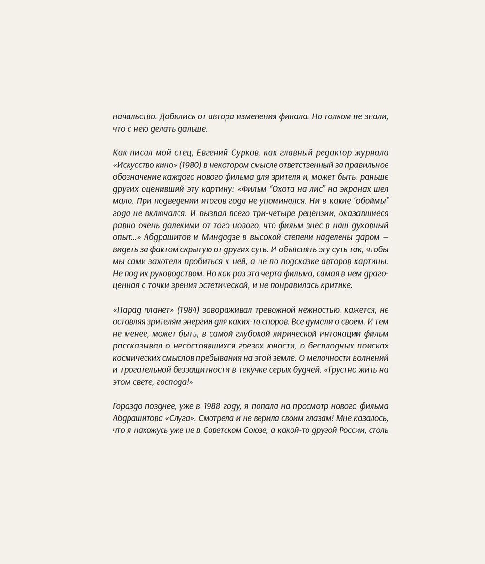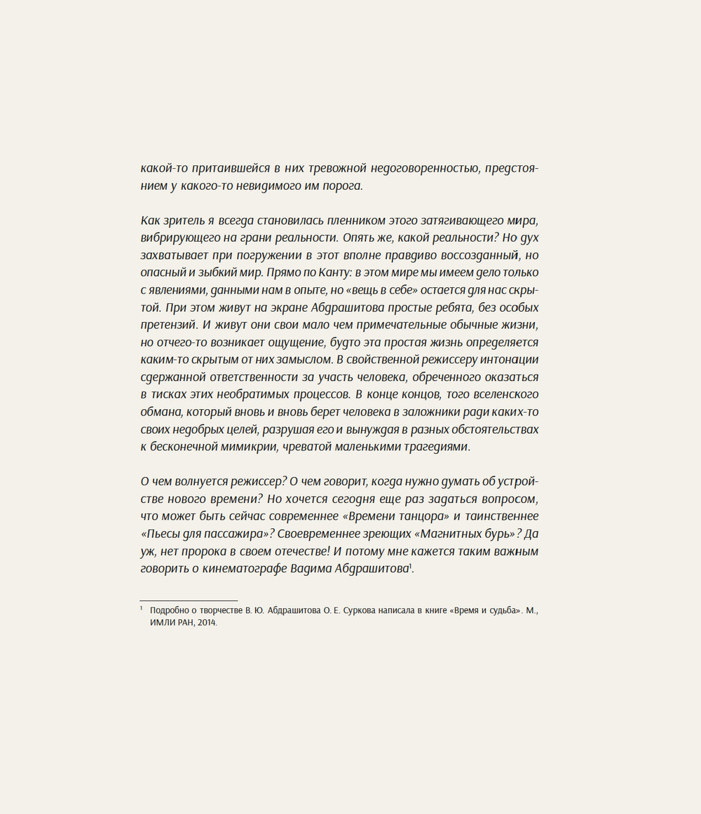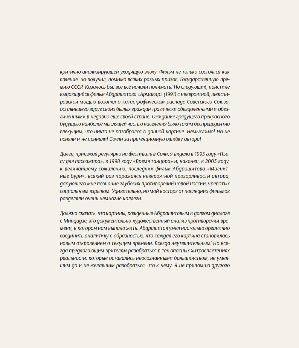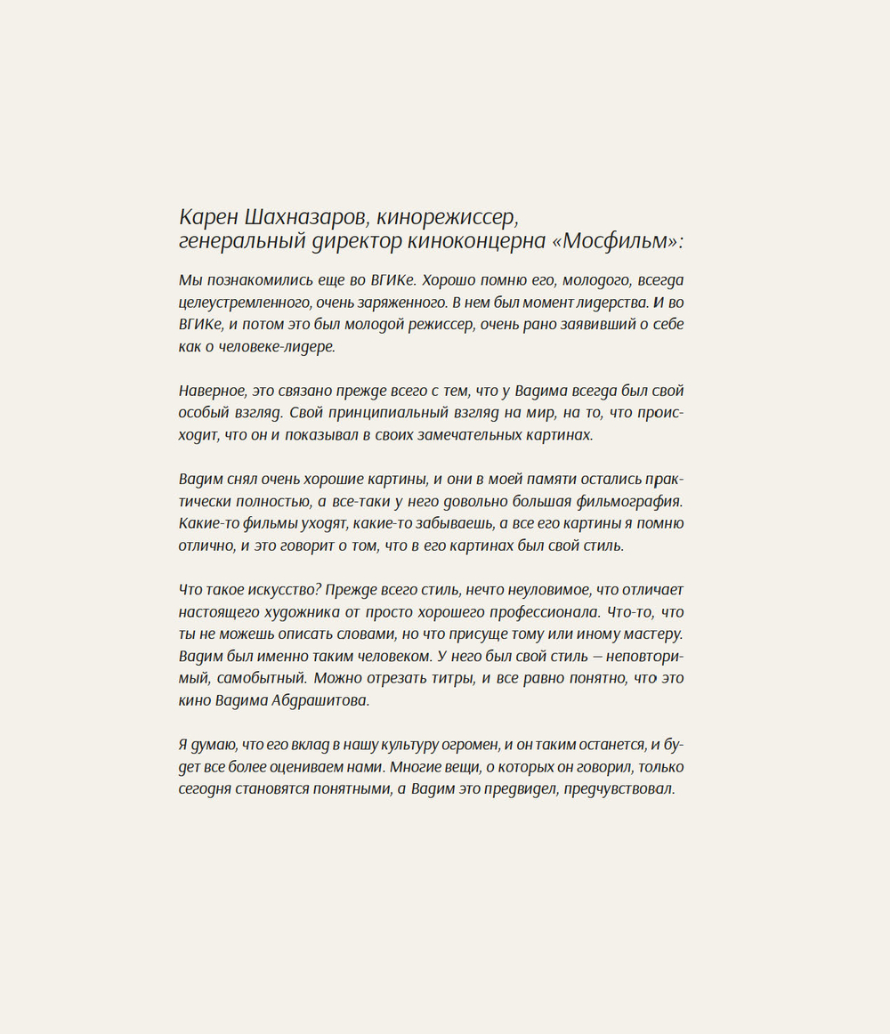Вадим Абдрашитов родился ровно в год окончания Второй мировой войны. Снимая с 70-х годов фильмы, он очень правдиво рассказал о жизни нашей страны во второй половине ХХ века и о самых важных проблемах, с которыми мы сталкивались. Время ученичества и выбора профессии, встречи с замечательными людьми, его размышления о жизни, рассказы о нем других людей – это книга не только об Абдрашитове, но о том, как мы прожили вторую половину ХХ-го века и что мы перенесли из него в век XXI-й.