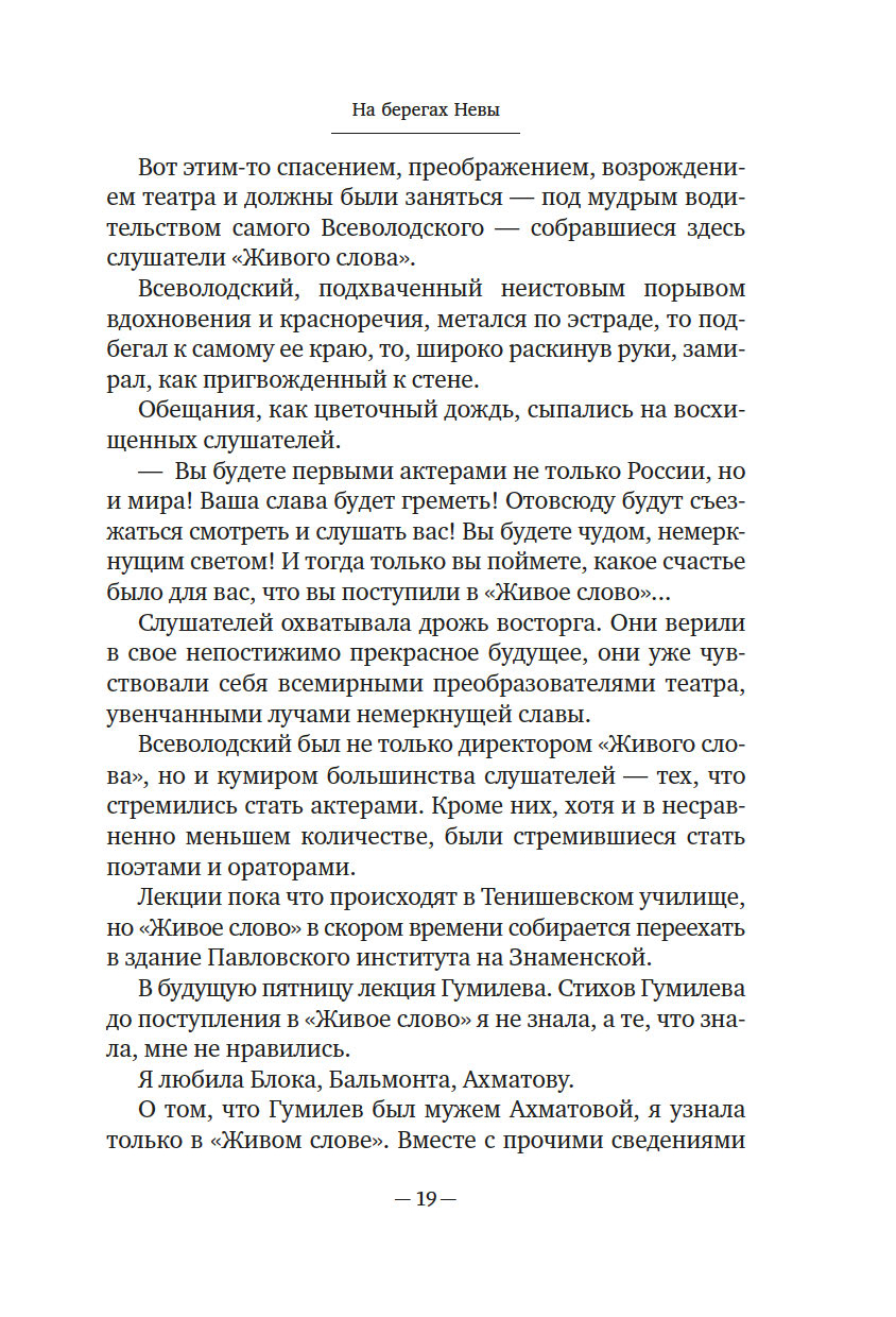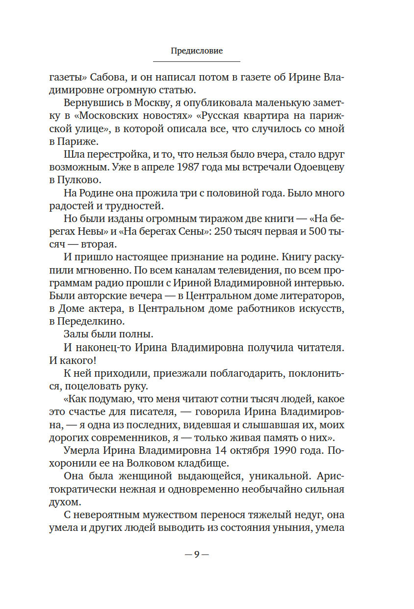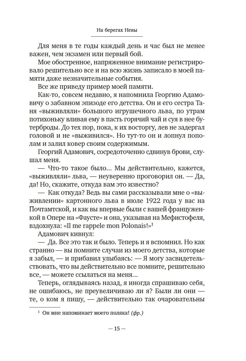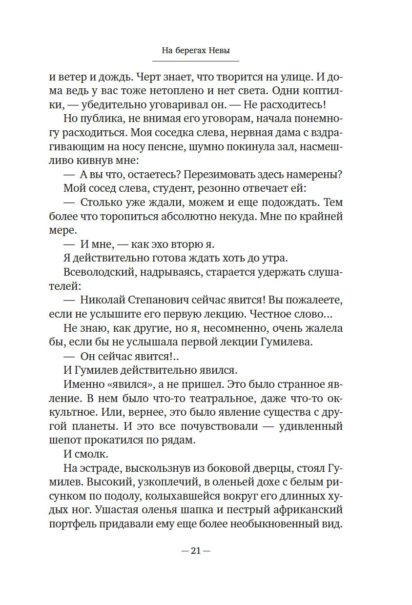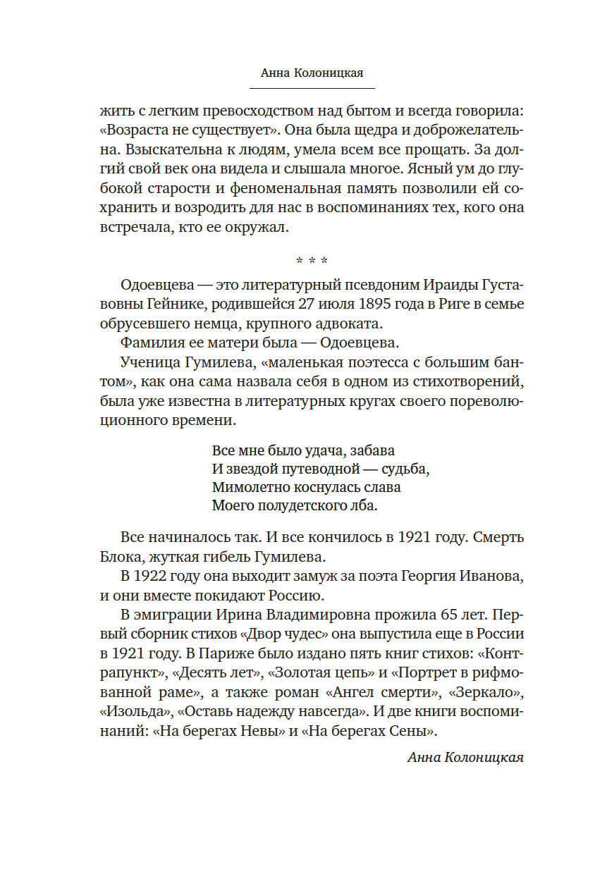 "Я пишу не о себе и не для себя, а о тех, кого мне было дано узнать... Я пишу о них и для них. О себе я стараюсь говорить как можно меньше..." – написала в предисловии к своим мемуарам Ирина Одоевцева – русская поэтесса, любимая ученица Николая Гумилева, в 1922 году покинувшая Россию. Она прожила долгую жизнь и вернулась на родину в 1987 году – последняя представительница далекого Cеребряного века. Ее воспоминания "На берегах Невы" были изданы в России в конце 1980-х годов колоссальным тиражом – 150 000 и были воприняты как откровение. И в наши дни эта книга – памятник эпохе, ее живое свидетельство – читается с огромным интересом. На ее страницах предстают Николай Гумилев, Анна Ахматова, Георгий Иванов, Осип Мандельштам, Владимир Маяковский... Феноменальная память Одоевцевой позволила ей и через много десятков лет воспроизвести разговоры, дискуссии, споры того времени.