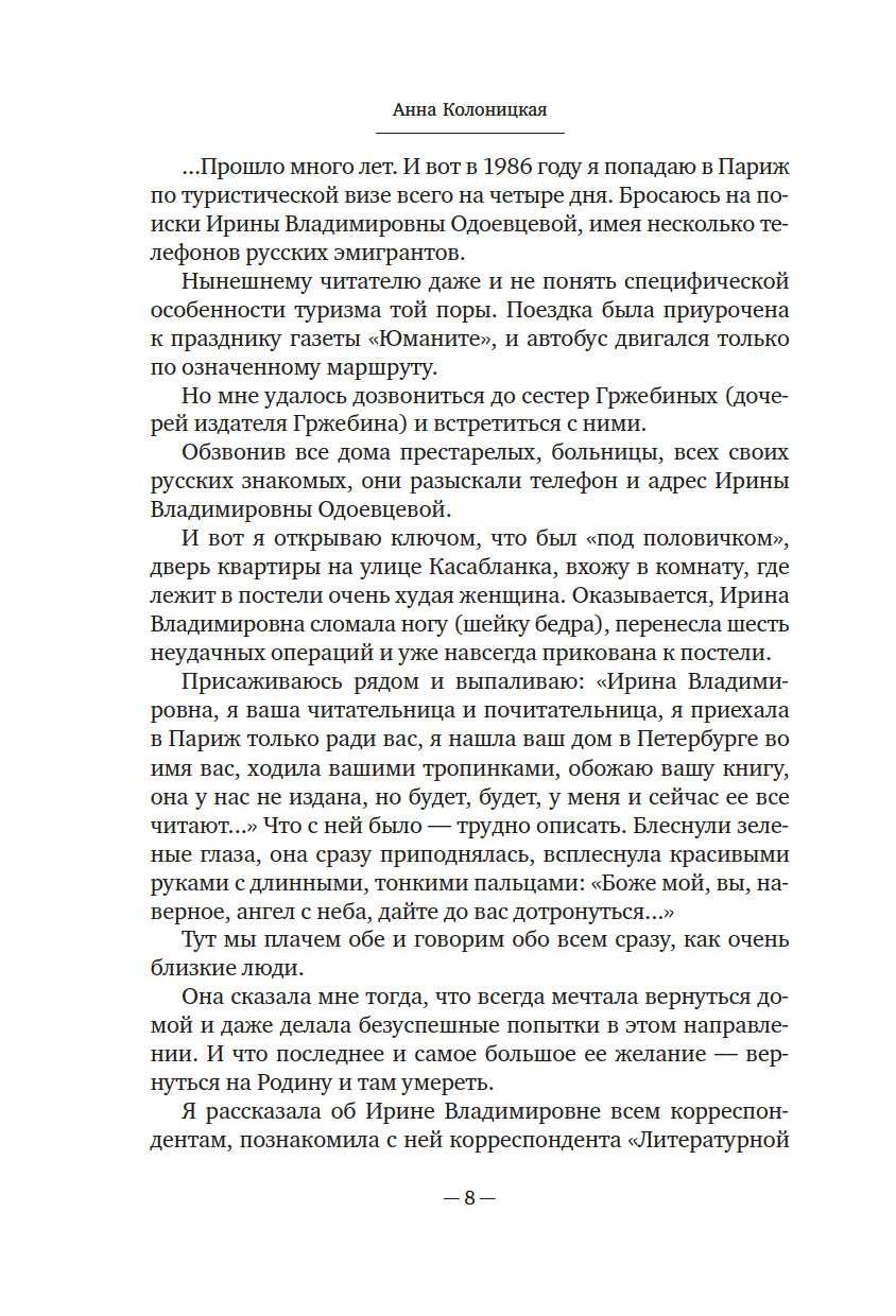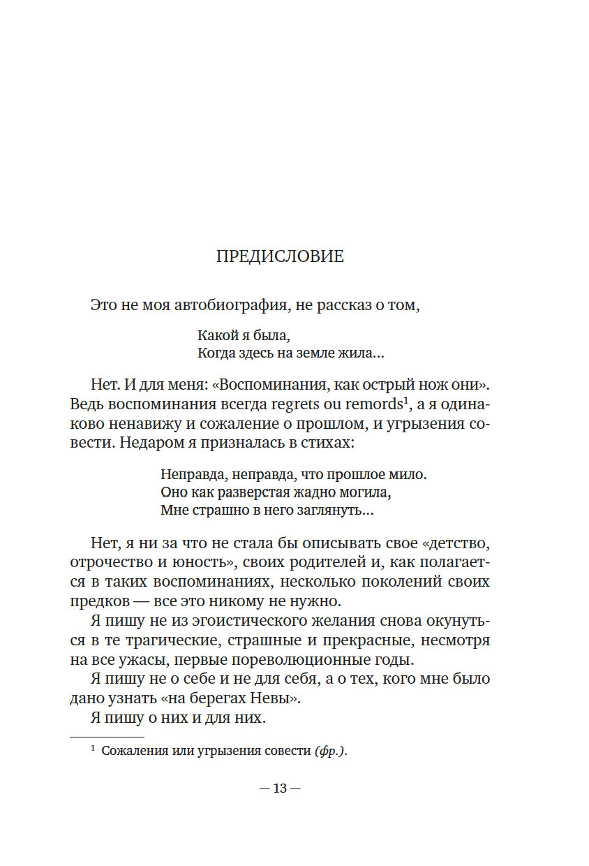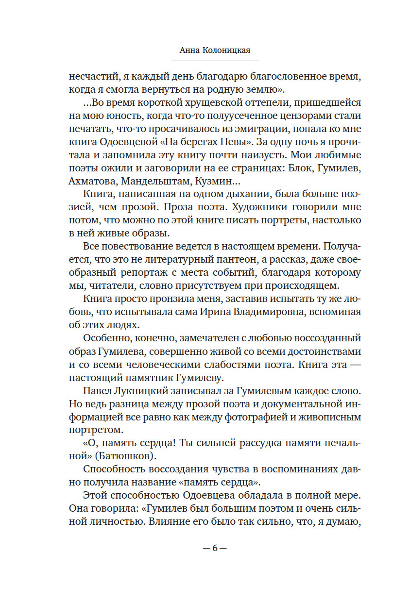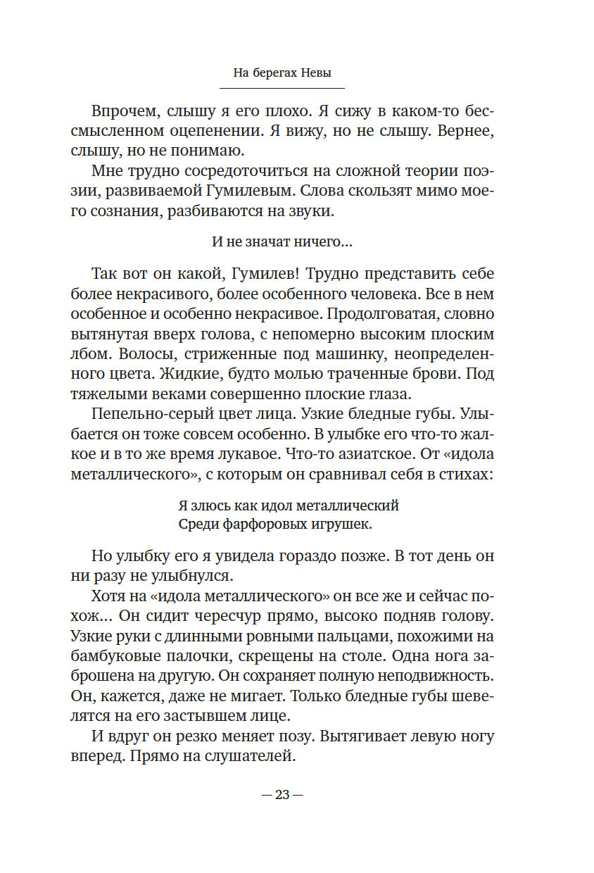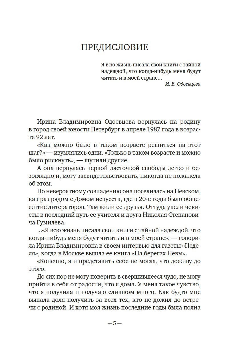 "Я пишу не о себе и не для себя, а о тех, кого мне было дано узнать... Я пишу о них и для них. О себе я стараюсь говорить как можно меньше..." – написала в предисловии к своим мемуарам Ирина Одоевцева – русская поэтесса, любимая ученица Николая Гумилева, в 1922 году покинувшая Россию. Она прожила долгую жизнь и вернулась на родину в 1987 году – последняя представительница далекого Cеребряного века. Ее воспоминания "На берегах Невы" были изданы в России в конце 1980-х годов колоссальным тиражом – 150 000 и были воприняты как откровение. И в наши дни эта книга – памятник эпохе, ее живое свидетельство – читается с огромным интересом. На ее страницах предстают Николай Гумилев, Анна Ахматова, Георгий Иванов, Осип Мандельштам, Владимир Маяковский... Феноменальная память Одоевцевой позволила ей и через много десятков лет воспроизвести разговоры, дискуссии, споры того времени.