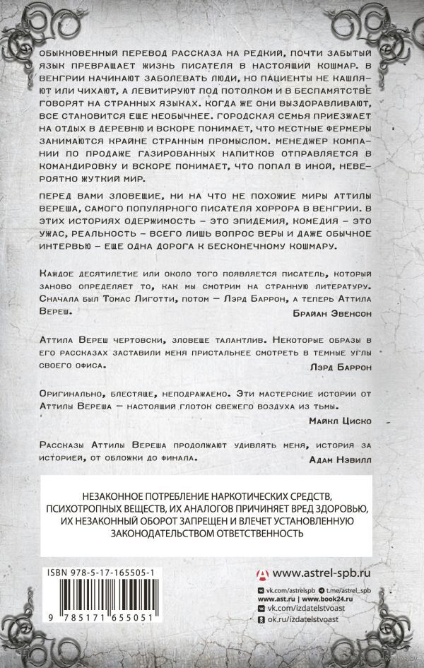 Перед вами зловещие, ни на что не похожие миры Аттилы Вереша, самого популярного писателя хоррора в Венгрии. В этих историях одержимость – это эпидемия, комедия – это ужас, реальность – всего лишь вопрос веры и даже обычное интервью – еще одна дорога к бесконечному кошмару.