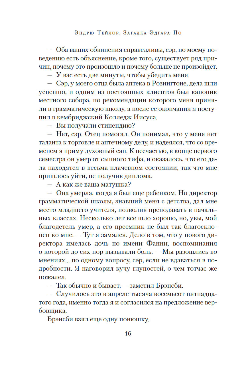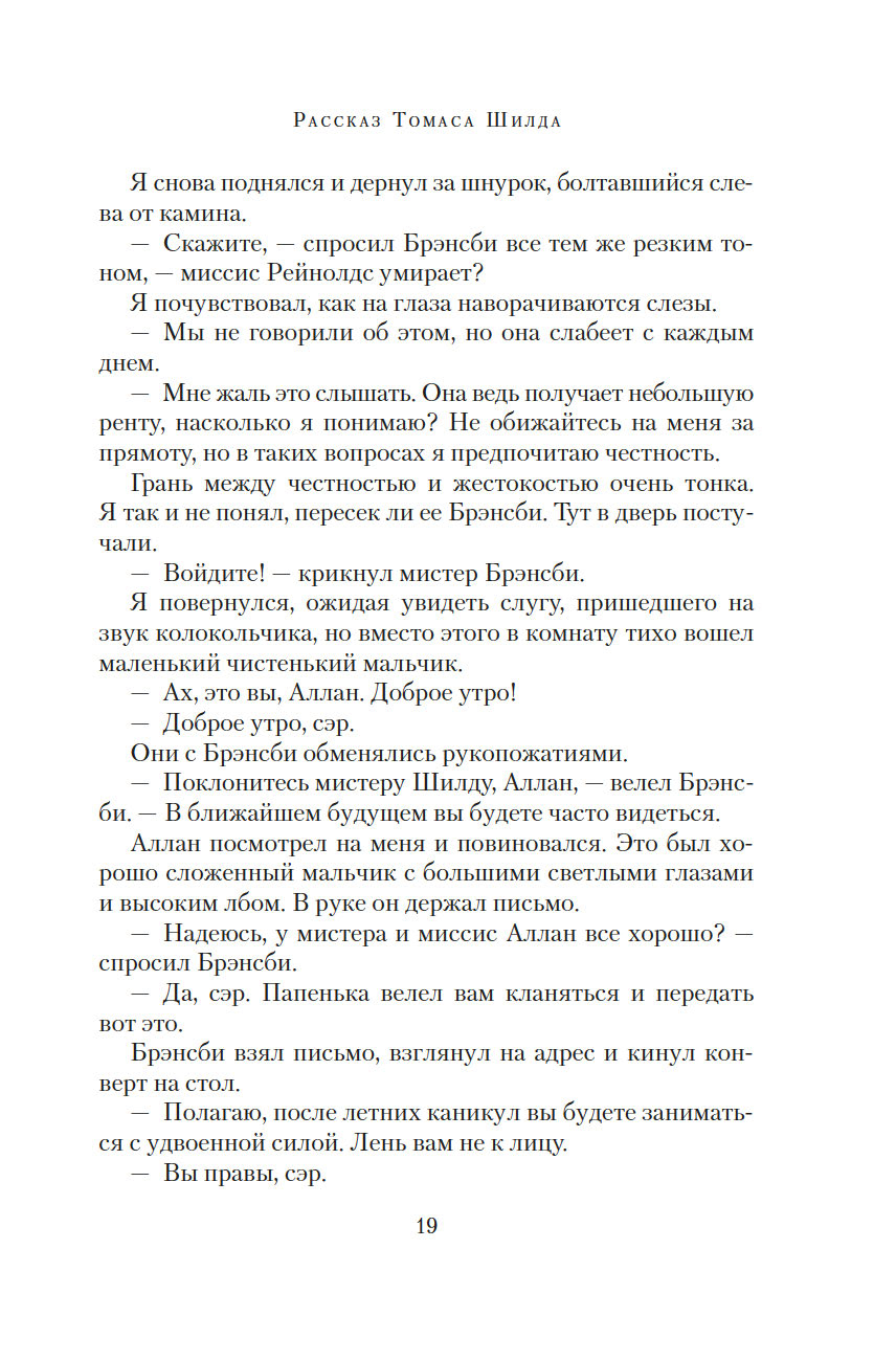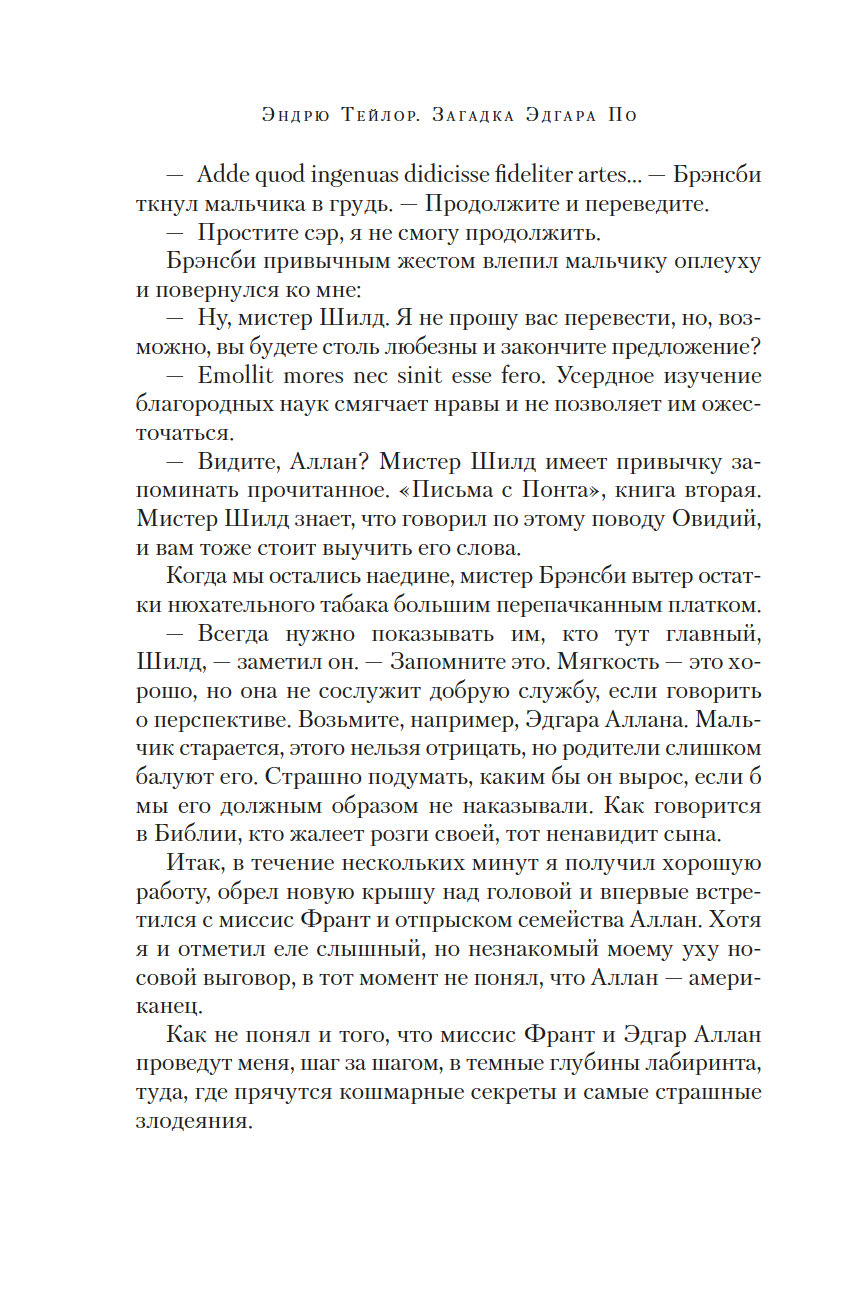 Англия времен Регентства, 1819 год. Вопреки отсутствию рекомендаций Томас Шилд получает место помощника учителя в пригороде Лондона. Среди его учеников – юный американец Эдгар По, приемный сын Алланов, и его лучший друг, избалованный неженка Чарльз Франт. Мальчики удивительно похожи друг на друга... Томас влюбляется в красивую, но не слишком счастливую мать Чарльза и постепенно увязает в паутине чужих семейных тайн и интриг. Когда на задворках столицы находят обезображенный труп, все улики указывают на семью Франт. Поневоле втянутый в эту запутанную историю, Шилд понимает, что у него более чем достаточно причин для беспокойства. А вскоре выясняется, что в центре этих жутких событий фигурирует маленький американец...