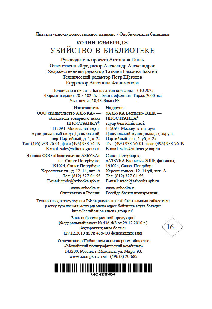 | Изготовитель | ООО "Издательство "Иностранка". 109017, РФ, г. Москва, ул. Пятницкая, 41 |