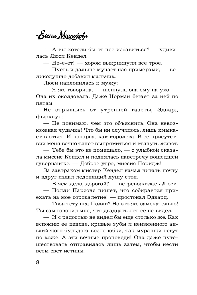 Благопристойные английские поместья напоминают глубокие озера с тёмной водой. Что скрывается там, за невозмутимой гладью? Твёрдое надёжное дно или коварные омуты, мелкие безобидные рыбёшки или страшные зубастые чудовища? Твёрдость духа, незыблемые принципы и типично английское чувство юмора помогают Эмме Норидж блестяще разрешать загадки, которые подбрасывает ей жизнь. Берегитесь, господа – гувернантка выведет вас на чистую воду!