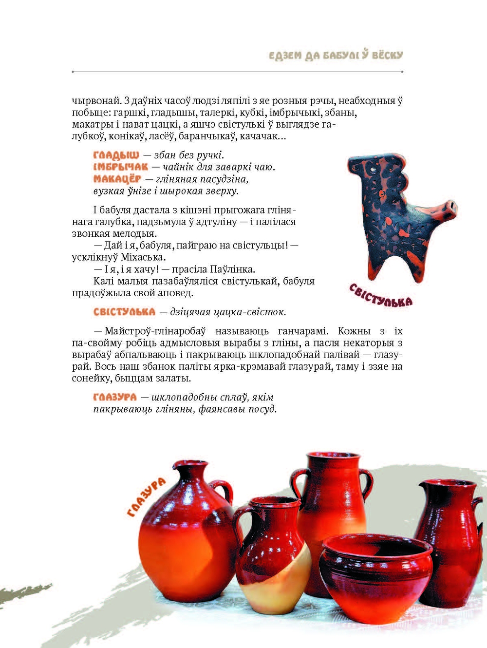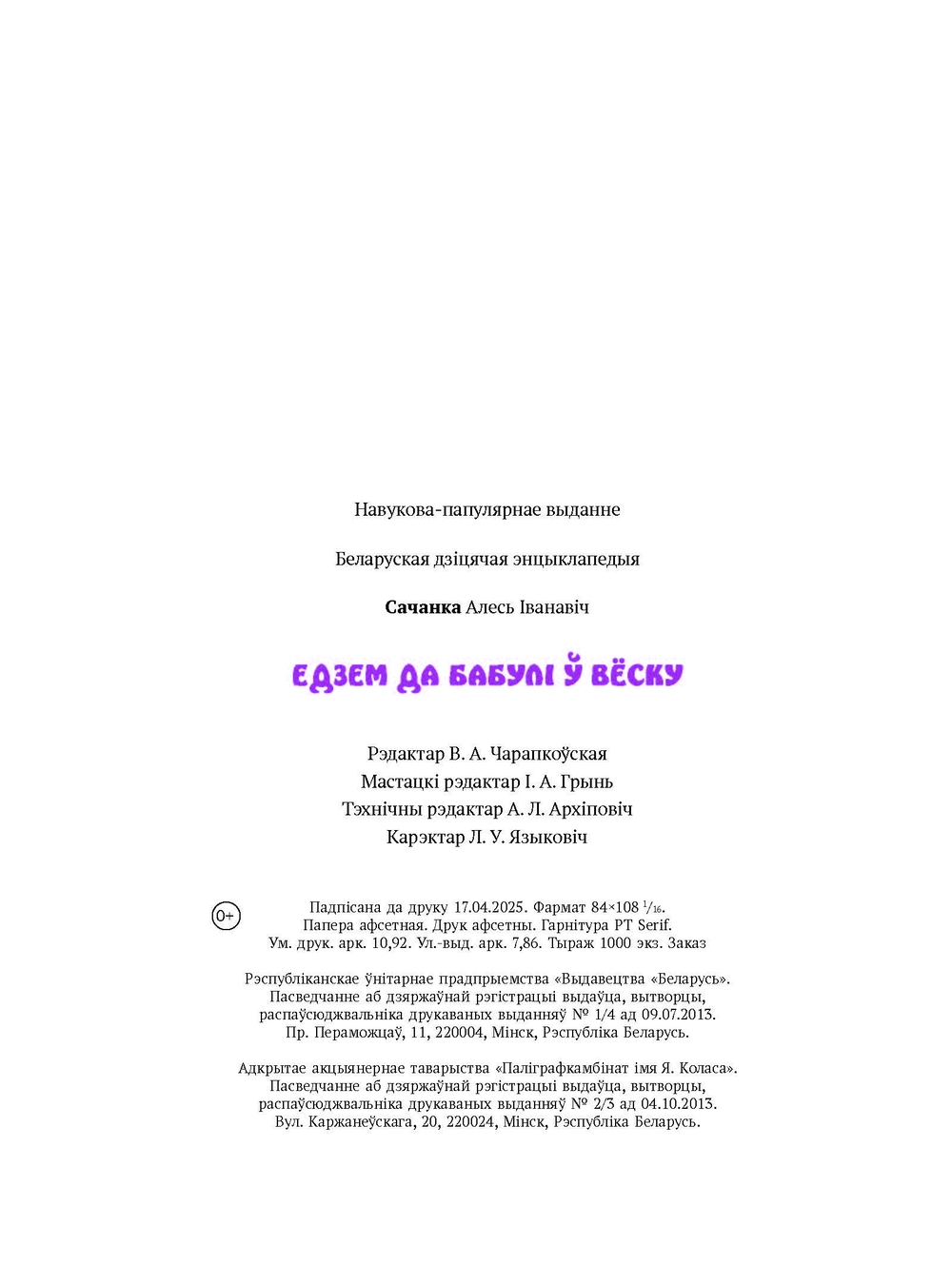 У кнізе "Едзем да бабулі ў вёску" ў апавядальнай форме падаецца інфармацыя аб асаблівасцях жыцця беларусаў у вёсцы ў мінулым. Разам з героямі кнігі дзяўчынкай Паўлінкай і хлопчыкам Міхаськам чытач даведаецца аб традыцыйных занятках сялян, іх абрадах, прыладах працы, побыце, прадметах дэкаратыўна-прыкладнога мастацтва, раслінах і жывёлах, нацыянальных стравах, святах. Выданне дапоўнена цікавымі пытаннямі і заданнямі, творамі мастацкай літаратуры, каляровымі ілюстрацыямі, значэнне незнаёмых слоў больш падрабязна раскрыта ў тлумачальным слоўніку.